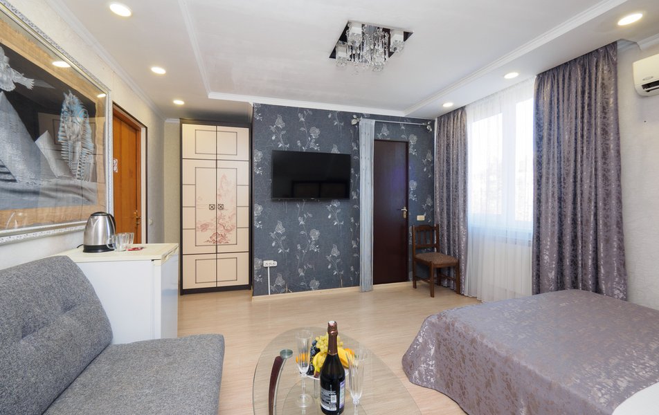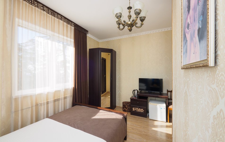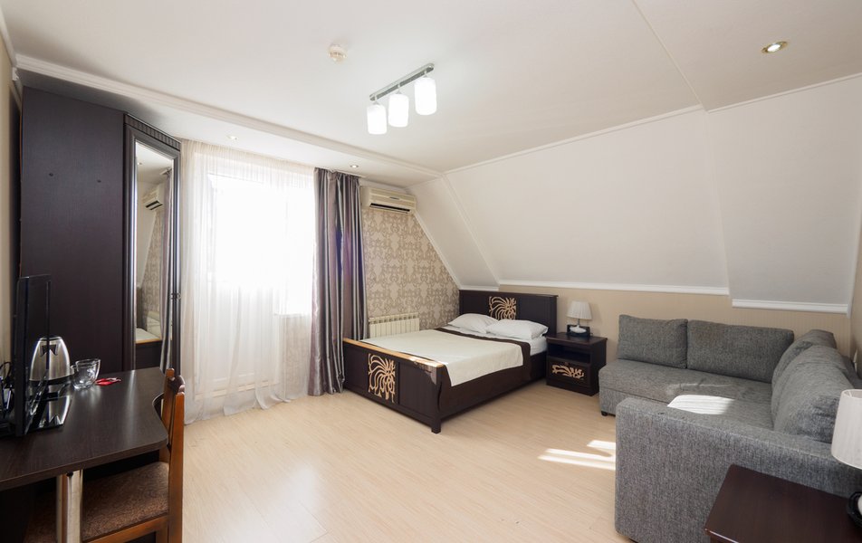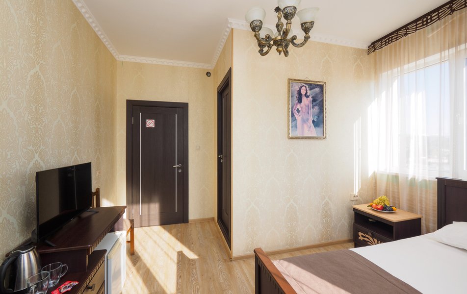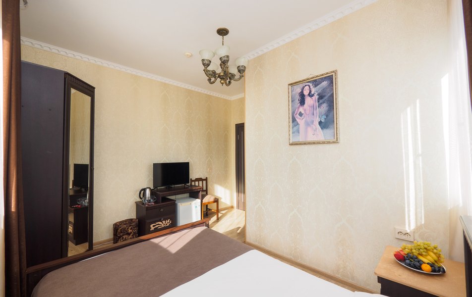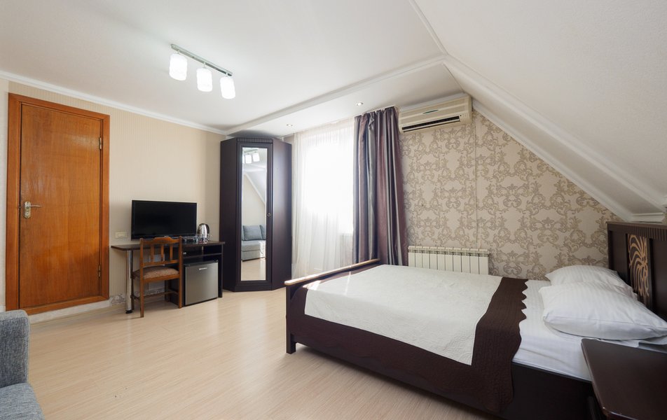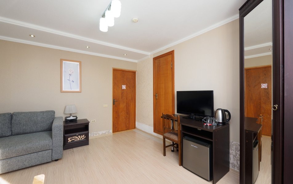 Стандартный 2-местный (без балкона + доп. место) Количество комнат: 1-комнатный Тип номера: Стандартный Дополнительное место: диван Кол-во доп. мест: 1 Кол-во номеров: 2 Кол-во основных мест: 2 Площадь (кв. м): 19 Мебель: диван, зеркало, кровать двуспальная, прикроватные тумбочки, стул, шкаф Оборудование: кондиционер, телевизор ЖК, холодильник, чайный набор посуды, электрочайник Санузел: с душем, туалетные принадлежности, фен Сервис: Wi-Fi бесплатно, смена полотенец, смена постельного белья, уборка номера