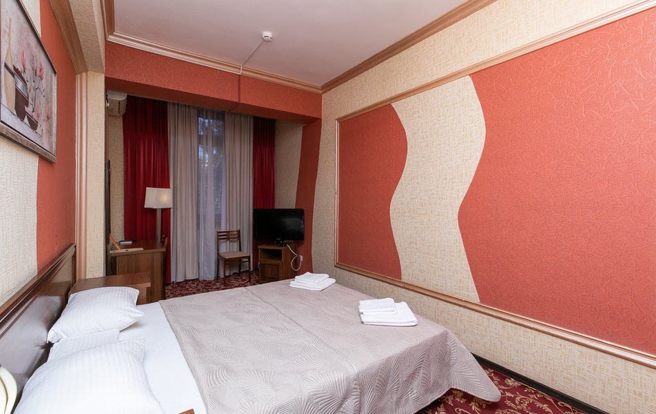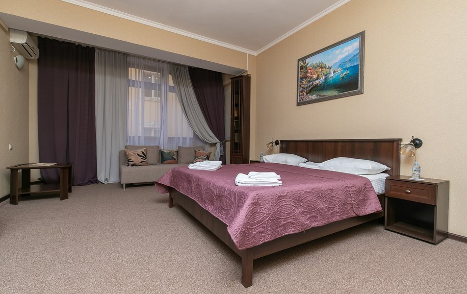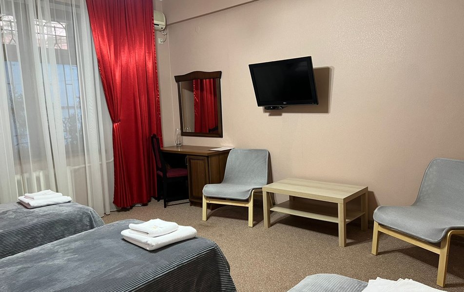 Отель находится в удобном расположении в 5 минутах от моря. Нам попался номер на 7 этаже. К отелю нужно подниматься по лестнице, что вызывает не удобства тащить свой тяжёлый чемодан, а если с коляской то совсем не удобно. Сам номер не плохой, 2 местный с 2 отдельными кроватями. В номере 2 кровати, маленький телевизор, столик и диван, холодильник без морозильной камеры в номере 74. На 2 м этаже распалагается гладильная комната с микроволновкой. Огромным большим минусом является однообразные не вкусные завтраки. Мы проживали 4 дня из них на завтрак всегда или каша или омлет, яишница и ужасно не вкусная шарлотка, где яблоки только в названии (сухая, не вкусная, яблок вообще нет, а это юг, который кишит фруктами и ягодами). Бонально можно разнообразить завтраки блинчиками, макаронами с сосисками, круассаны, тосты, сырники или что то ещё.