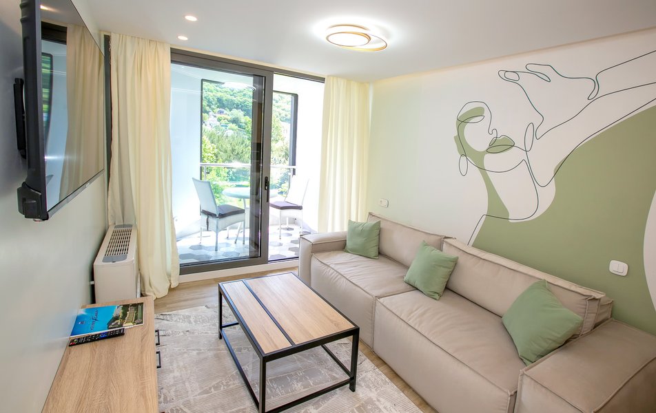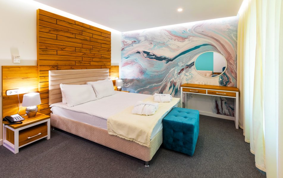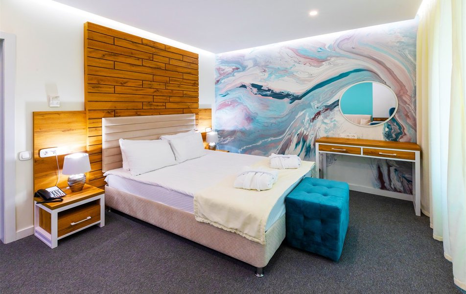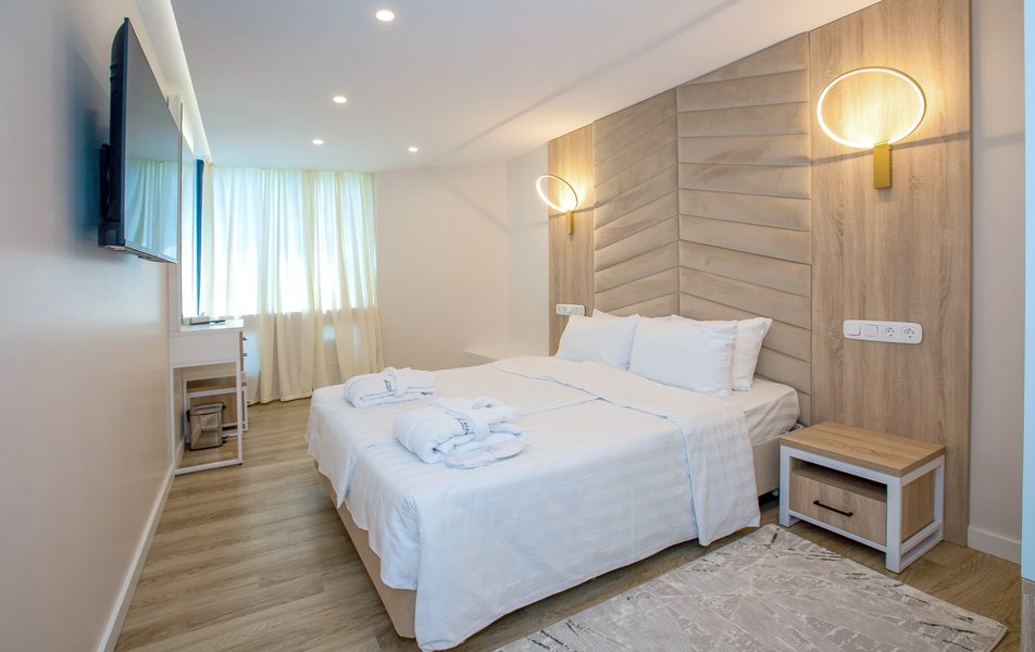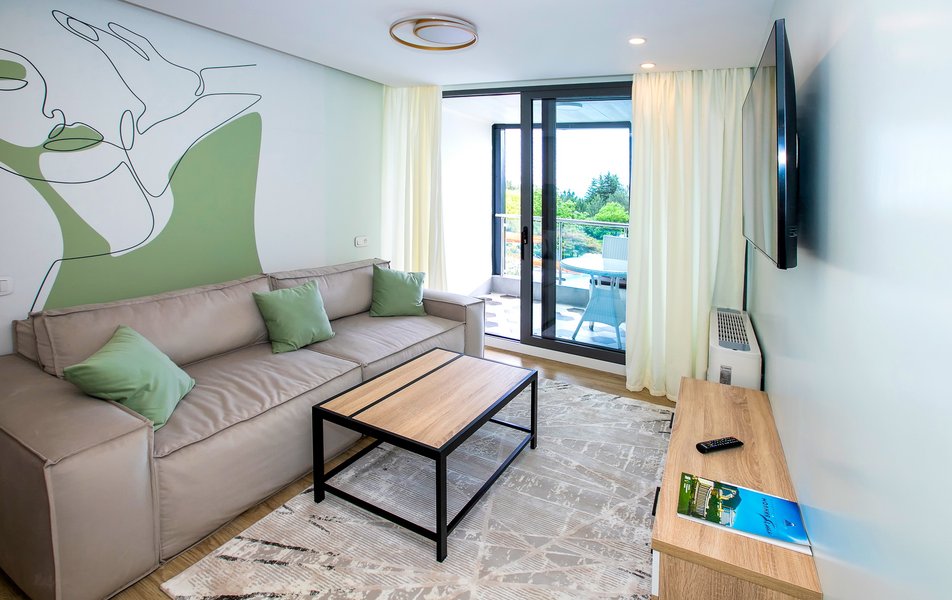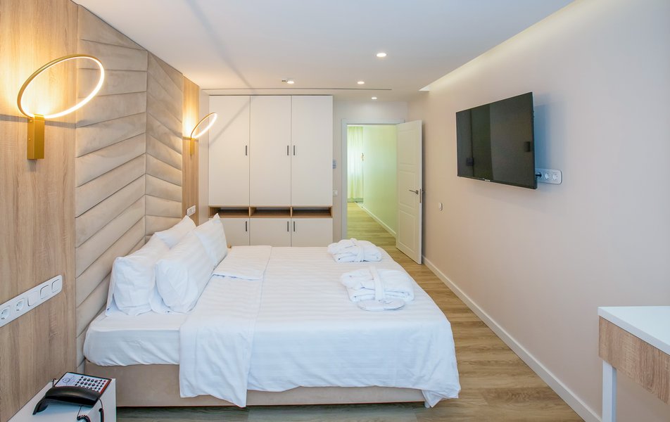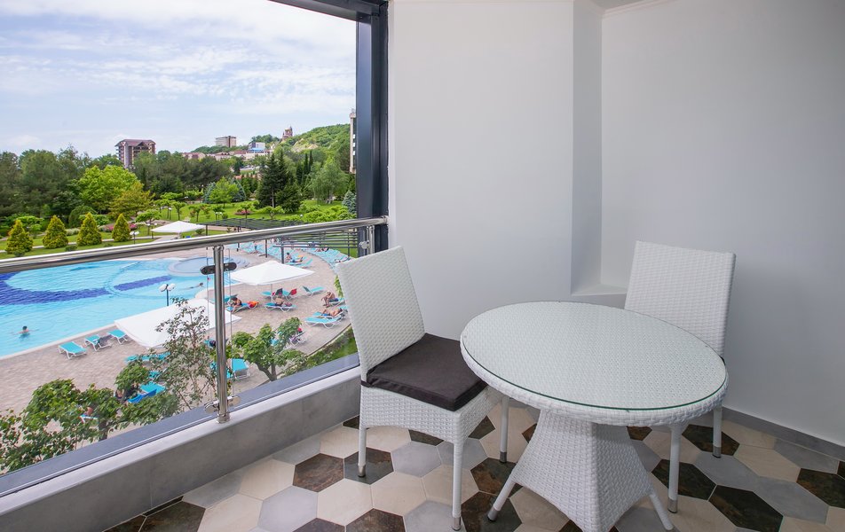 Апартаменты 2-местный 2-комнатный Количество комнат: 2-комнатный Тип номера: Апартаменты Дополнительное место: раскладной диван Вид из номера: на бассейн: и парк Кол-во доп. мест: 2 (1 взрослое/1 детское или 2 детских 0-14 лет) Кол-во основных мест: 2 Корпус: Молния Площадь (кв. м): 58 Балкон: с мебелью Мебель: вешалка, диван раскладной, зеркало, кресло, кровать двуспальная, кухонная мебель, прикроватные тумбочки, стол, столик журнальный, стулья, тумба, шкаф Оборудование: микроволновая печь, набор посуды, плита электрическая, сейф, сплит-система, телевизор, телефон, холодильник, чайная станция Санузел: с ванной, с душем, тапочки, туалетные принадлежности, фен, халат Сервис: Wi-Fi бесплатно, мини-бар, смена полотенец, смена постельного белья, уборка номера, услуги международной телефонной связи