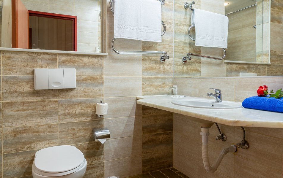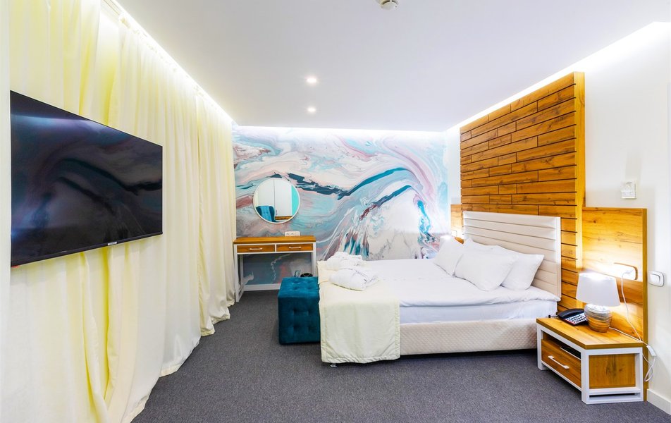 Люкс 2-местный 2-комнатный Количество комнат: 2-комнатный Тип номера: Люкс Дополнительное место: диван Кол-во доп. мест: 1 Кол-во основных мест: 2 Корпус: Молния Площадь (кв. м): 57 Мебель: вешалка, диван, зеркало, кресло, кровать двуспальная, прикроватные тумбочки, столик журнальный, столик туалетный, тумба под телевизор, шкаф Оборудование: сейф, сплит-система, телевизор, телефон, чайная станция Санузел: с ванной, тапочки, туалетные принадлежности, фен, халат Сервис: Wi-Fi бесплатно, мини-бар, смена полотенец, смена постельного белья, уборка номера, услуги международной телефонной связи Терраса: оборудована мебелью