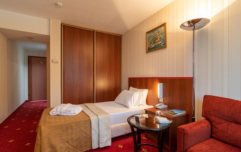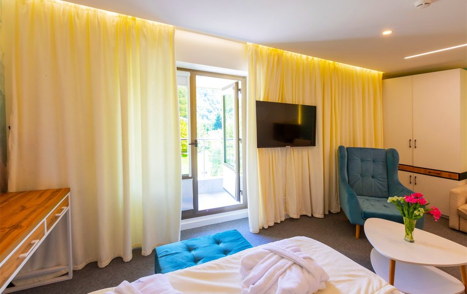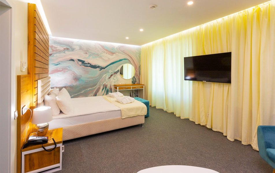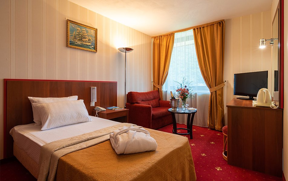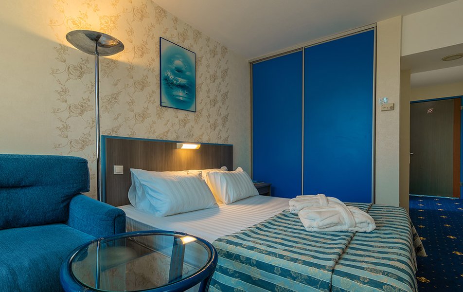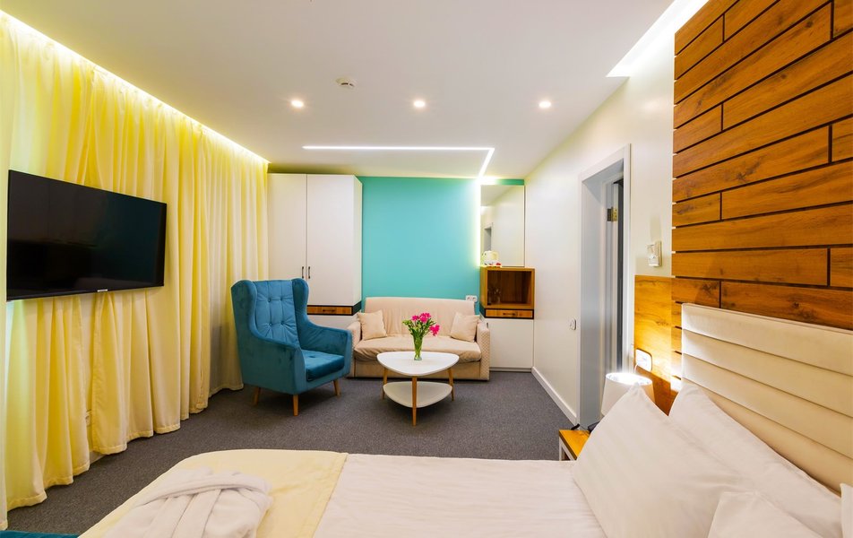 Джуниор Сюит 2-местный Количество комнат: 1-комнатный Тип номера: Джуниор Сюит Дополнительное место: диван или кресло-кровать Кол-во доп. мест: 1 Кол-во номеров: 24 Кол-во основных мест: 2 Корпус: Молния Площадь (кв. м): 35 Балкон: с мебелью Мебель: вешалка, зеркало, кресло, кресло-кровать: или диван, кровать двуспальная, прикроватные тумбочки, столик журнальный, шкаф Оборудование: гладильная доска, сплит-система, телевизор, телефон, утюг, чайная станция Санузел: с ванной, тапочки, туалетные принадлежности, фен, халат Сервис: Wi-Fi бесплатно, мини-бар, смена полотенец, смена постельного белья, уборка номера, услуги международной телефонной связи