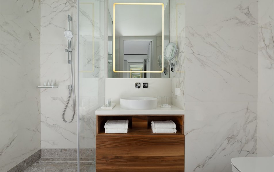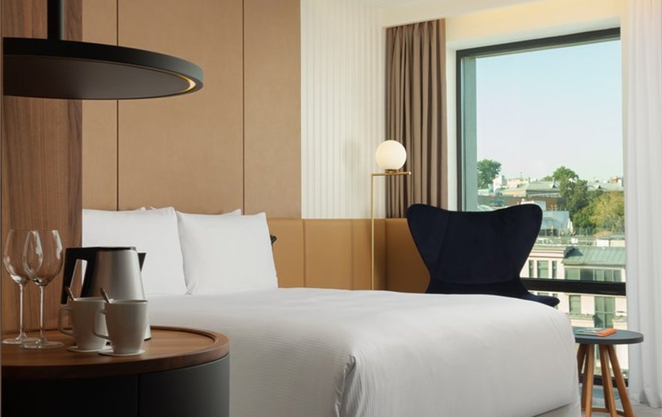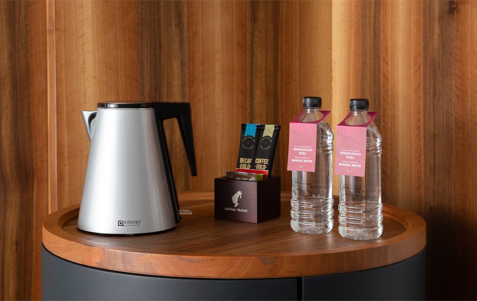 Делюкс 2-местный 1-комнатный (DBL) Количество комнат: 1-комнатный Тип номера: Делюкс Вид из номера: на город Кол-во основных мест: 2 Площадь (кв. м): 23 Мебель: вешалка, зеркало, кровать двуспальная, стол, стул, тумба, шкаф Оборудование: кондиционер, сейф, телевизор, телефон, утюг, электрочайник Санузел: с душем, тапочки, туалетные принадлежности, фен, халат Сервис: Wi-Fi бесплатно, смена полотенец, смена постельного белья, уборка номера