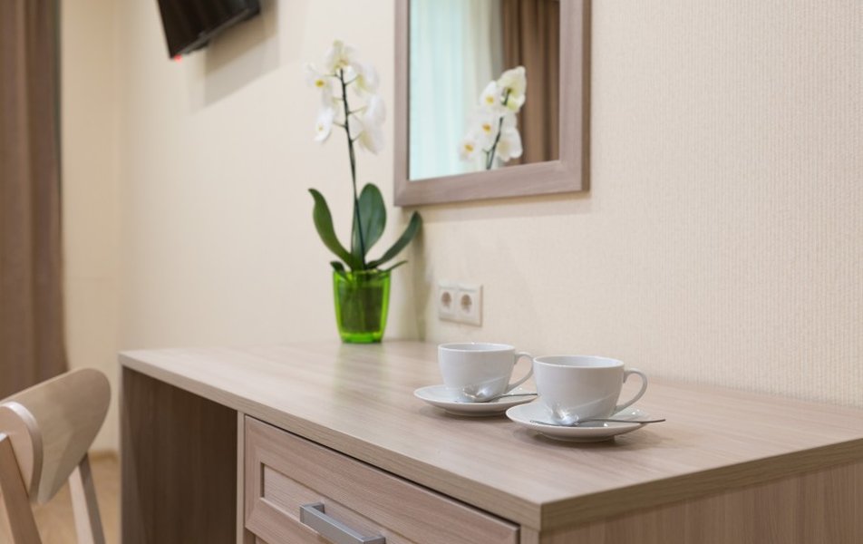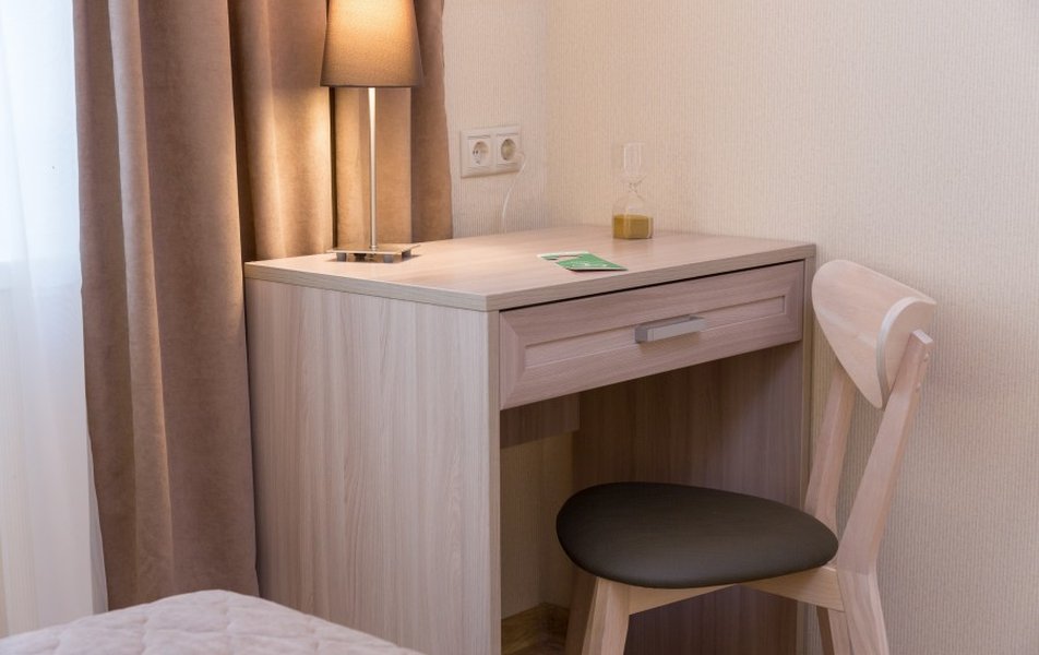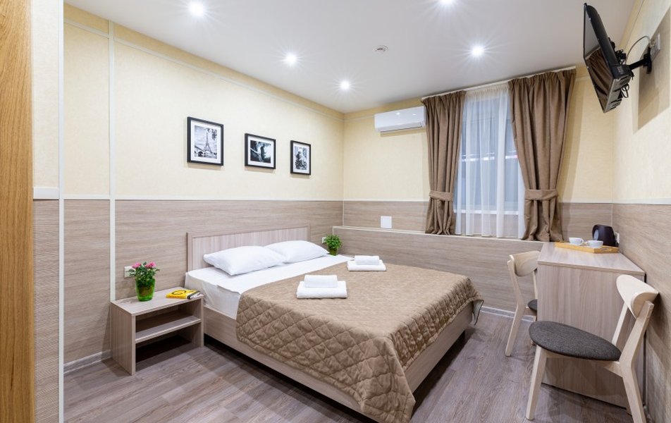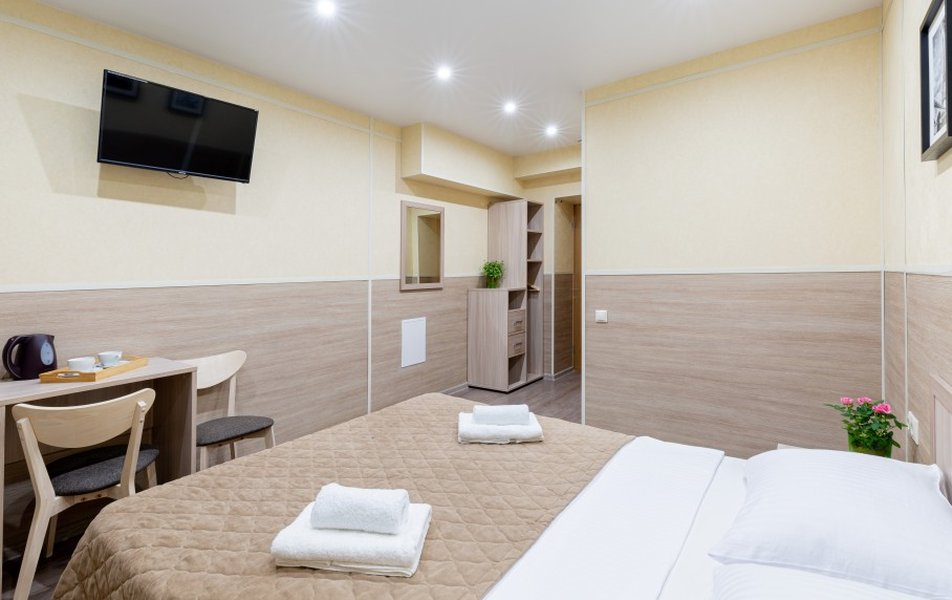Комфорт 2-местный Количество комнат: 1-комнатный Тип номера: Комфорт Кол-во основных мест: 2 Площадь (кв. м): 15 Мебель: вешалка, зеркало, кровать двуспальная, прикроватные тумбочки, стол, стулья, шкаф Оборудование: кондиционер, мини-холодильник, телевизор, чайник Санузел: с душем, фен, халат Сервис: Wi-Fi бесплатно, смена полотенец, смена постельного белья, уборка номера