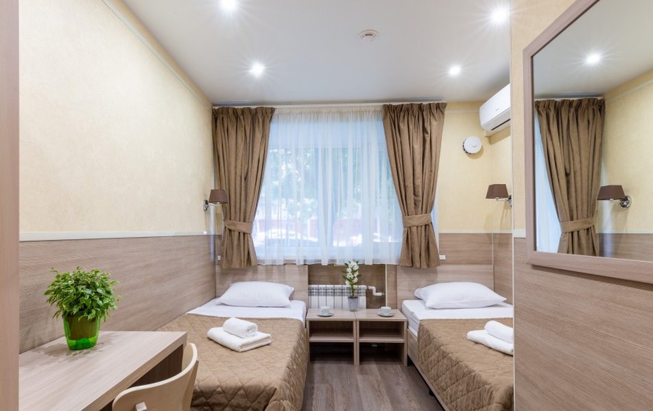 Стандартный 2-местный (2 раздельные кровати) Количество комнат: 1-комнатный Тип номера: Стандартный Кол-во основных мест: 2 Площадь (кв. м): 11 Мебель: вешалка, зеркало, кровати односпальные, прикроватные тумбочки, стол, стул, шкаф Оборудование: кондиционер, телевизор Санузел: с душем, фен Сервис: Wi-Fi бесплатно, смена полотенец, смена постельного белья, уборка номера