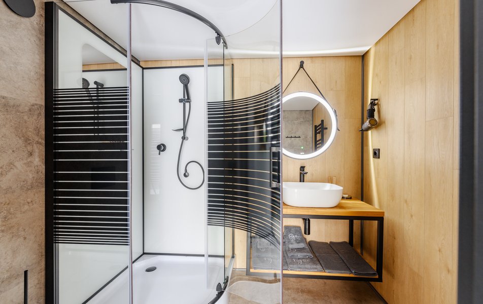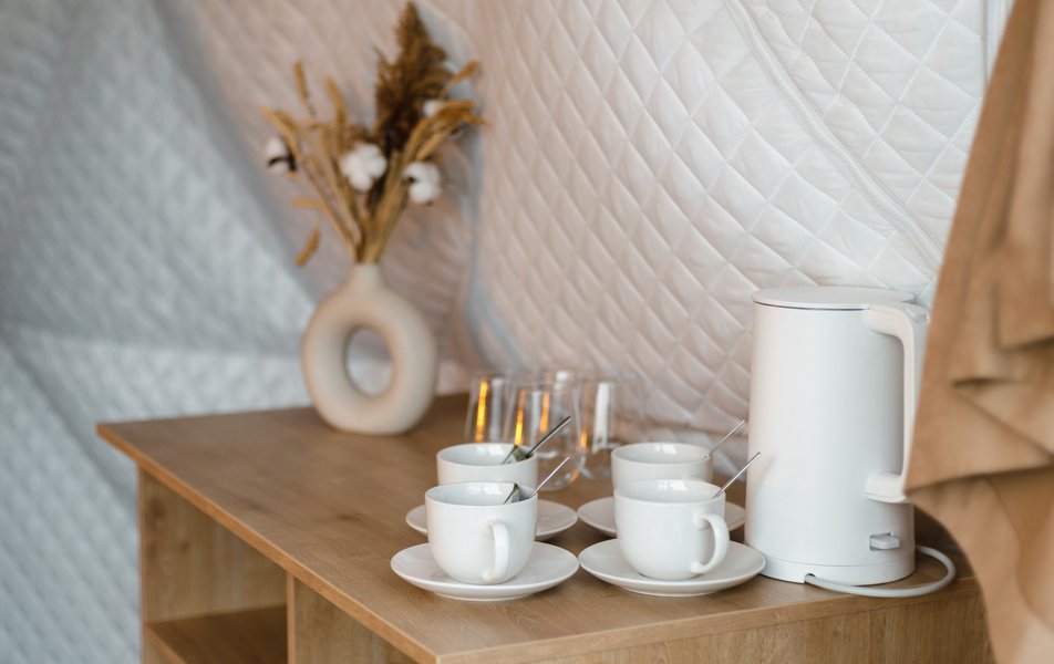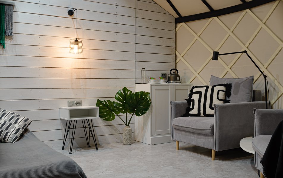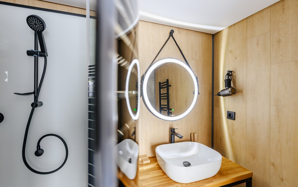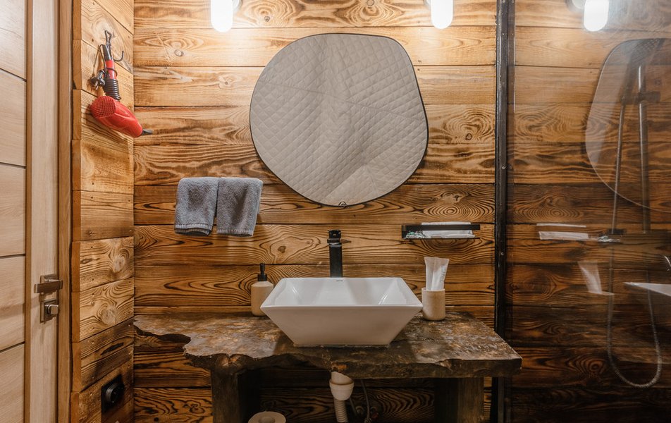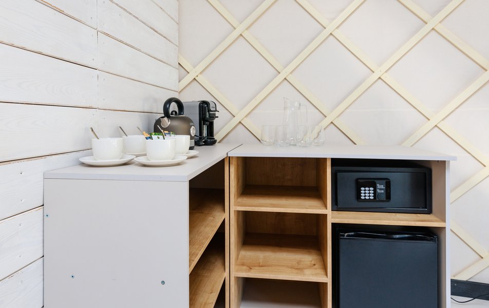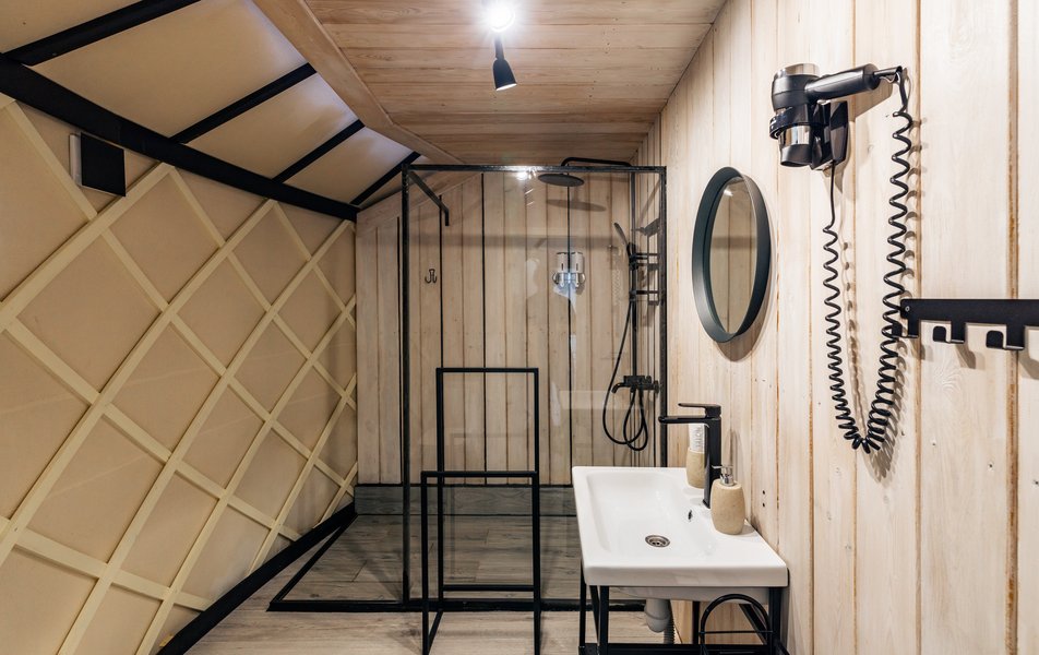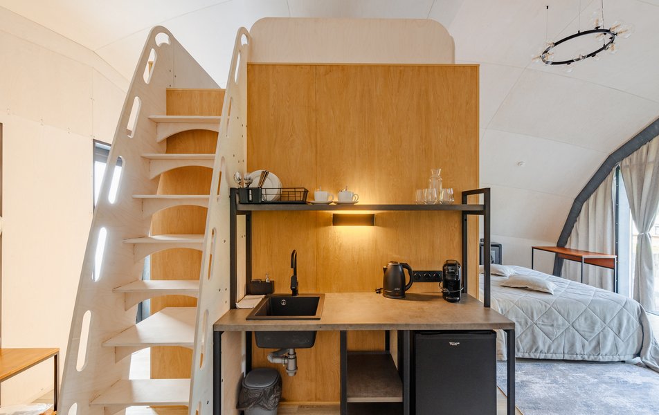 Тепло, уютно, стильно. В красивом уединенном месте. Дети были рады кроватям на втором ярусе( отличное решение) . В номере есть всё необходимое , кофемашина с капсулами, чайник и чайный набор, столовые приборы, в ванной гель/шампунь/ лосьон для тела.