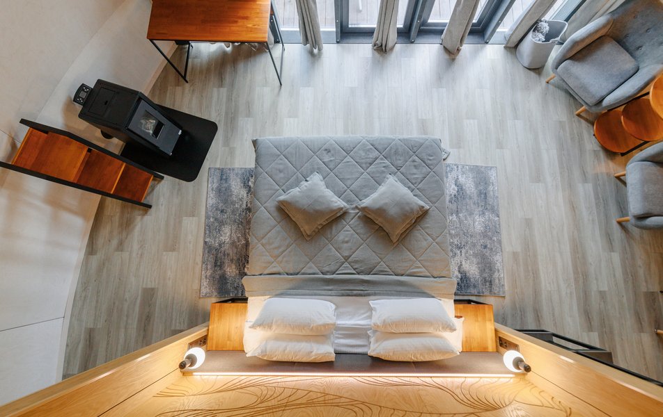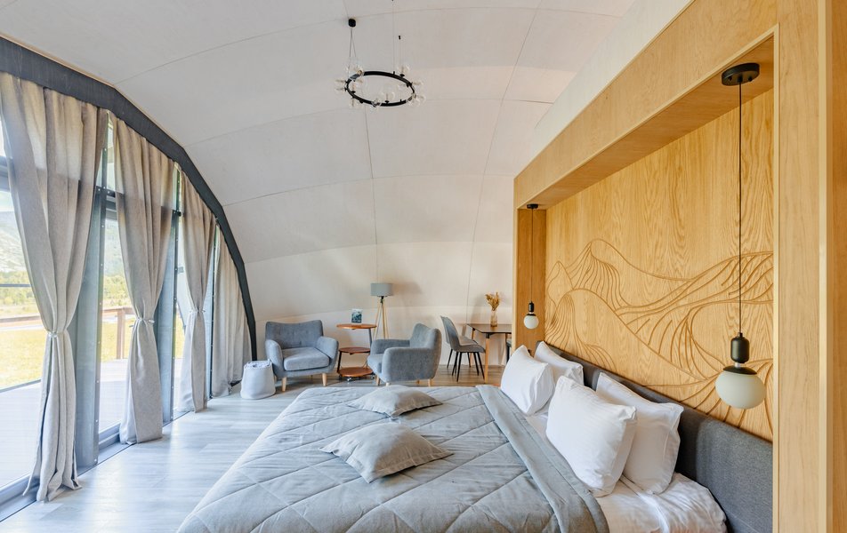 Отдыхали с 1 по 6 августа 2025 в номере space lux. Плюсы: - Отличная концепция отеля и дизайн номеров. В нашем было много места, хорошо сделано разбиение по зонам. Можно было посидеть на террасе или, если дождь, у открытой двери, укрывшись пледом. Есть рабочий стол с лампой, пара уютных кресел и обеденный стол на 4 человек. Дети были в восторге от кровати над душевым блоком. - Шикарный вид на горы из панорамных окон - Атмосферный банный комплекс и spa - Отзывчивый персонал - Чат с администратором для решения любых вопросов Минусы: - Кухня не справляется с наплывом посетителей. Если вечером дождь и все сидят в отеле, то в 9 могут перестать принимать заказы. Мы один раз на такое попались и остались голодными, т.к. ехать до ближайшего кафе или магазина далековато. На завтраке при большом количестве человек ожидание заказа может быть до получаса. - Уборка номеров и территории. Заявлена ежедневная уборка номеров. Но её сам никто не делает. Нужно просить администратора. В начале августа на Алтае была тьма мотыльков непарного шёлкопряда. Ими были заполнены все деревянные поверхности. Понимаю, что на столбах или воротах убирать не удобно, но подметать дорожки от их трупиков кажется не так сложно. - Отсутствие микроволновки или плиты на кухне в номере. Если заявлена кухня, то ожидаешь, что там будет техника для подогрева пищи. У нас был холодильник, чайник, кофеварка и шкаф для вина... Можно сделать заказ еды в номер без доплаты, но если приносят холодные блюда, то погреть только в кафе. Есть конечно навороченный гриль на углях, но не греть же еду на нём. Очень странное решение. - Были проблемы с качеством сигнала wifi. В целом за немалые деньги сервис стоило бы подтянуть.