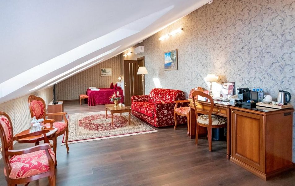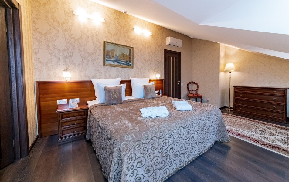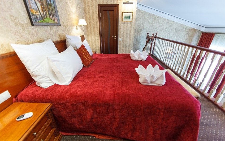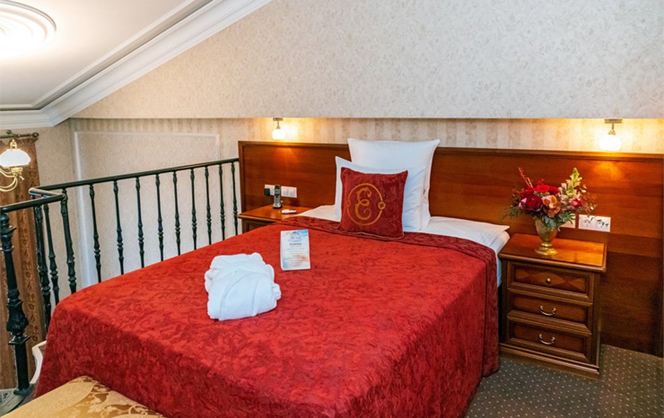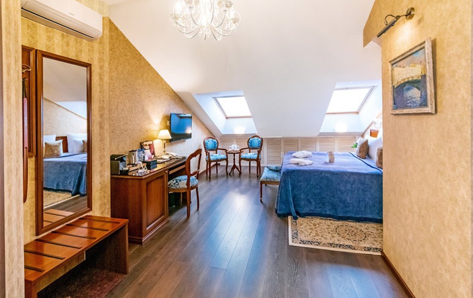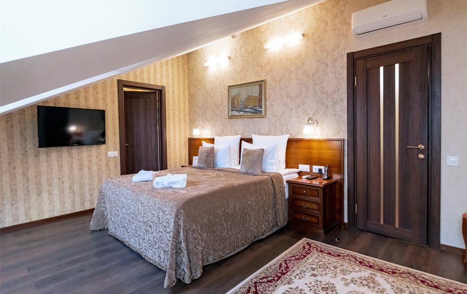 Делюкс 4-местный 2-комнатный (Мансарда) Количество комнат: 2-комнатный Тип номера: Делюкс Кол-во основных мест: 4 Площадь (кв. м): 45-53 Мебель: вешалка, зеркало, кровати односпальные /одна двуспальная кровать, прикроватные тумбочки, стол, стулья, тумба багажная, шкаф Оборудование: кондиционер, кофемашина, мини-холодильник, сейф, телевизор ЖК, телефон, чайный набор посуды, электрочайник Санузел: с душем, тапочки, туалетные принадлежности, фен, халат Сервис: Wi-Fi бесплатно, смена полотенец, смена постельного белья, уборка номера, услуги внутренней телефонной связи