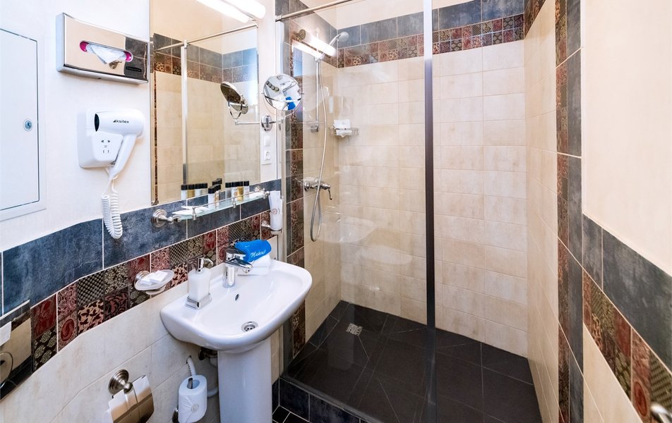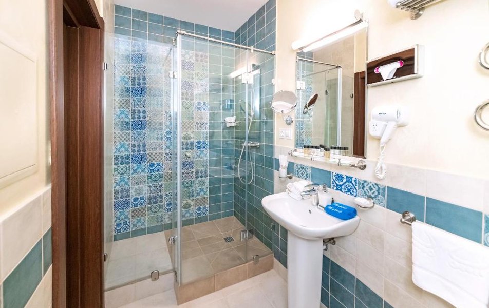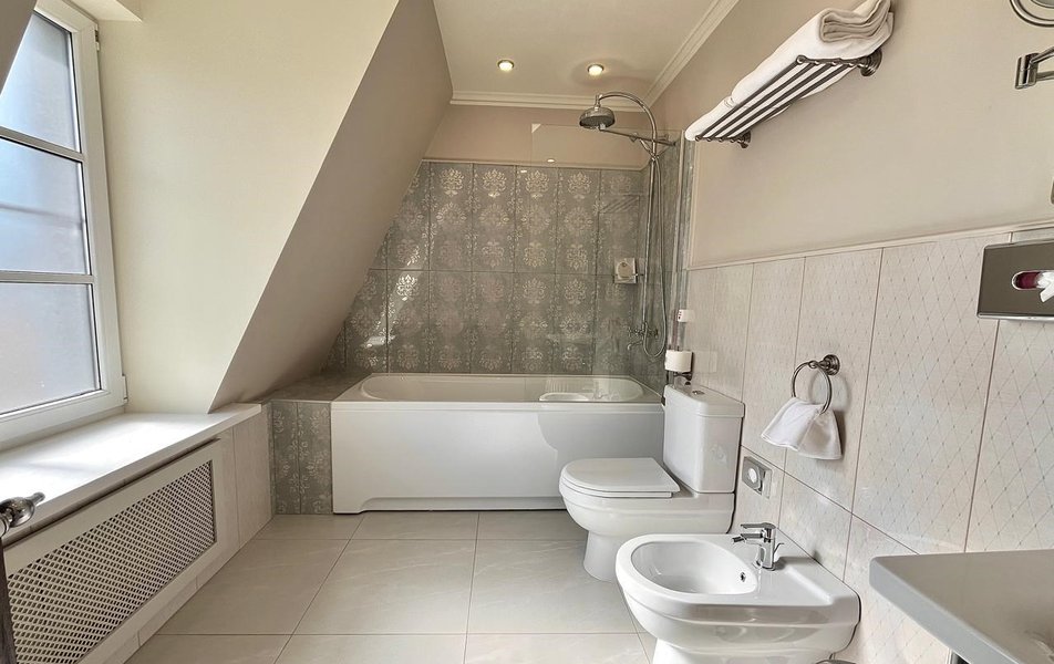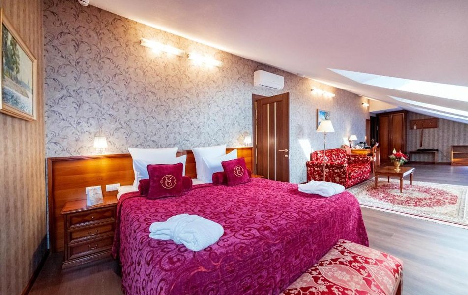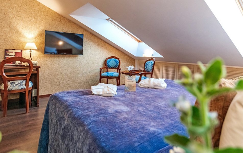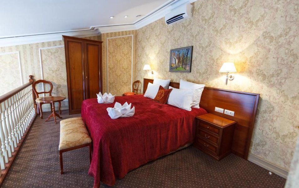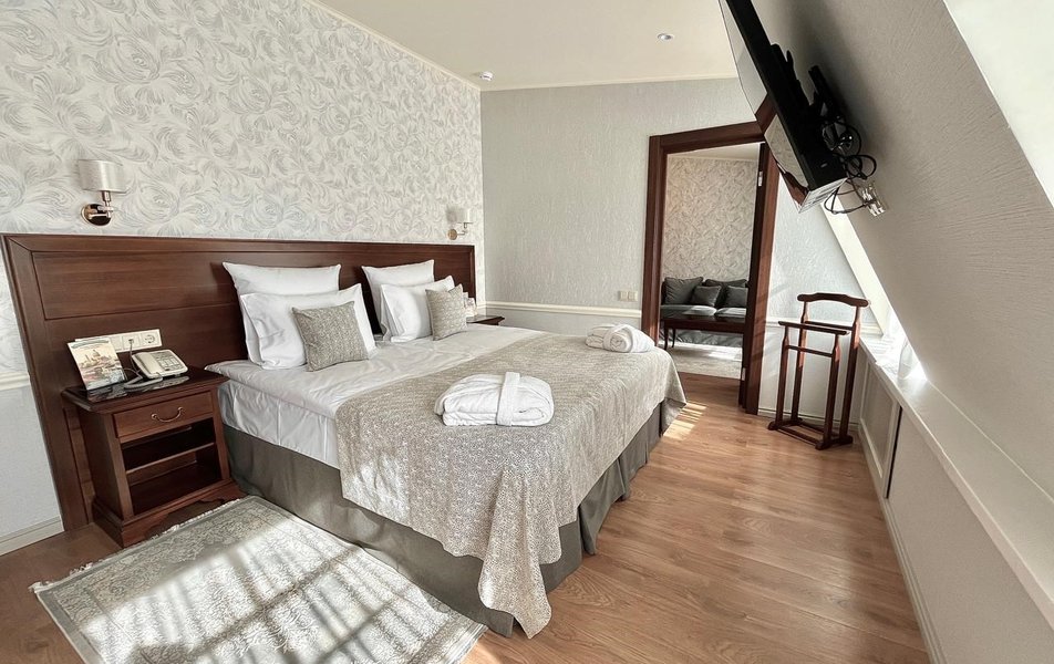 Делюкс 4-местный 2-комнатный (Мансарда) Количество комнат: 2-комнатный Тип номера: Делюкс Кол-во основных мест: 4 Площадь (кв. м): 45-53 Мебель: вешалка, зеркало, кровати односпальные /одна двуспальная кровать, прикроватные тумбочки, стол, стулья, тумба багажная, шкаф Оборудование: кондиционер, кофемашина, мини-холодильник, сейф, телевизор ЖК, телефон, чайный набор посуды, электрочайник Санузел: с душем, тапочки, туалетные принадлежности, фен, халат Сервис: Wi-Fi бесплатно, смена полотенец, смена постельного белья, уборка номера, услуги внутренней телефонной связи