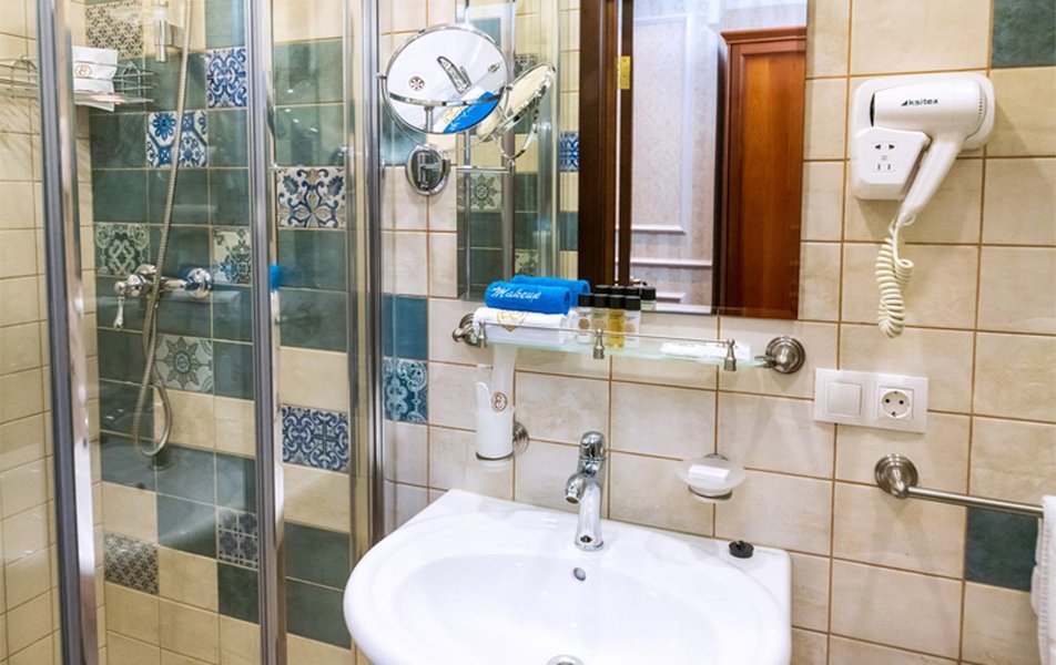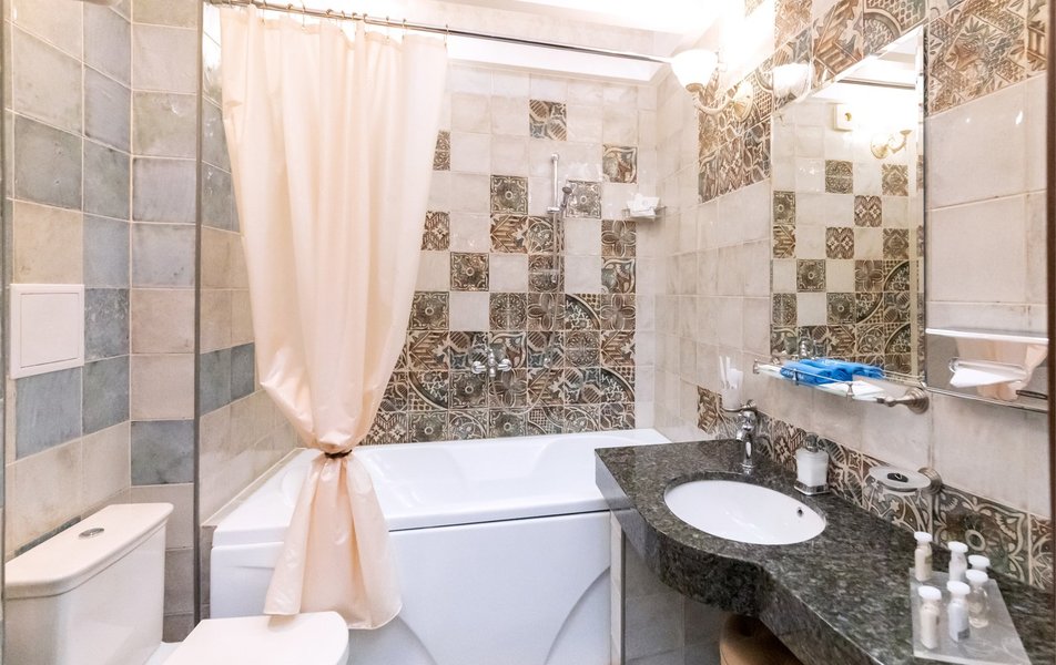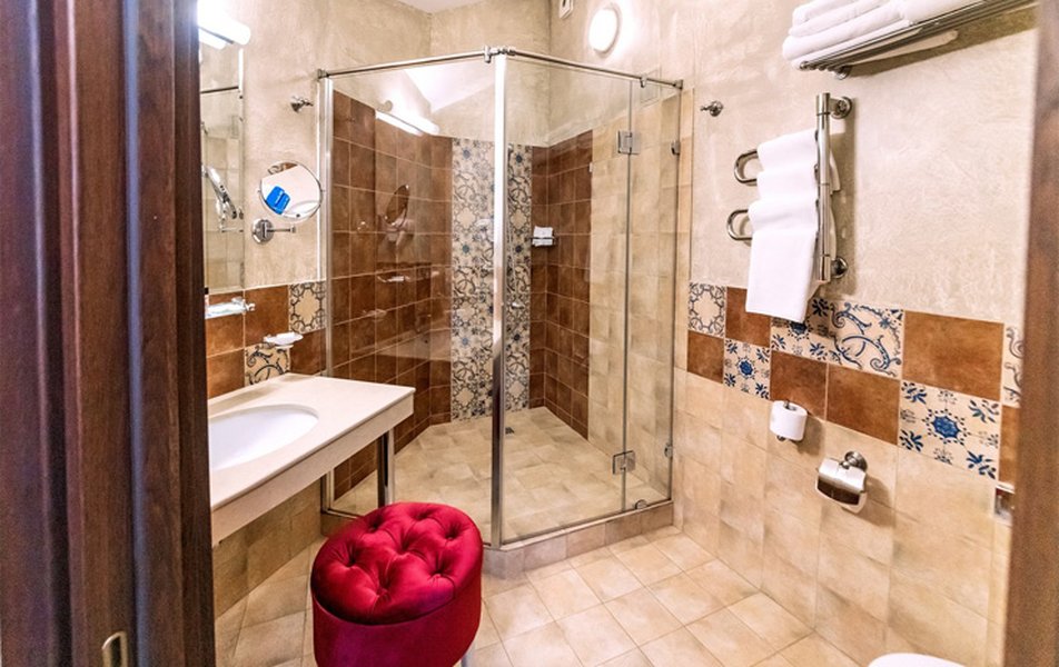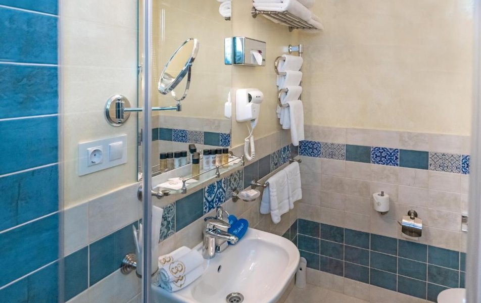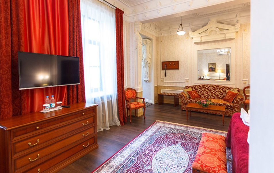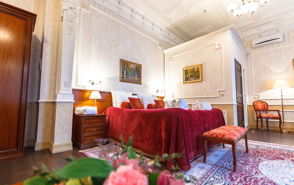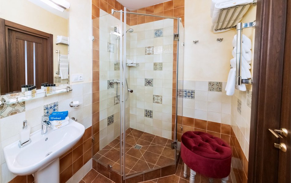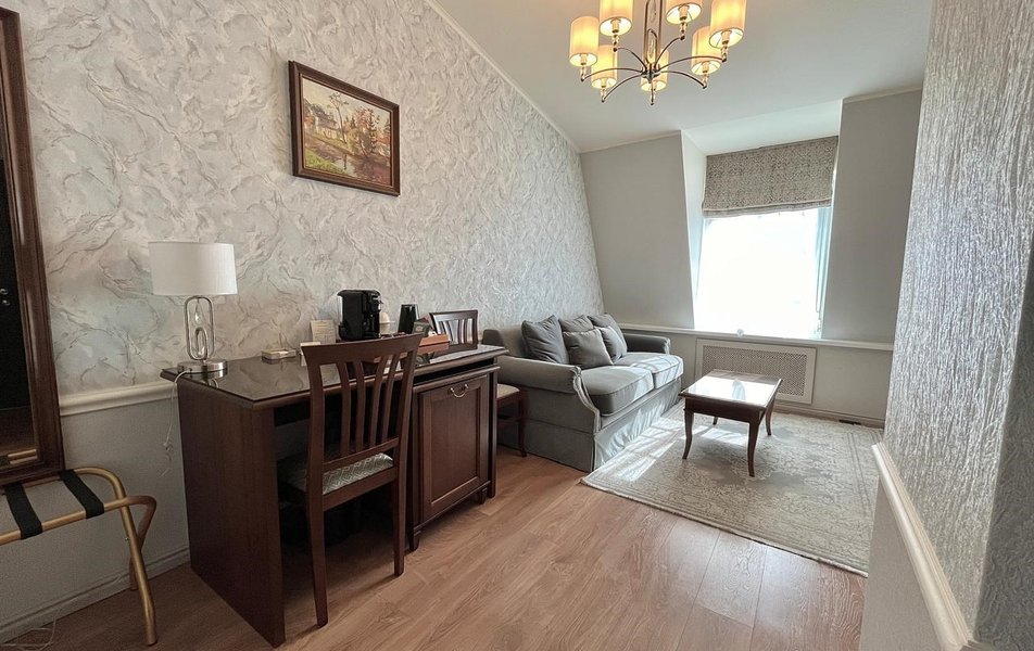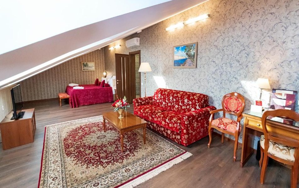 Делюкс 3-местный 1-комнатный (Гранд) Количество комнат: 1-комнатный Тип номера: Делюкс Вид из номера: на двор Кол-во основных мест: 3 Площадь (кв. м): 40 Мебель: диван раскладной, зеркало, комод, кресла, кровати односпальные /одна двуспальная кровать, прикроватные тумбочки, стол, стулья, шкаф Оборудование: кондиционер, кофемашина, мини-холодильник, сейф, телевизор, телефон, чайный набор посуды, электрочайник Санузел: с душем, тапочки, туалетные принадлежности, фен, халат Сервис: Wi-Fi бесплатно, room-сервис, карточная система замков, мини-бар, смена полотенец, смена постельного белья, уборка номера, услуги внутренней телефонной связи