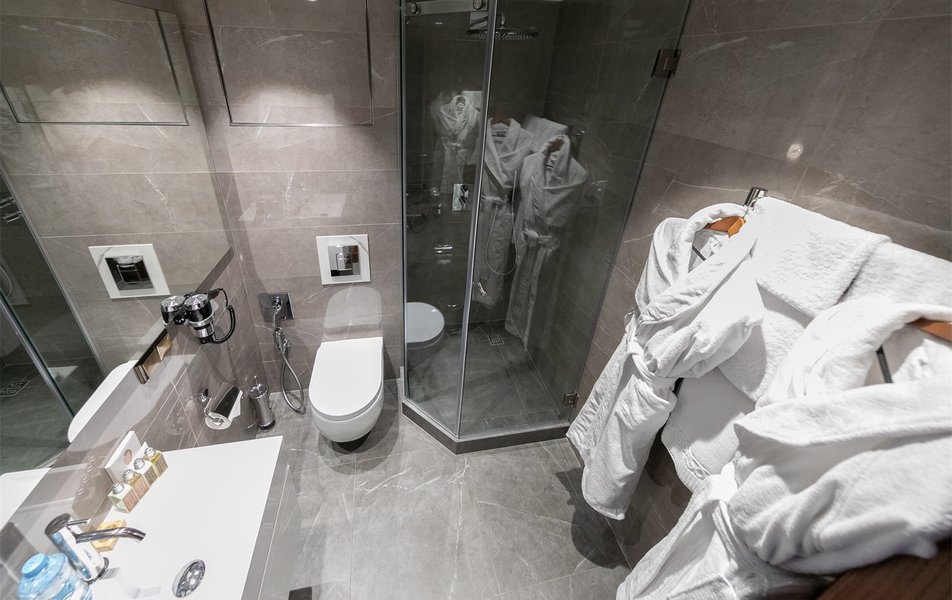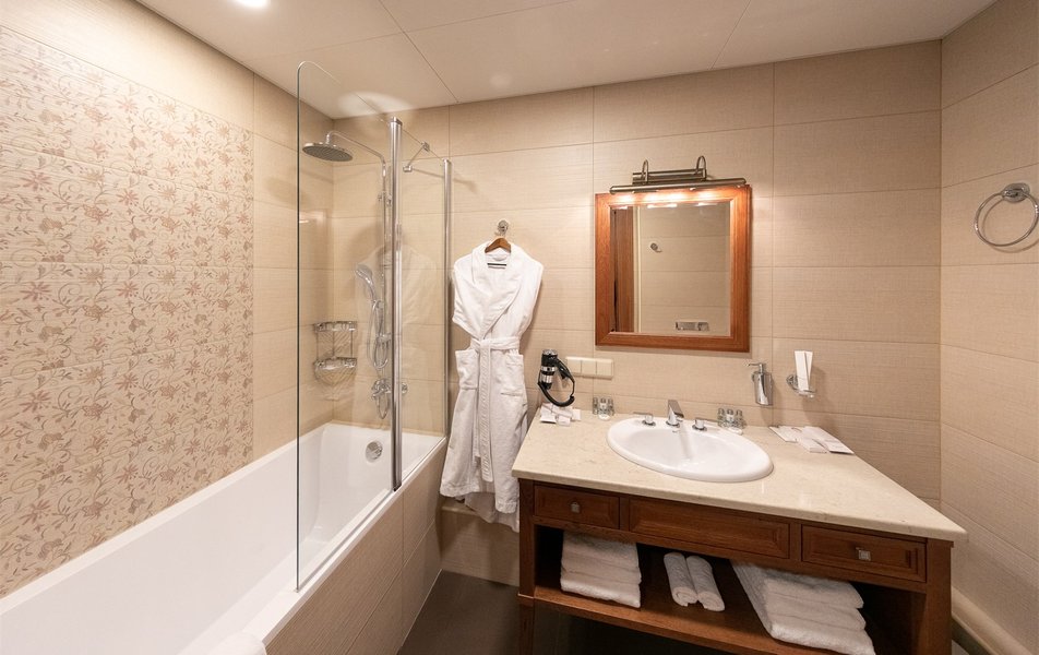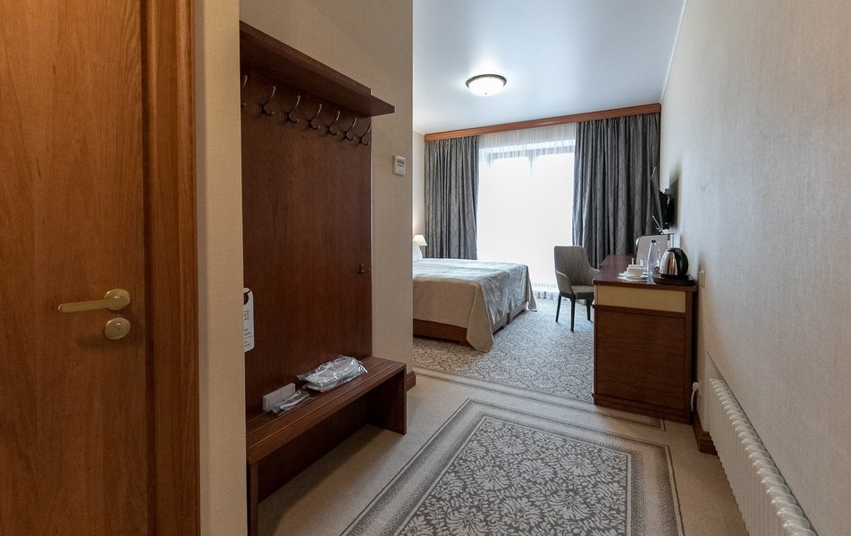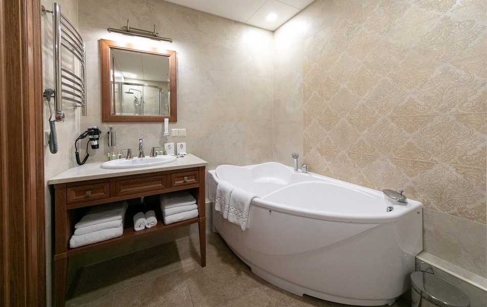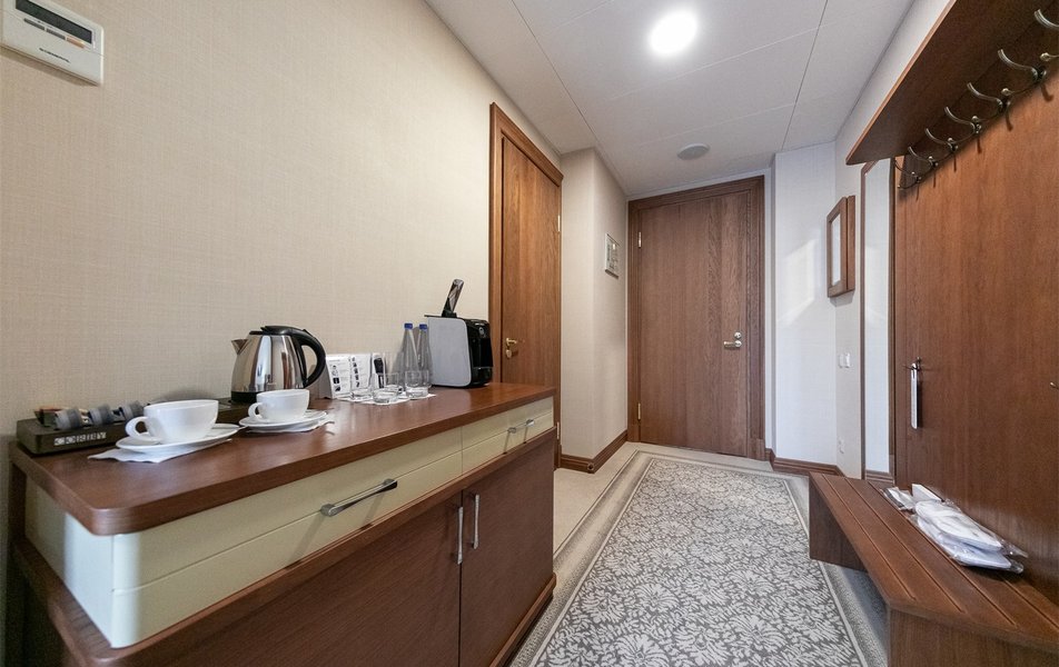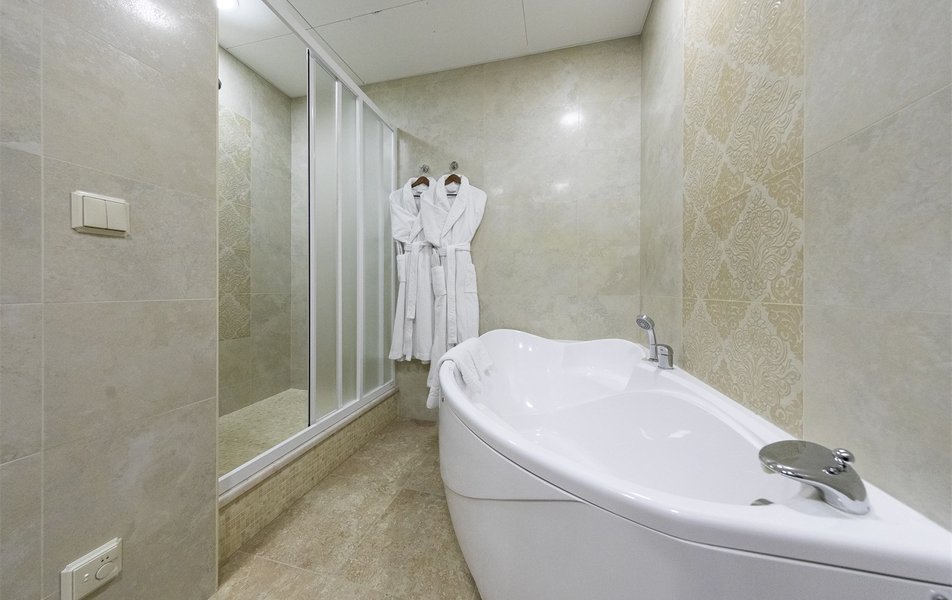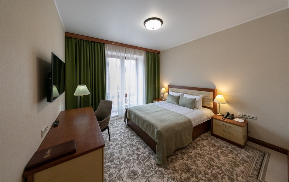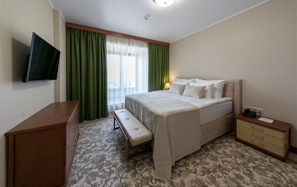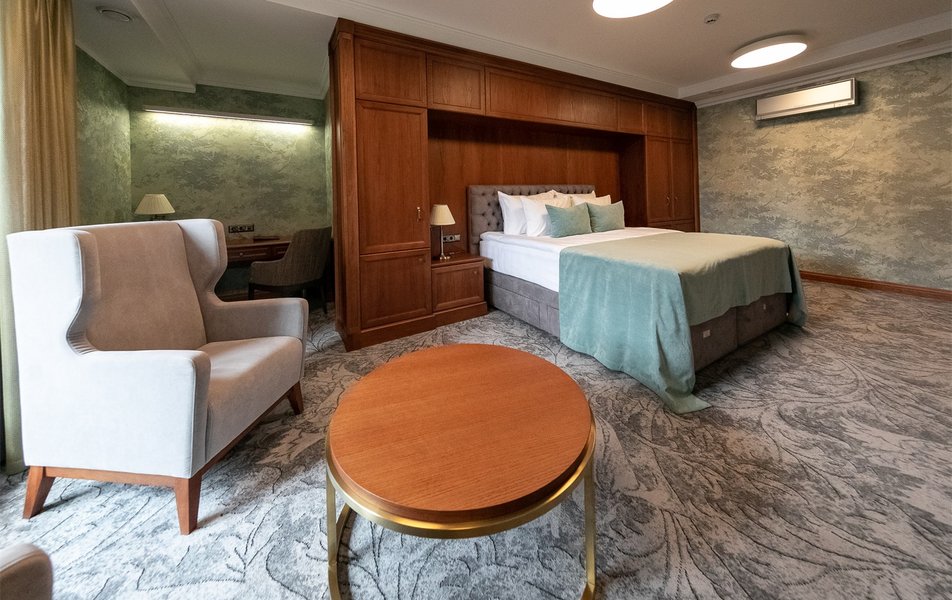 Люкс 2-местный 1-комнаный Супер Количество комнат: 2-комнатный Тип номера: Люкс Кол-во основных мест: 2 Площадь (кв. м): 82 Мебель: диван, зеркало, кровать двуспальная, прикроватные тумбочки, стол, стулья, шкаф Оборудование: кондиционер, кофемашина, мини-холодильник, сейф, телевизор, телефон, чайный набор посуды, электрочайник Санузел: с ванной, с душем, тапочки, туалетные принадлежности, фен, халат Сервис: Wi-Fi бесплатно, смена полотенец, смена постельного белья, уборка номера, услуги внутренней телефонной связи