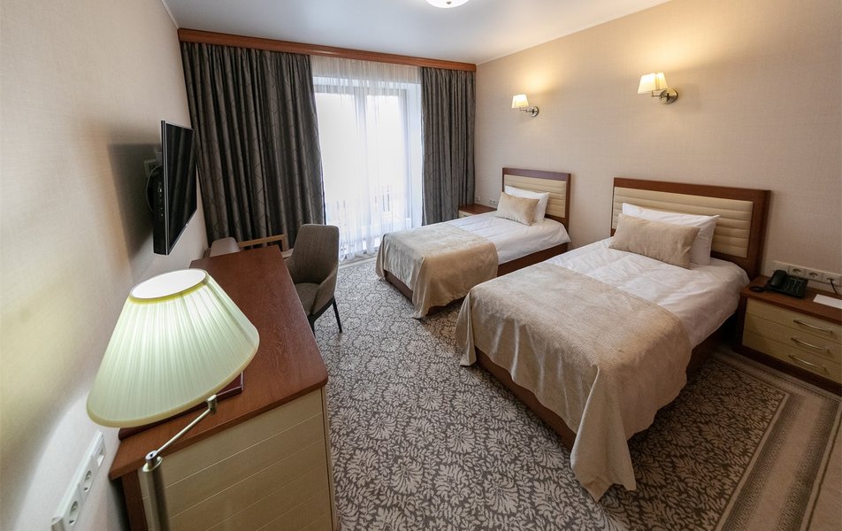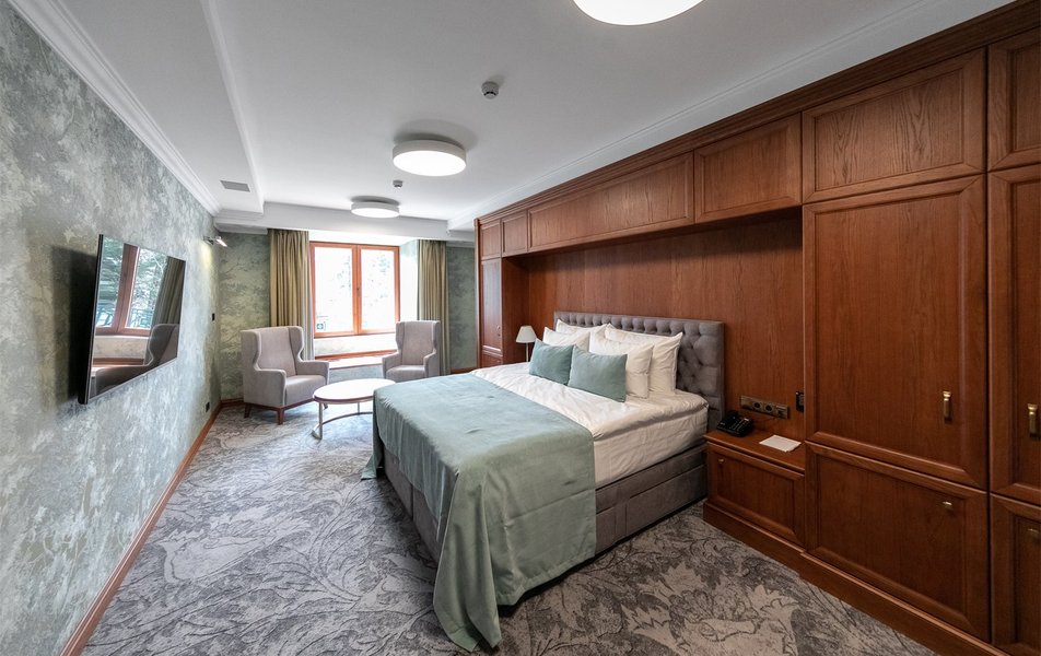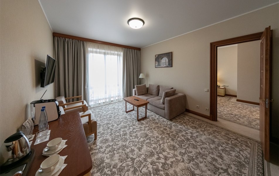 Люкс 2-местный 2-комантный Количество комнат: 2-комнатный Тип номера: Люкс Кол-во основных мест: 2 Площадь (кв. м): 53 Мебель: диван, зеркало, кровать двуспальная, прикроватные тумбочки, стол, стулья, шкаф Оборудование: кондиционер, кофемашина, мини-холодильник, сейф, телевизор, телефон, чайный набор посуды, электрочайник Санузел: с ванной, с душевой кабиной, тапочки, туалетные принадлежности, фен, халат Сервис: Wi-Fi бесплатно, смена полотенец, смена постельного белья, уборка номера, услуги внутренней телефонной связи