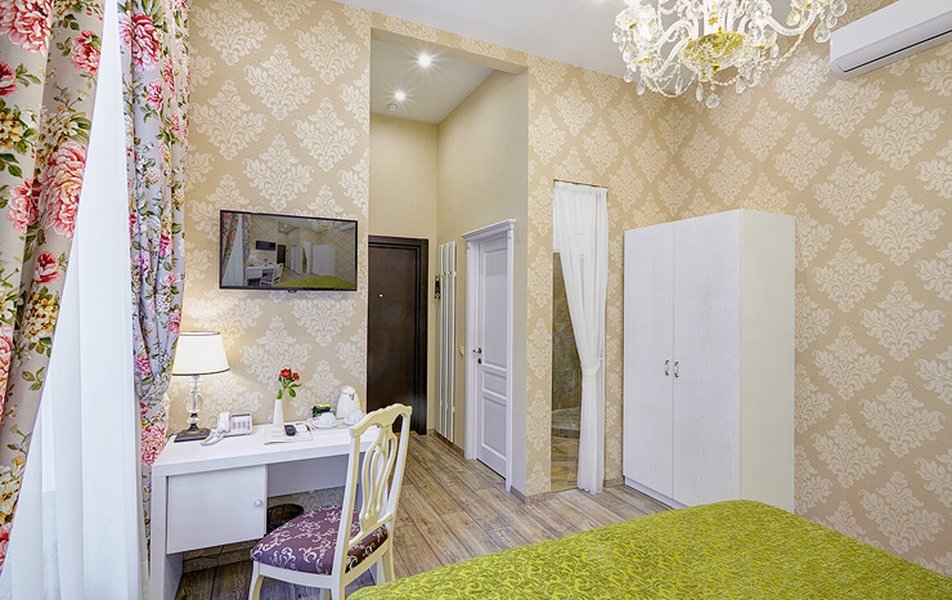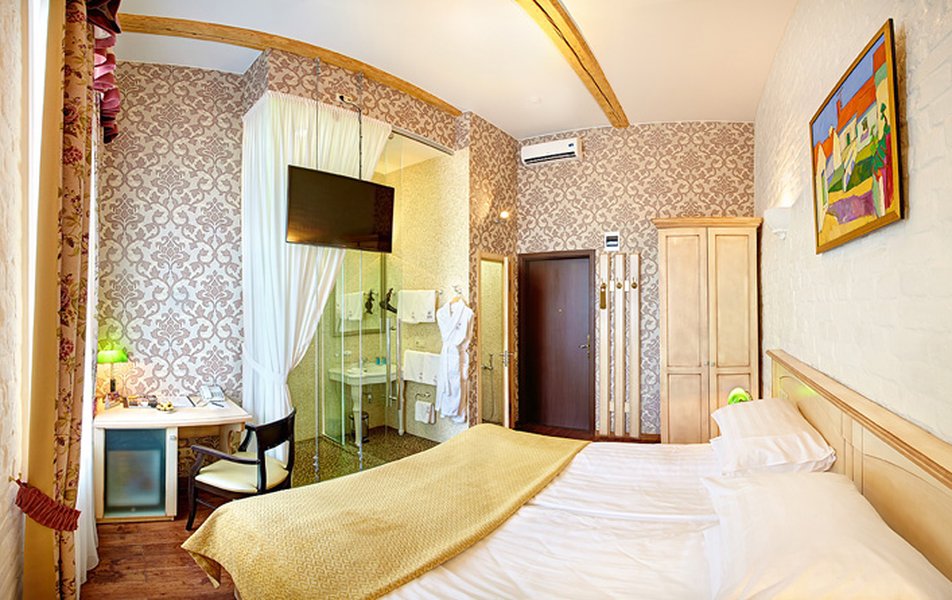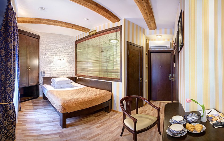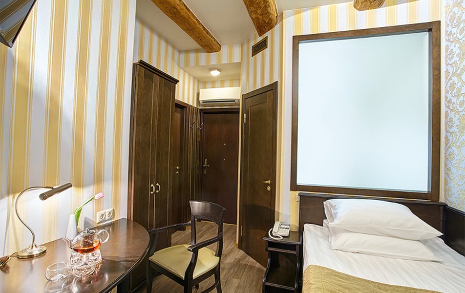Бюджетный 1-местный 1-комнатный Количество комнат: 1-комнатный Кол-во основных мест: 1 Площадь (кв. м): 12 Мебель: вешалка, зеркало, кровать односпальная, прикроватная тумбочка, стол, стул, шкаф Оборудование: кондиционер, мини-холодильник, сейф, телевизор, телефон Санузел: с душем, тапочки, теплый пол, туалетные принадлежности, фен, халат Сервис: Wi-Fi бесплатно, room-сервис, мини-бар, смена полотенец, смена постельного белья, уборка номера, услуги телефонной связи по территории отеля