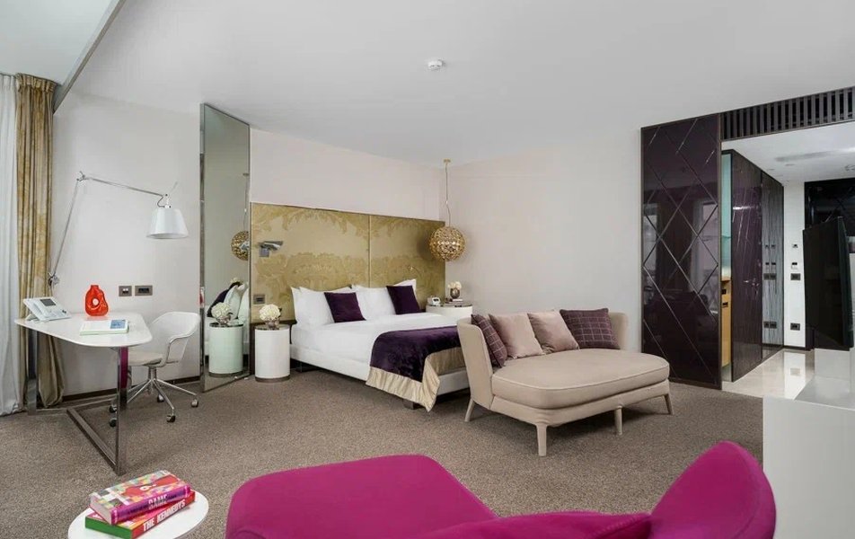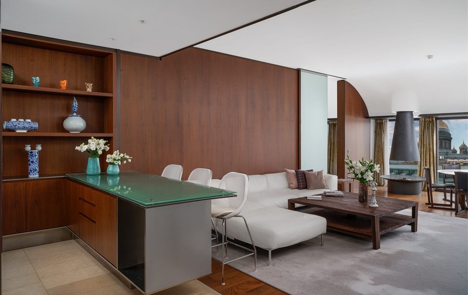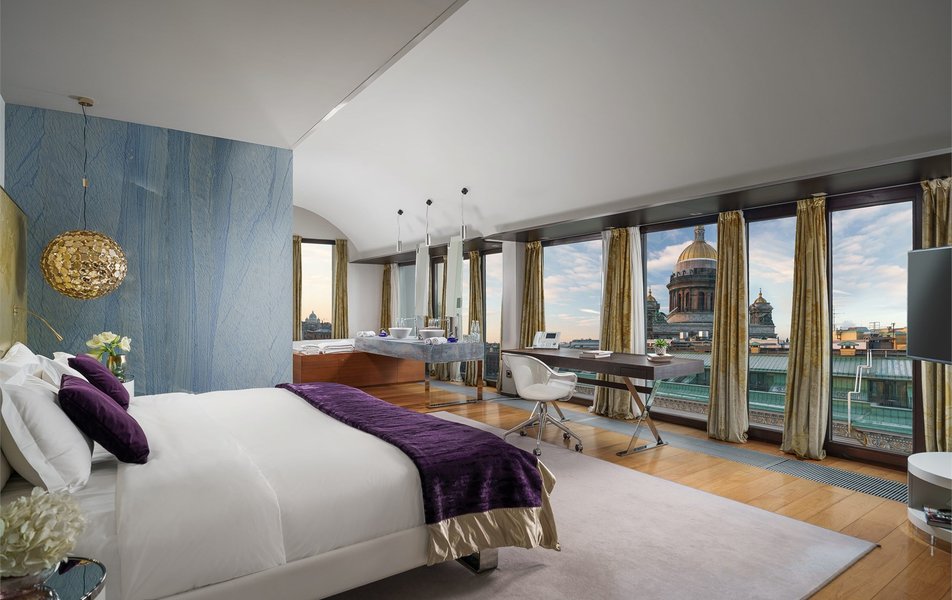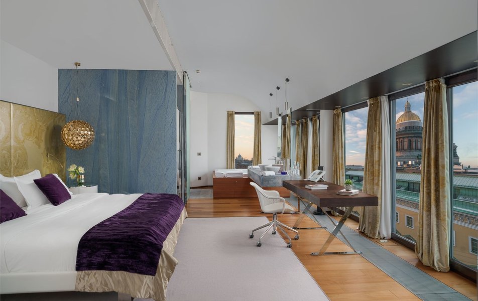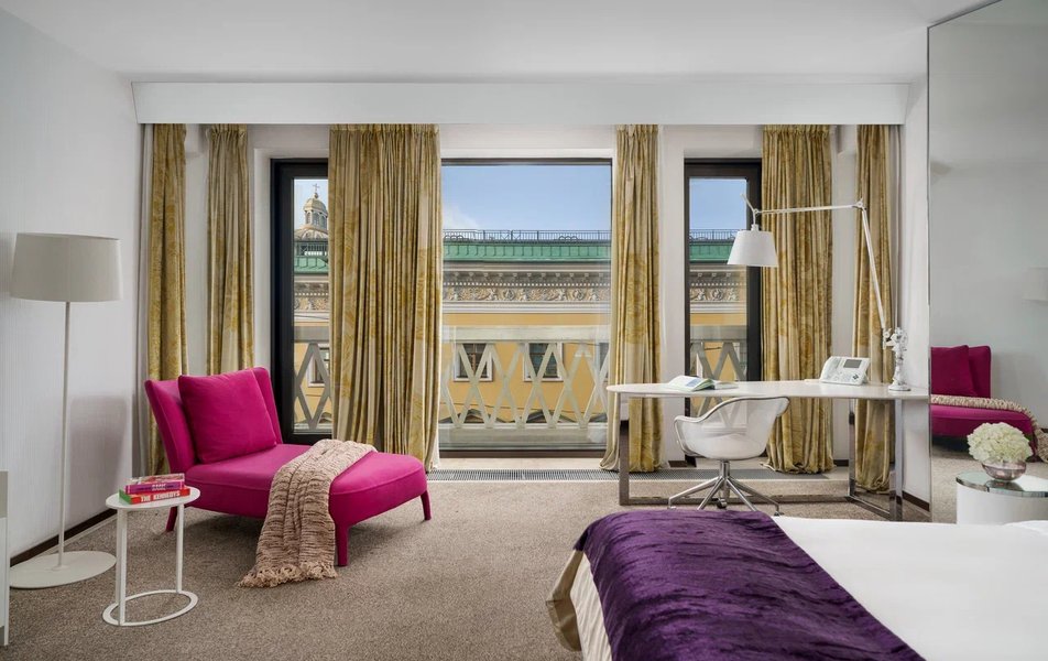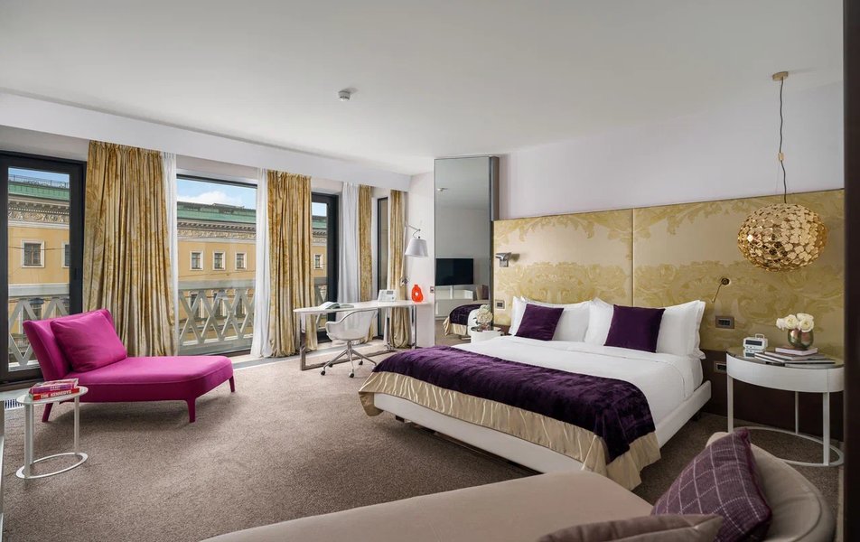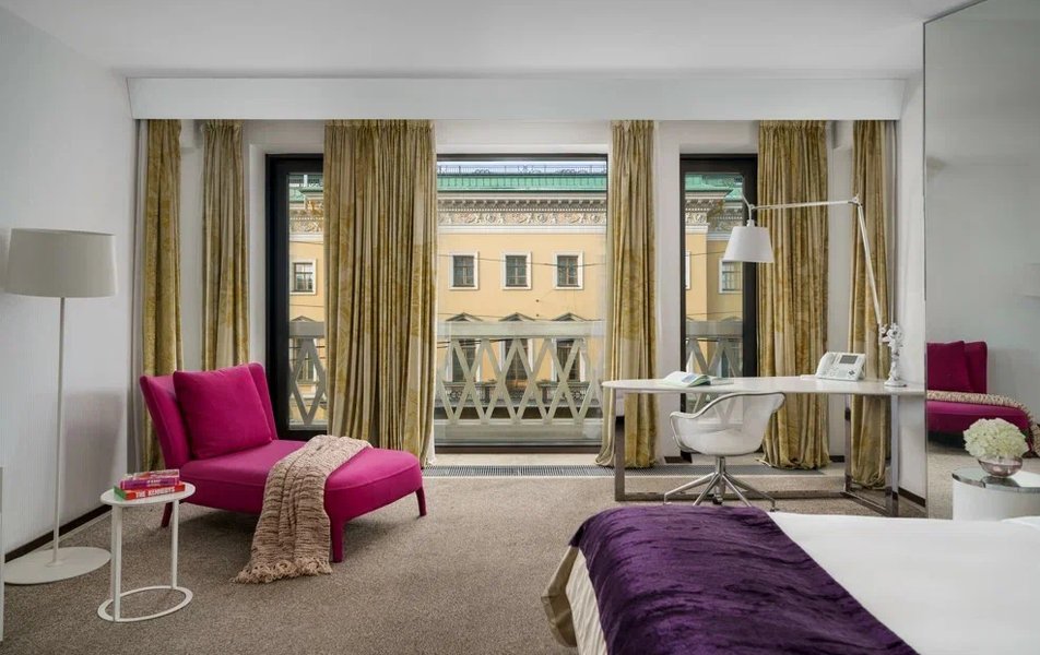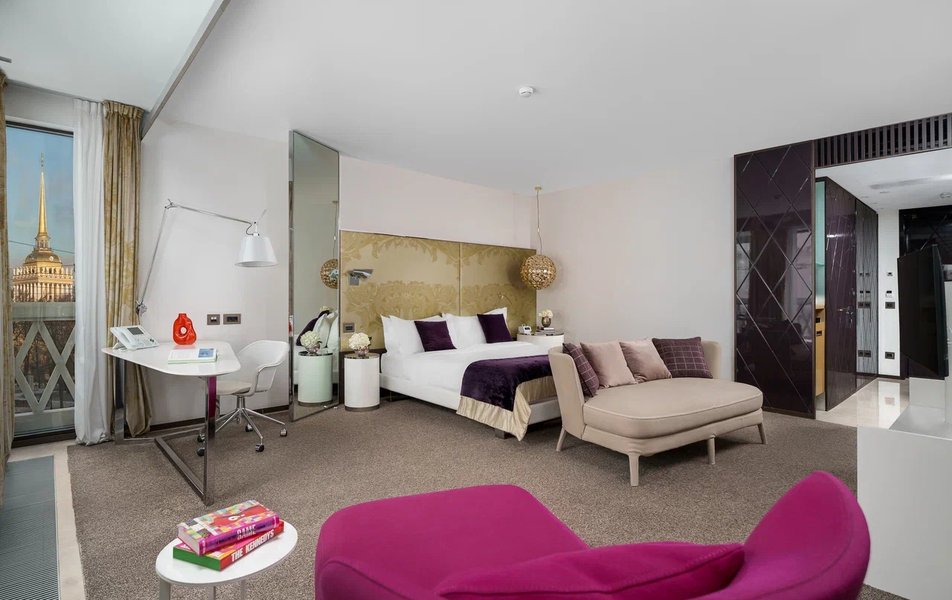 Junior Suite 2-местный SO Studio King DBL (вид на Вознесенский проспект или во внутренний двор) Количество комнат: 1-комнатный Тип номера: Джуниор Сюит Дополнительное место: кровать Вид из номера: на город: или двор Кол-во доп. мест: 1 Кол-во основных мест: 2 Площадь (кв. м): 47 Мебель: вешалка, зеркало, кровать двуспальная, прикроватные тумбочки, стол, стулья, шкаф Оборудование: кондиционер, кофемашина, сейф, телевизор ЖК, телефон, чайная станция Санузел: с ванной, тапочки, туалетные принадлежности, фен, халат Сервис: Wi-Fi бесплатно, room-сервис, мини-бар, смена полотенец, смена постельного белья, уборка номера