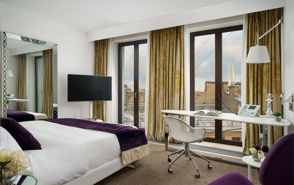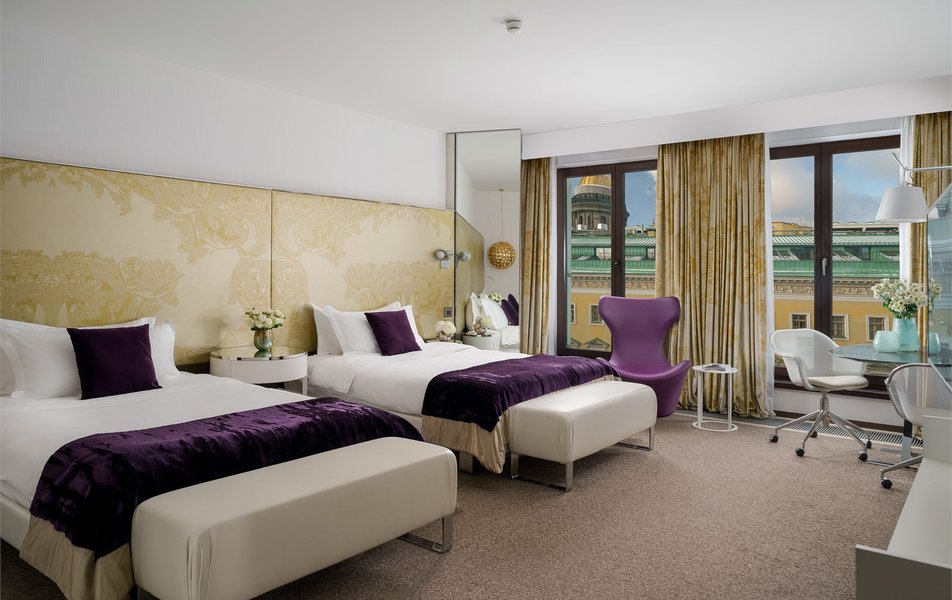 Junior Suite 2-местный SO Studio Twin (вид на Вознесенский проспект) Количество комнат: 1-комнатный Тип номера: Студио Дополнительное место: кровать Вид из номера: на город Кол-во доп. мест: 1 Кол-во основных мест: 2 Площадь (кв. м): 47 Мебель: вешалка, зеркало, кровати полутороспальные: 2, прикроватные тумбочки, стол, стулья, шкаф Оборудование: кондиционер, кофемашина, сейф, телевизор ЖК, телефон, чайная станция Санузел: с ванной, тапочки, туалетные принадлежности, фен, халат Сервис: Wi-Fi бесплатно, room-сервис, мини-бар, смена полотенец, смена постельного белья, уборка номера
