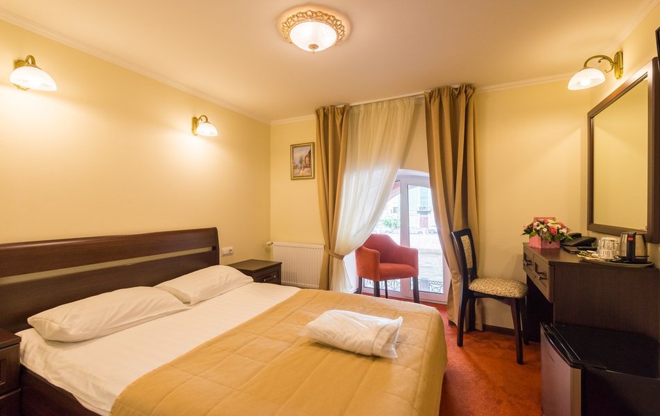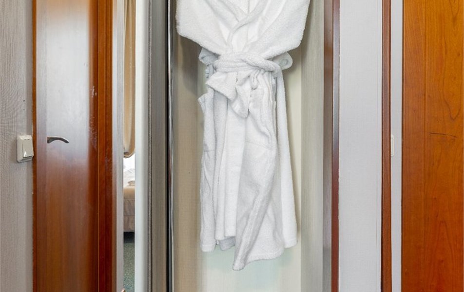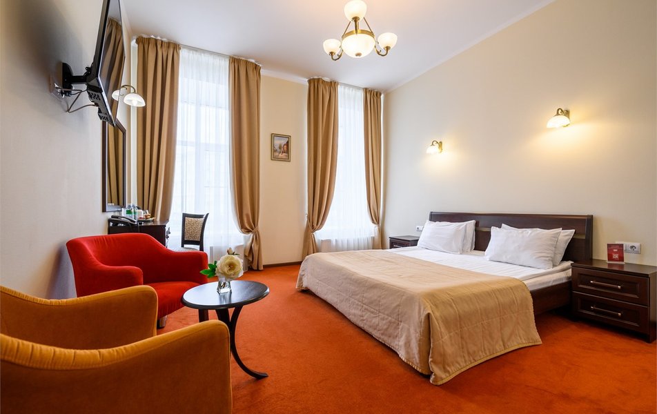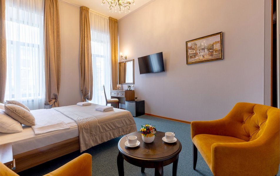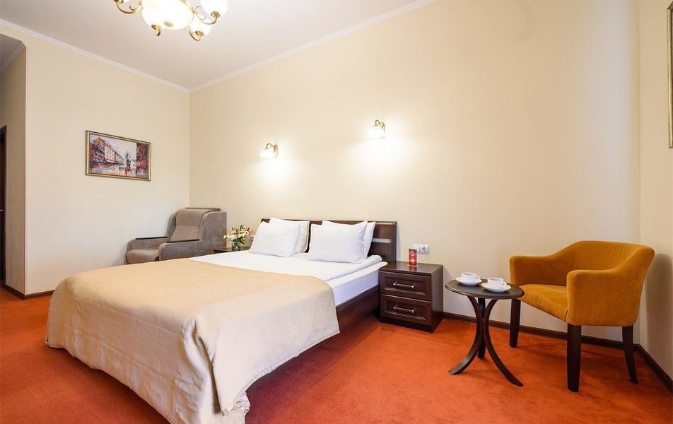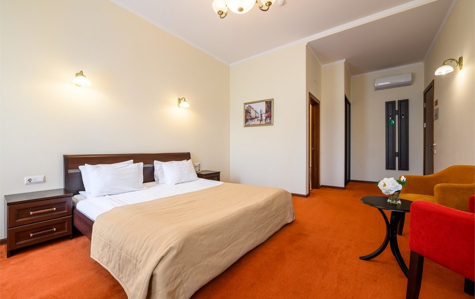 Люкс 2-местный (с балконом и джакузи, вид на набережную) Количество комнат: 1-комнатный Тип номера: Люкс Дополнительное место: еврораскладушка Вид из номера: на реку: на набережную Кол-во доп. мест: 1 Кол-во основных мест: 2 Площадь (кв. м): 23 Мебель: вешалка, зеркало, кровать двуспальная, прикроватные тумбочки, стол, столик туалетный, стулья, шкаф Оборудование: кондиционер, мини-холодильник, набор посуды, сейф, телевизор, чайный набор посуды, электрочайник Санузел: с джакузи, тапочки, туалетные принадлежности, фен, халат Сервис: Wi-Fi бесплатно, смена полотенец, смена постельного белья, уборка номера