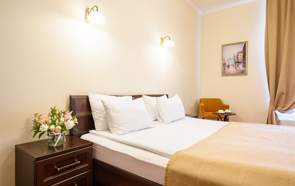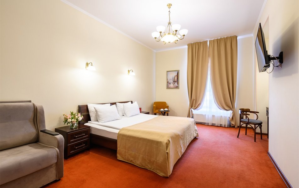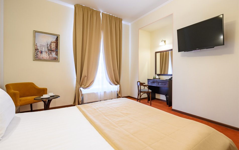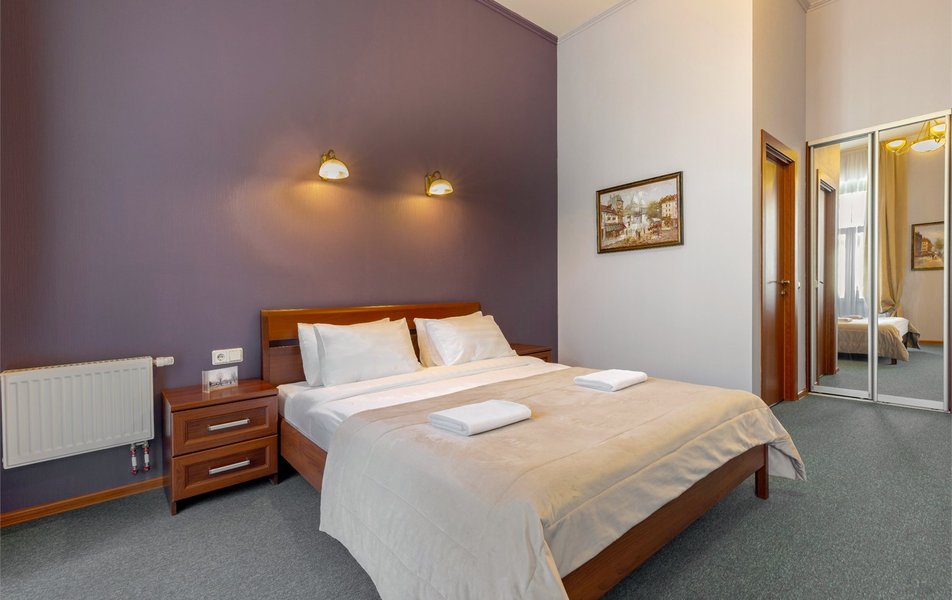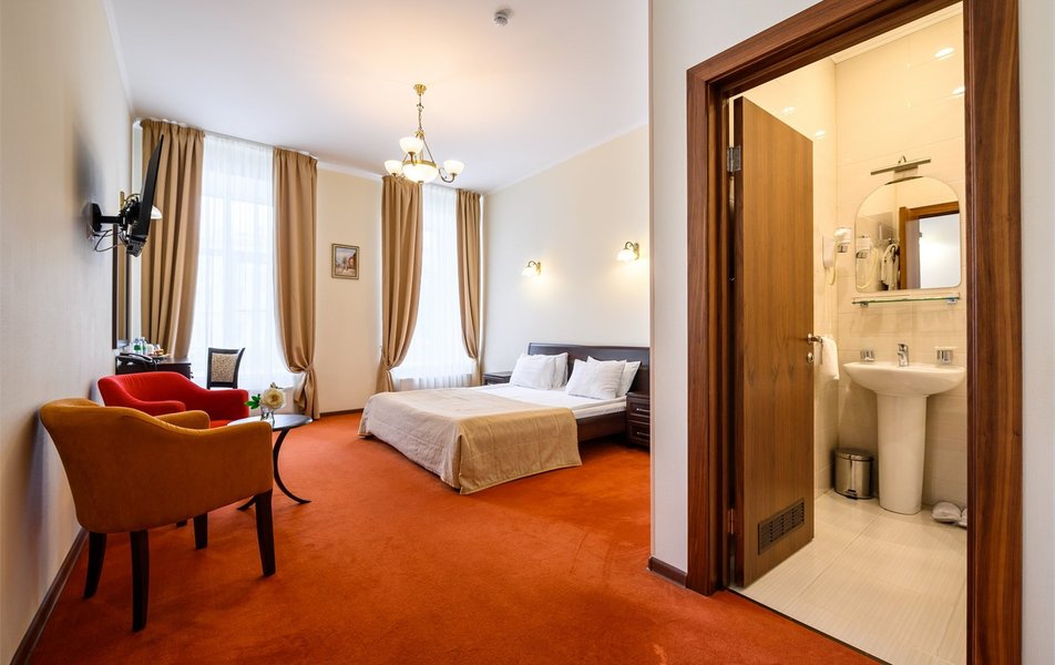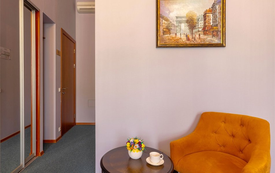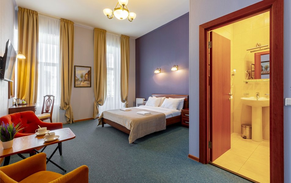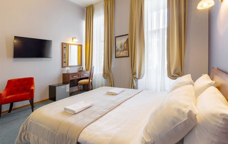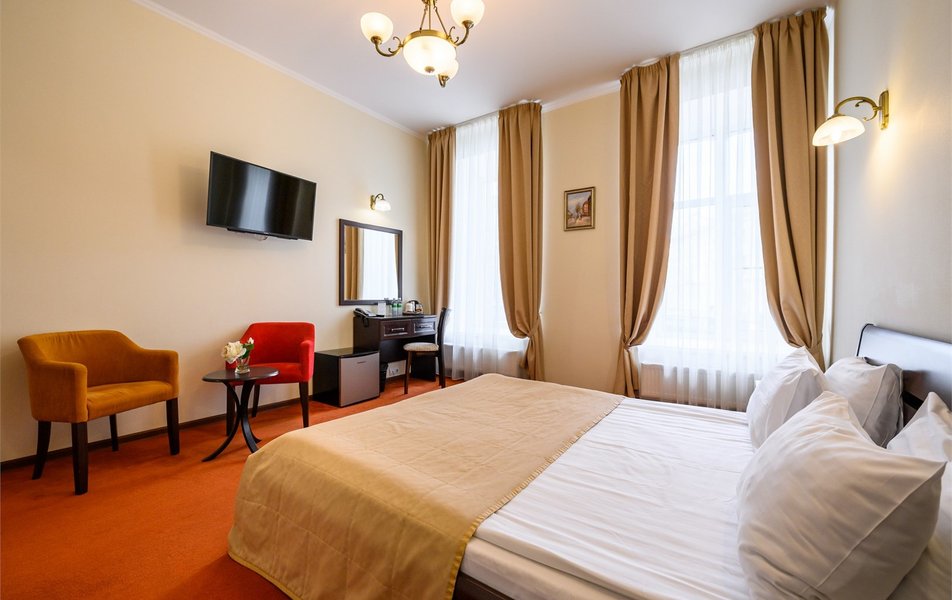 Комфорт 2-местный DBL (вид на набережную) Количество комнат: 1-комнатный Тип номера: Комфорт Дополнительное место: кресло-кровать Вид из номера: на реку Кол-во доп. мест: 1 Кол-во основных мест: 2 Площадь (кв. м): 23 Мебель: вешалка, зеркало, кресло-кровать, кровать двуспальная, прикроватные тумбочки, стол, столик туалетный, стул, шкаф Оборудование: гладильная доска, мини-холодильник, сейф, телевизор, утюг, чайная станция, чайный набор посуды Санузел: с джакузи, тапочки, туалетные принадлежности, фен Сервис: Wi-Fi бесплатно, смена полотенец, смена постельного белья, уборка номера