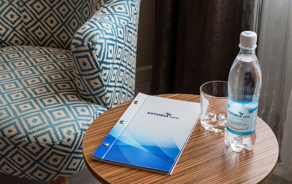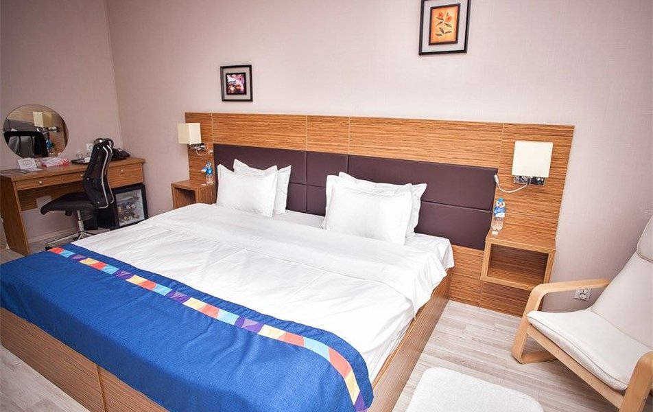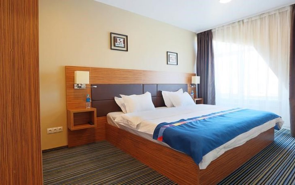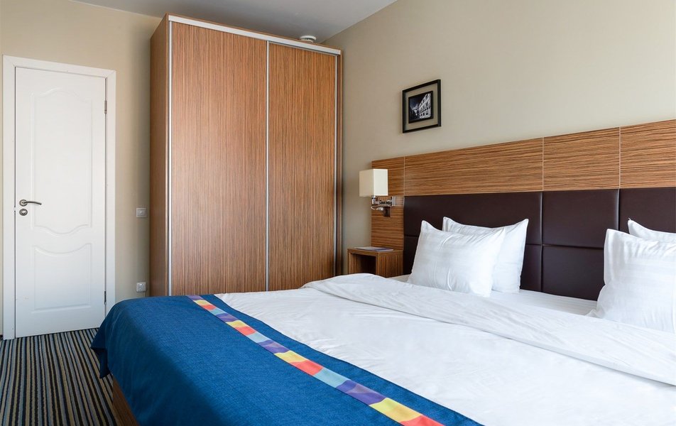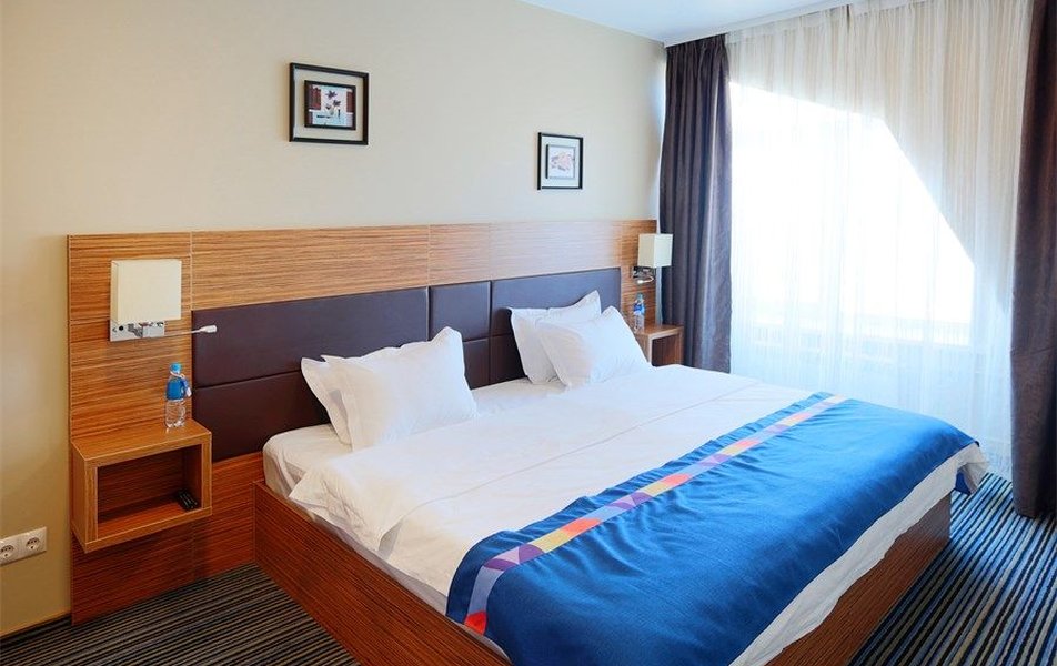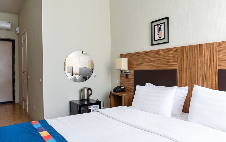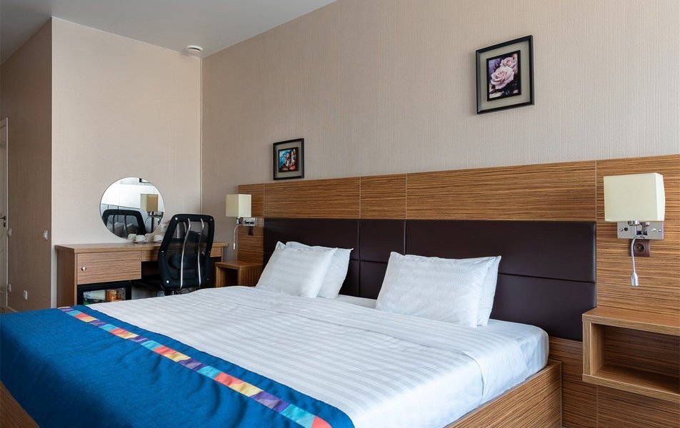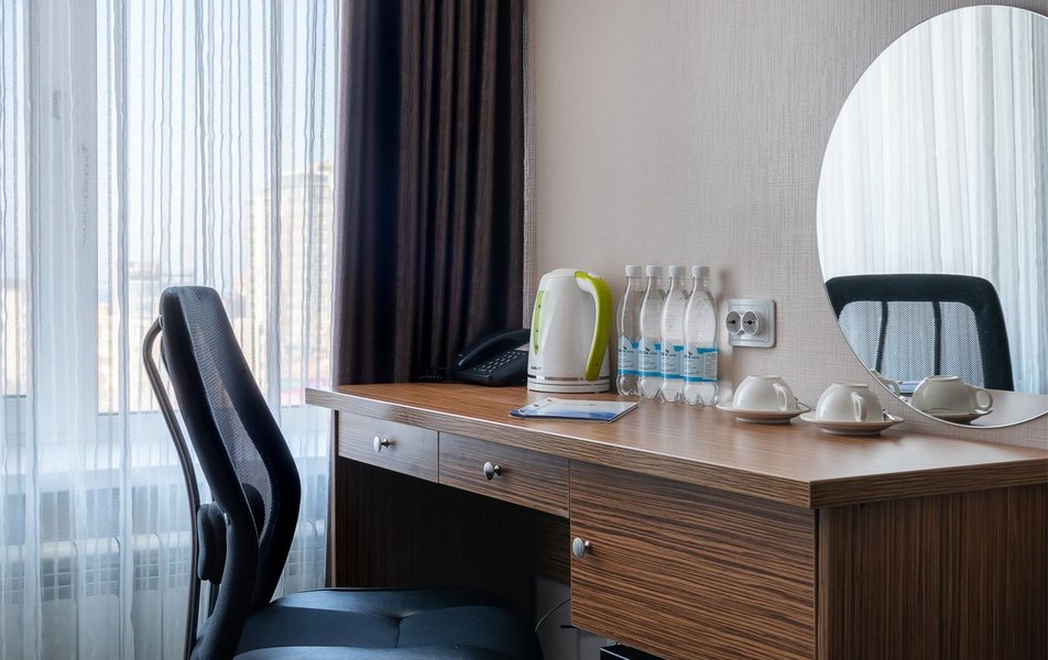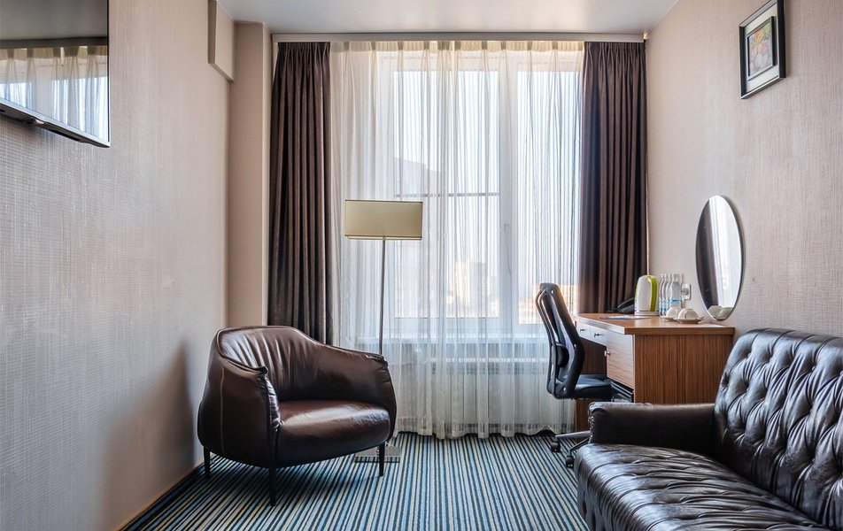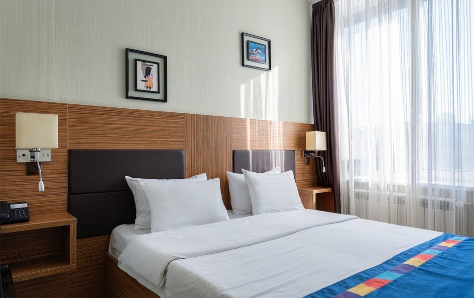 Стандартный 2-местный 1-комнатный Количество комнат: 1-комнатный Тип номера: Стандартный Вид из номера: на город Кол-во основных мест: 2 Площадь (кв. м): 24 Мебель: вешалка, зеркало, кресло, кровать двуспальная: «King size»: 200х220 мм, прикроватные тумбочки, стол: письменный, столик журнальный, стул, шкаф Оборудование: кондиционер, мини-холодильник, сейф, телевизор ЖК, телефон, чайный набор посуды, электрочайник Санузел: с ванной или душевой кабиной, тапочки, туалетные принадлежности, фен, халат Сервис: Wi-Fi бесплатно, смена полотенец, смена постельного белья, уборка номера