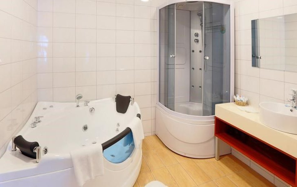 Люкс 2-местный 2-комнатный Количество комнат: 2-комнатный Тип номера: Люкс Вид из номера: на море Кол-во доп. мест: 1 Кол-во номеров: 2 Кол-во основных мест: 2 Площадь (кв. м): 48 Мебель: вешалка, диван, зеркало, кресло, кровать двуспальная, прикроватные тумбочки, стол, столик журнальный, стул, шкаф-купе Оборудование: кондиционер, мини-холодильник, сейф, телевизор ЖК, телефон, чайный набор посуды, электрочайник Санузел: с джакузи, с душем, тапочки, туалетные принадлежности, фен, халат Сервис: Wi-Fi бесплатно, смена полотенец, смена постельного белья, уборка номера
