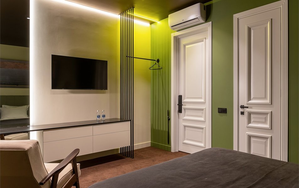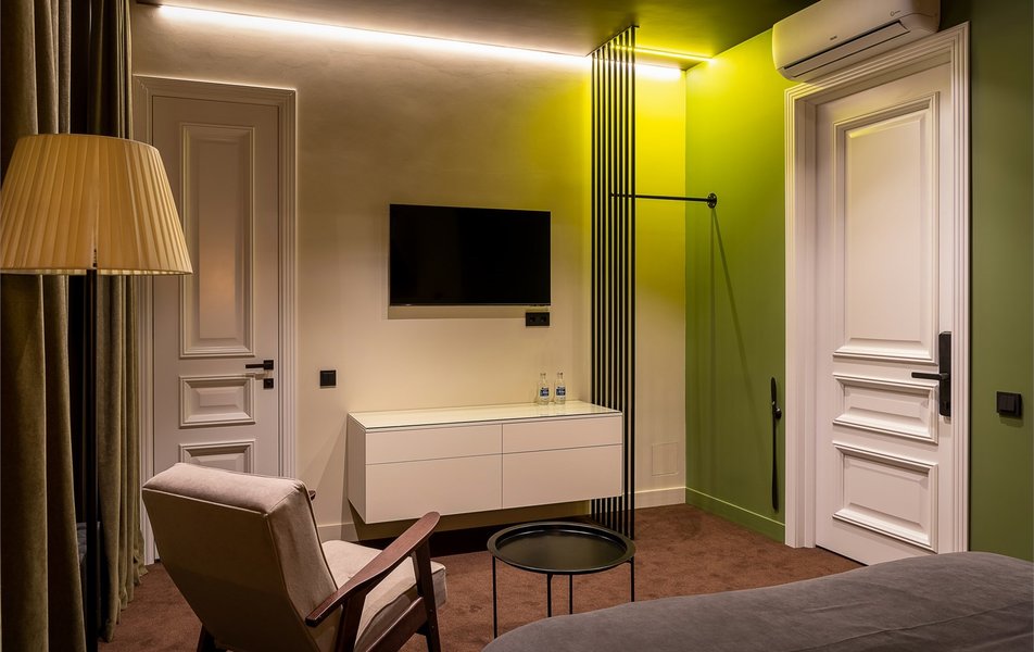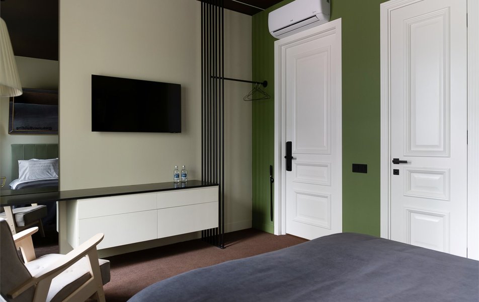 Апартаменты 2-местный (DBL) Количество комнат: 1-комнатный Тип номера: Апартаменты Дополнительное место: диван Вид из номера: на двор Кол-во доп. мест: 2 Кол-во основных мест: 2 Площадь (кв. м): 30 Мебель: вешалка, диван раскладной, зеркало, кровать двуспальная, прикроватные тумбочки, стол, стулья, шкаф Оборудование: гладильная доска, кондиционер, микроволновая печь, мини-холодильник, набор посуды, плита электрическая, стиральная машина, телевизор, чайный набор посуды, электрочайник Санузел: биде, с душем, тапочки, туалетные принадлежности, фен, халат Сервис: Wi-Fi бесплатно, смена полотенец, смена постельного белья, уборка номера