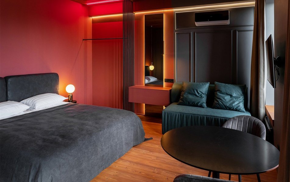 Стандартный 2-местный (Red) Количество комнат: 1-комнатный Тип номера: Стандартный Кол-во основных мест: 2 Площадь (кв. м): 20 Мебель: кровать двуспальная, стол, стулья, шкаф Оборудование: кондиционер, мини-холодильник, набор посуды, телевизор, чайник Санузел: с душевой кабиной, туалетные принадлежности, фен Сервис: Wi-Fi бесплатно, карточная система замков, смена полотенец, смена постельного белья, уборка номера