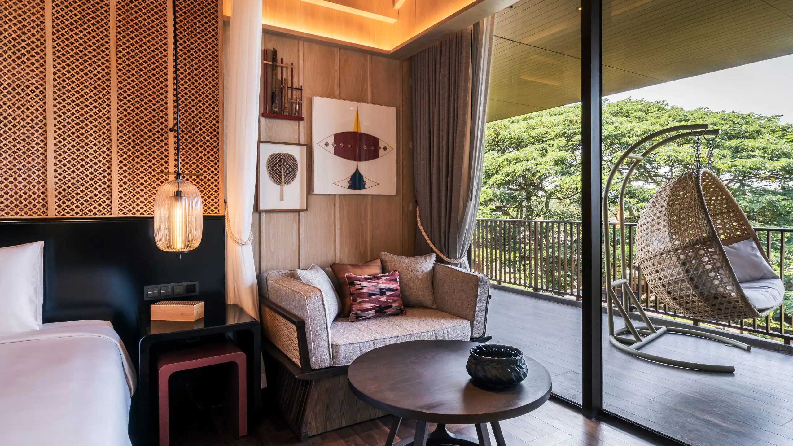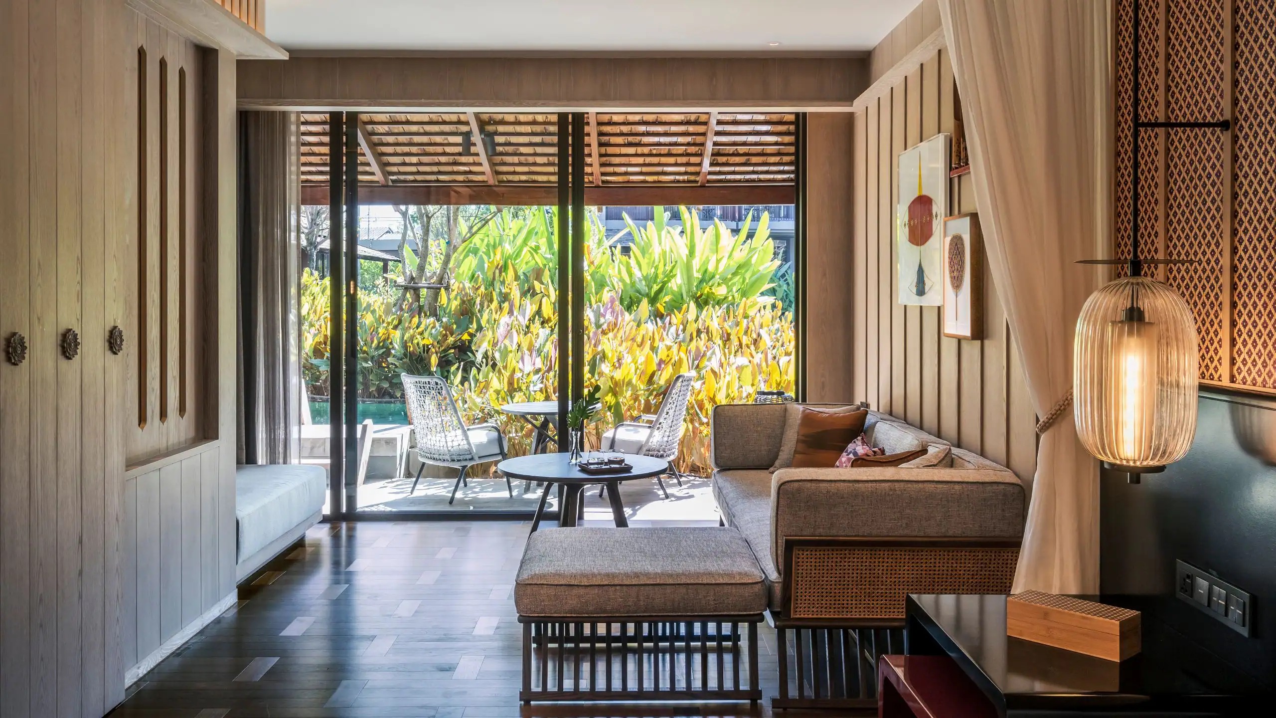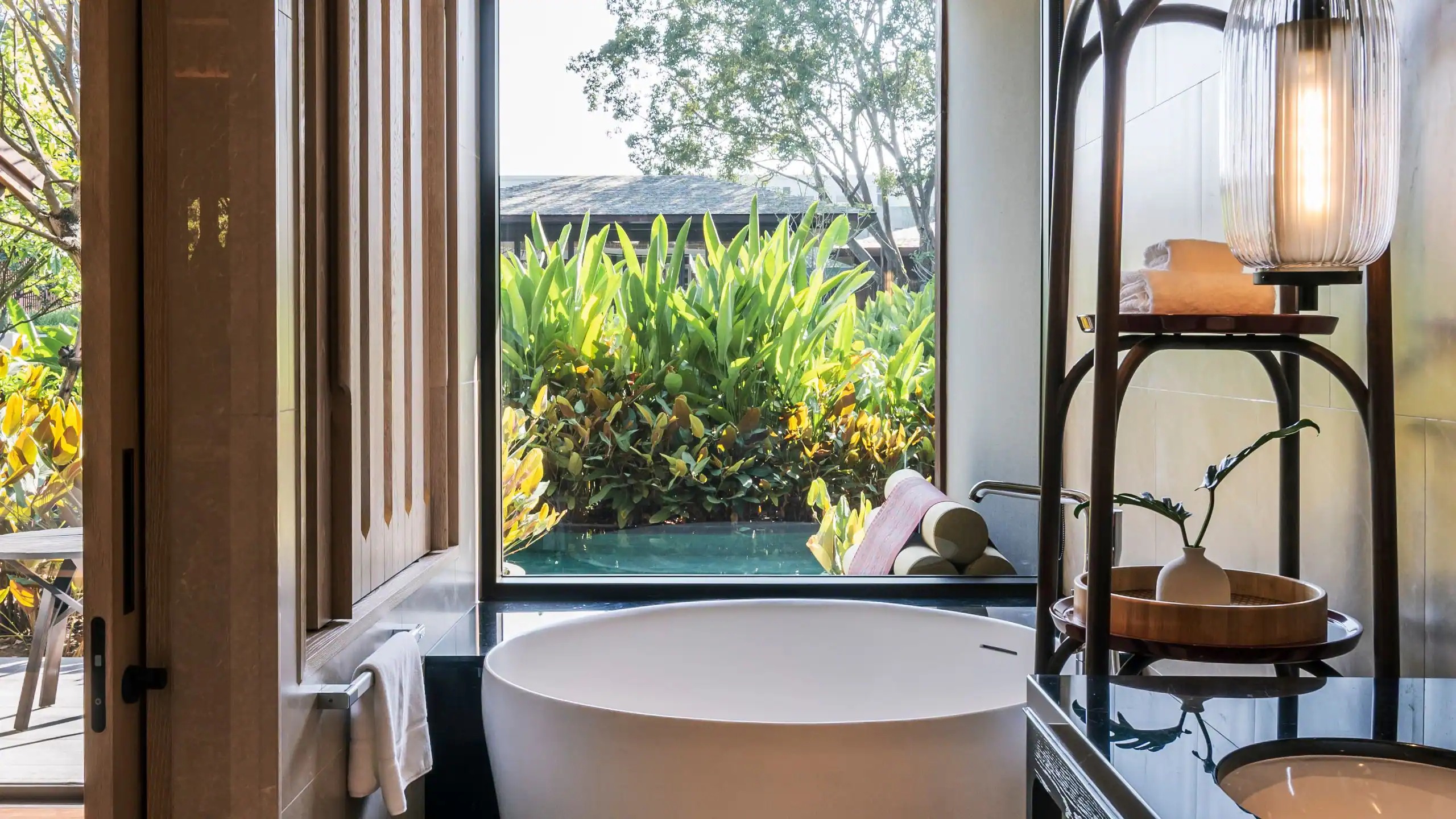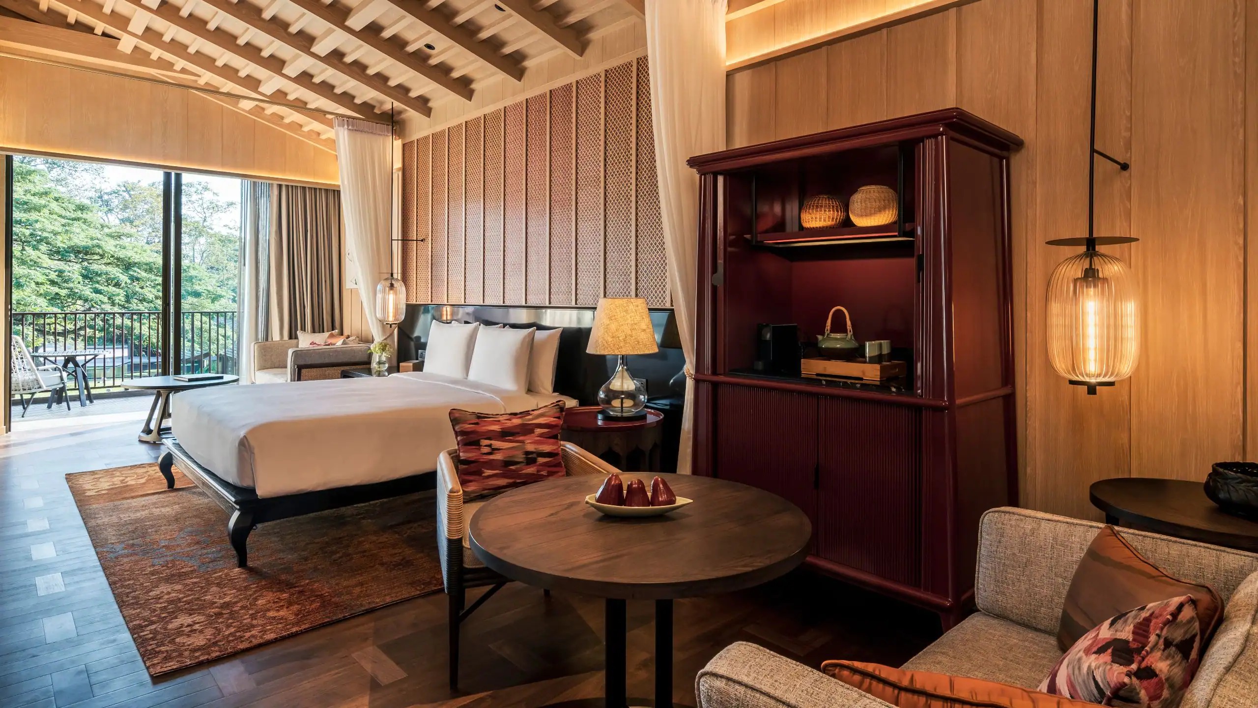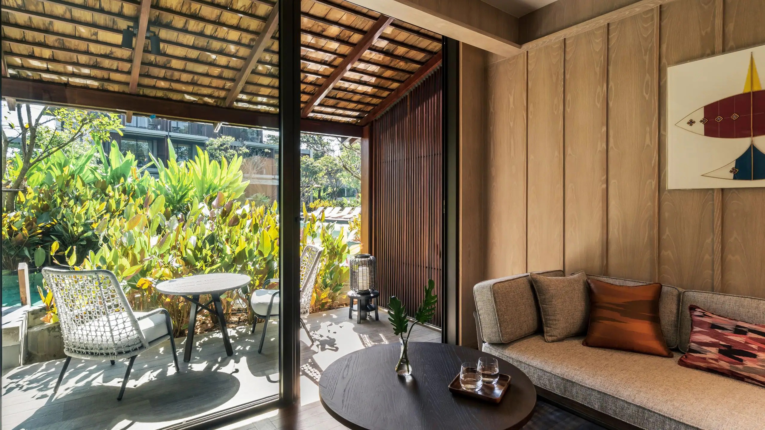 Однокомнатный номер с балконом/террасой и ванной комнатой с круглой ванной, двойной раковиной и тропическим душем. В числе стандартных удобств — Wi-Fi, телевизор, кондиционер, мини-бар с закусками и напитками, кофеварка Nespresso, чайные принадлежности. Гости размещаются на большой двуспальной кровати, кушетке, есть гостиная зона. Из номера открывается вид на тропический сад.