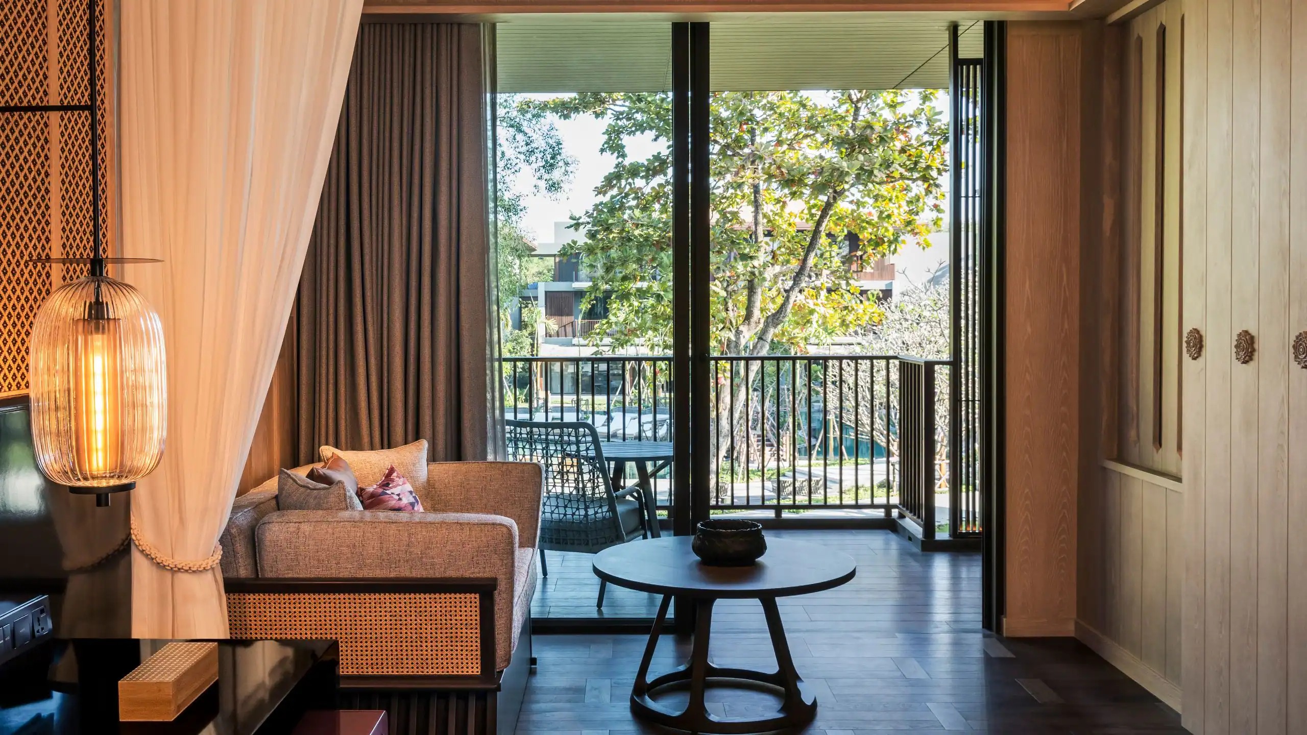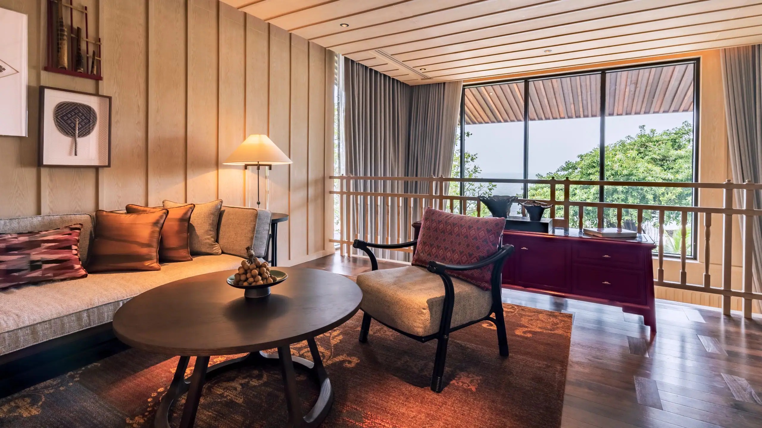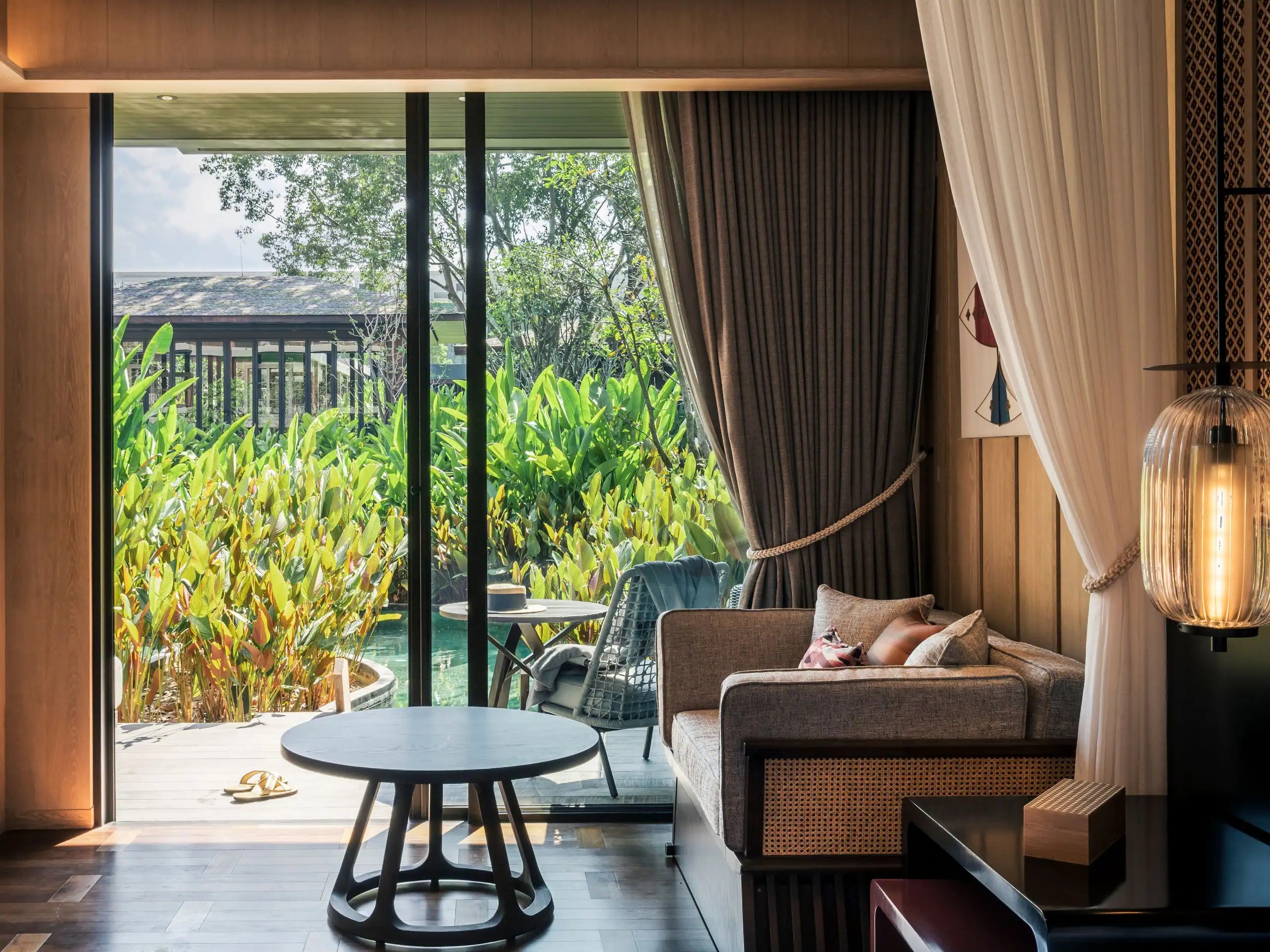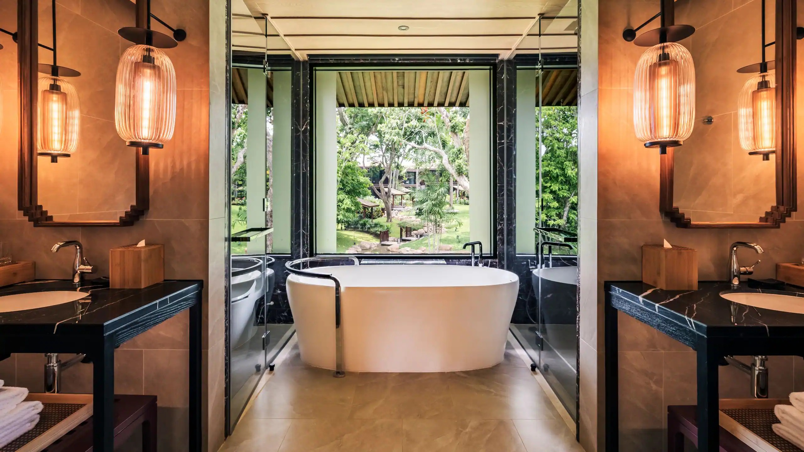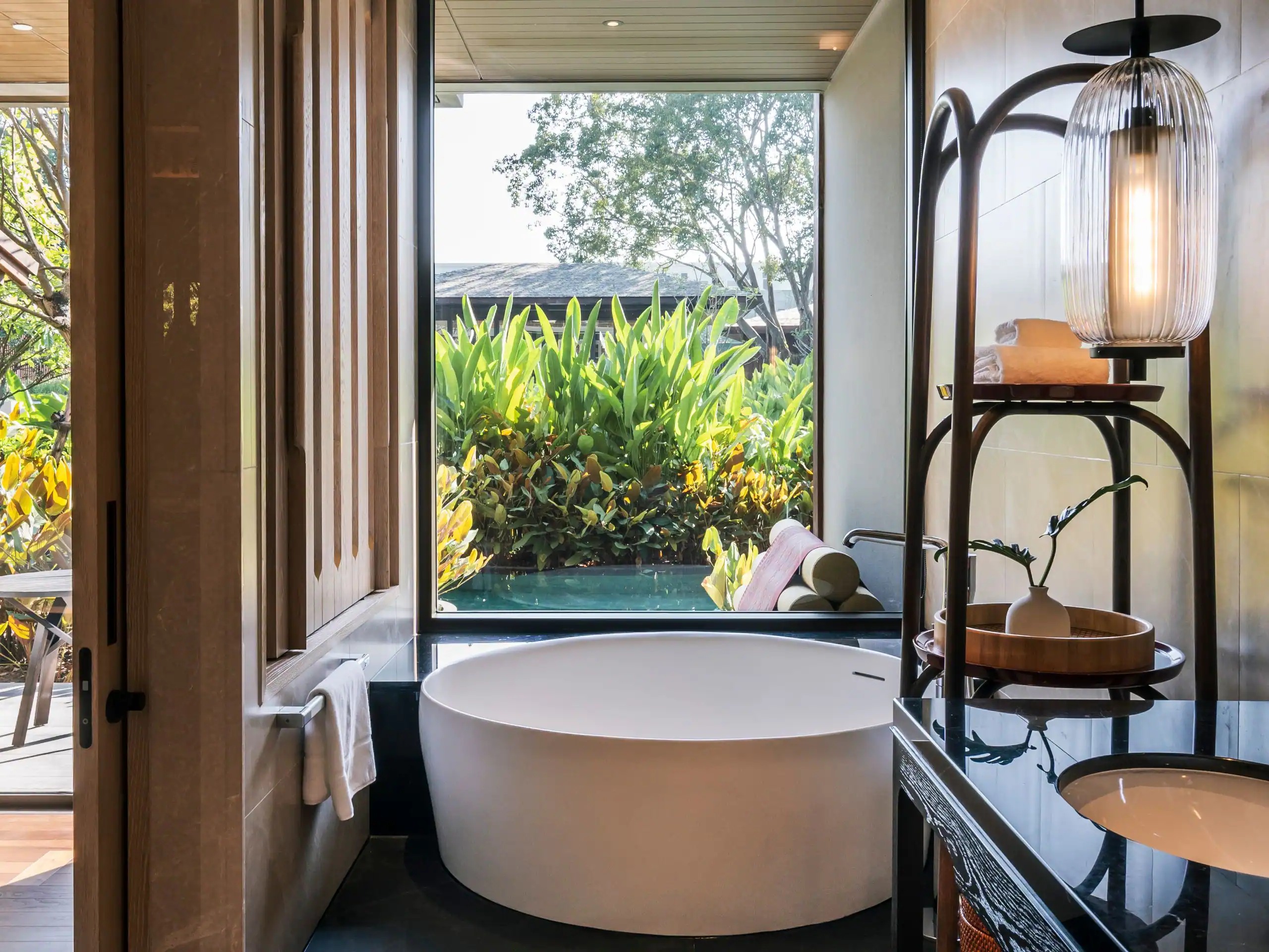 Однокомнатный номер с балконом/террасой и ванной комнатой с круглой ванной, двойной раковиной и тропическим душем. В числе стандартных удобств — Wi-Fi, телевизор, кондиционер, мини-бар с закусками и напитками, кофеварка Nespresso, чайные принадлежности. Гости размещаются на большой двуспальной кровати, кушетке, есть гостиная зона. Из номера открывается вид на тропический сад.