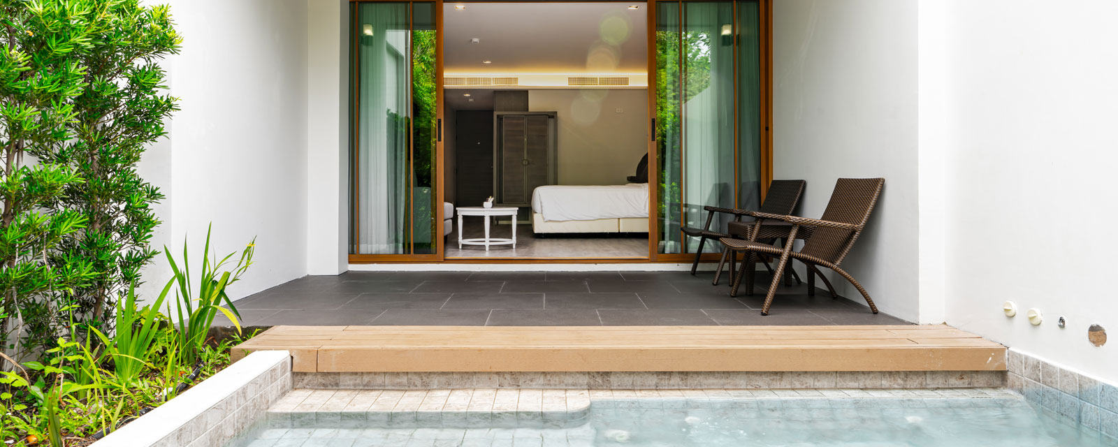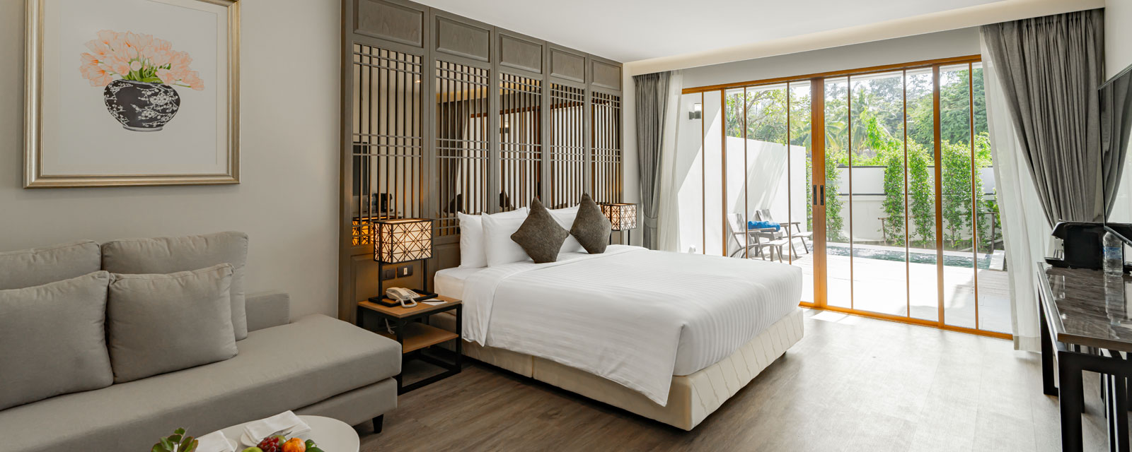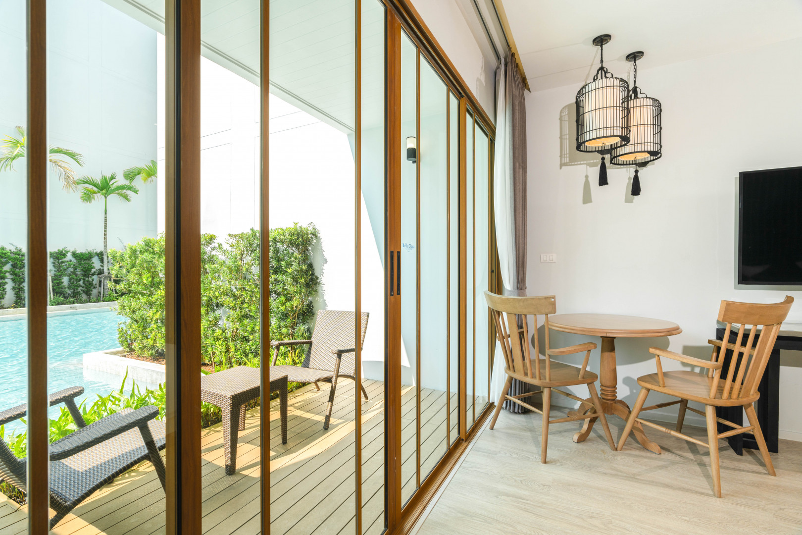 Однокомнатный номер укомплектован одной двуспальной или двумя односпальными кроватями, зоной отдыха, Wi-Fi, кондиционером, кофемашиной, набором для приготовления чая и кофе, сейфом, телевизором, телефоном, мини-холодильником. В ванной комнате душ, фен, банные принадлежности, халаты, тапочки. Есть терраса с прямым выходом к бассейну.