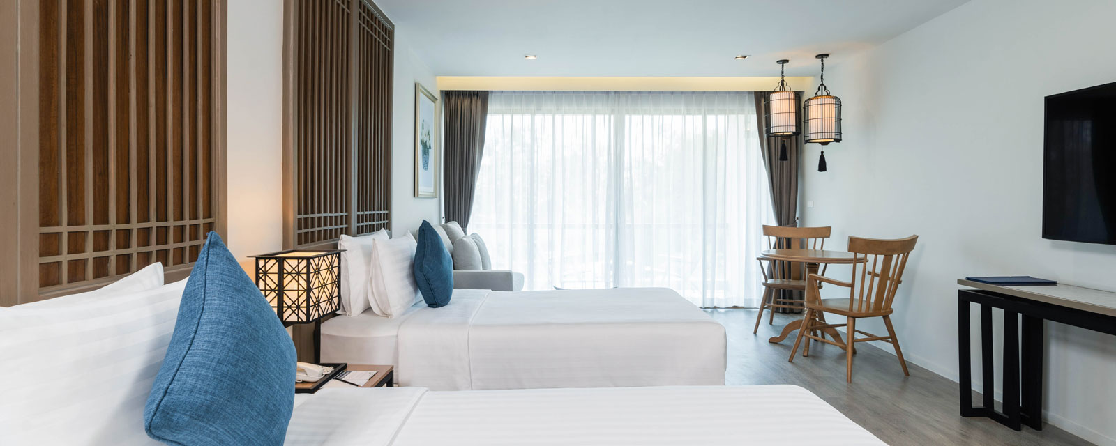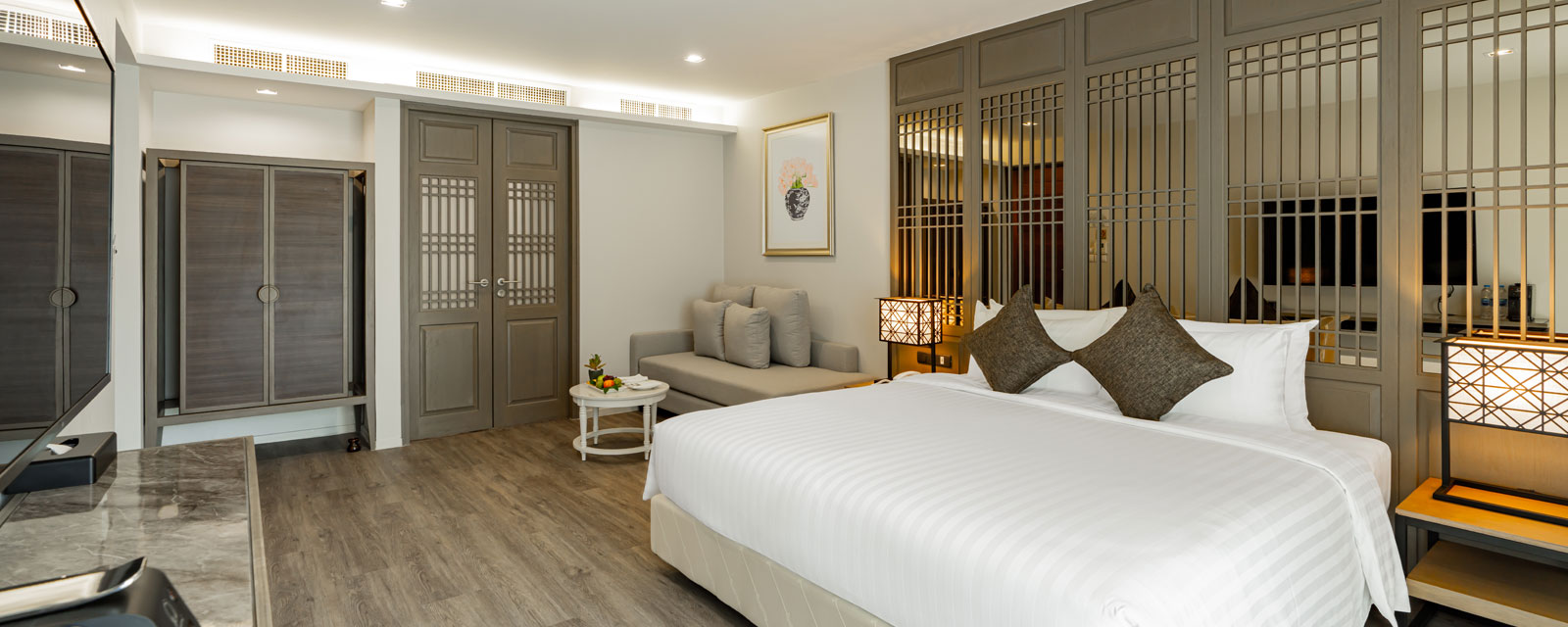 В однокомнатном номере гости размещаются на двуспальной/двух односпальных кроватях, есть зона отдыха, балкон с видом на бассейн, ванная комната с душем. Среди удобств беспроводной интернет, кондиционер, телевизор, телефон, сейф, мини-холодильник, пляжная сумка, зонт, набор для приготовления чая и кофе, фен, халаты, тапочки, косметические наборы.