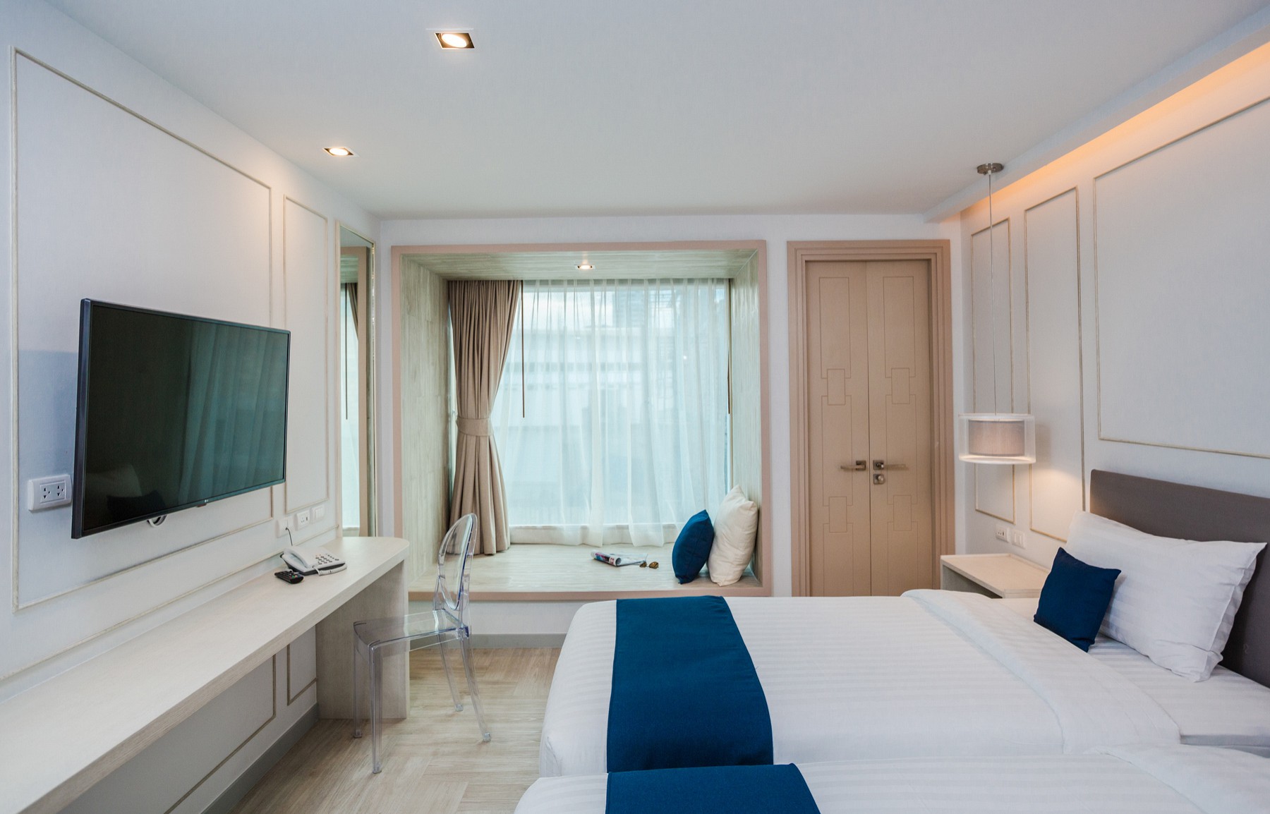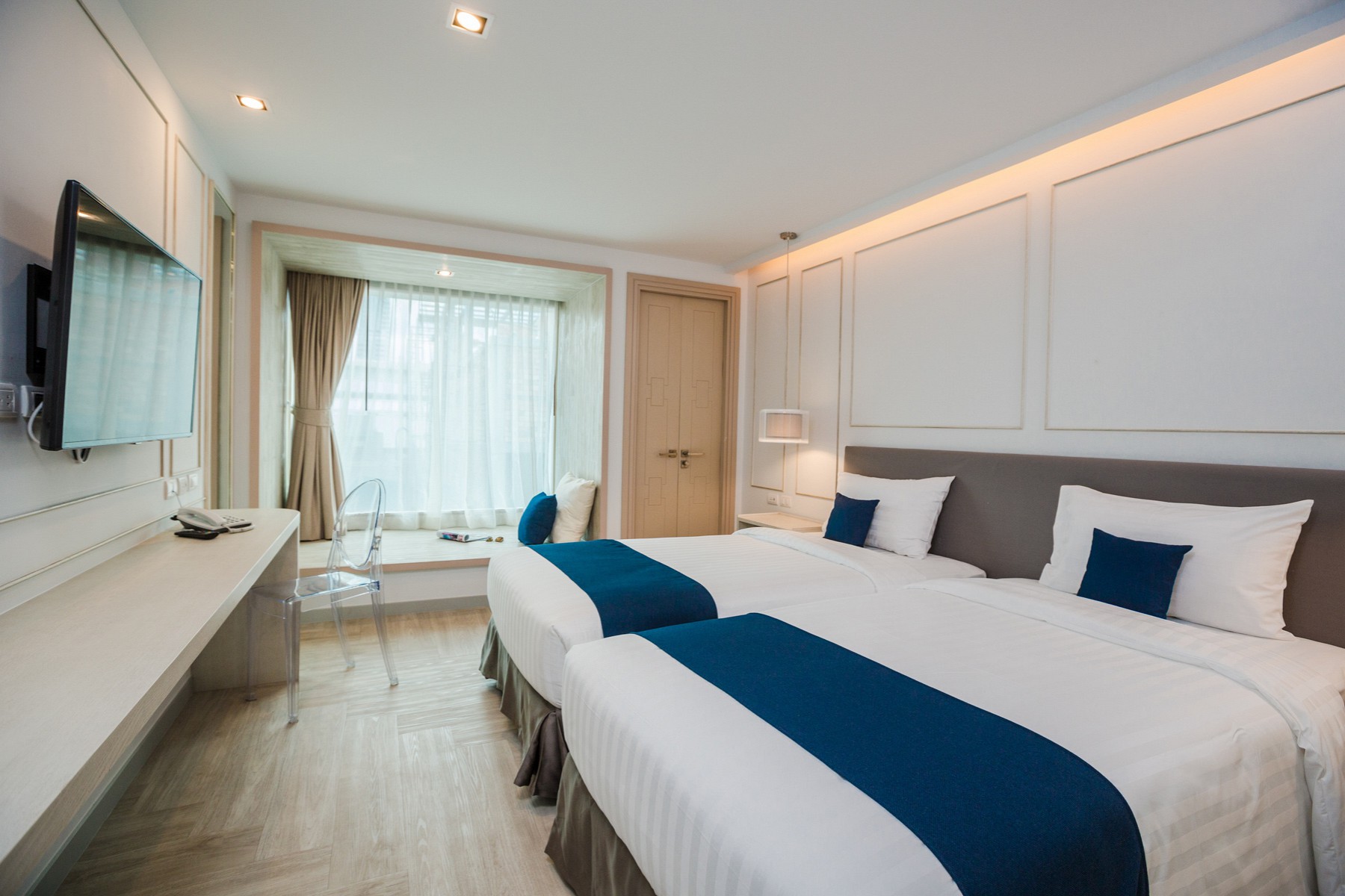 Комплектация номера включает двуспальную кровать/2 односпальные кровати, балкон, кондиционер, телевизор, телефон, мини-холодильник, сейф. В числе прочих удобств — Wi-Fi, набор для приготовления чая и кофе, халаты и тапочки. В ванной комнате душ, фен, туалетно-косметические принадлежности.