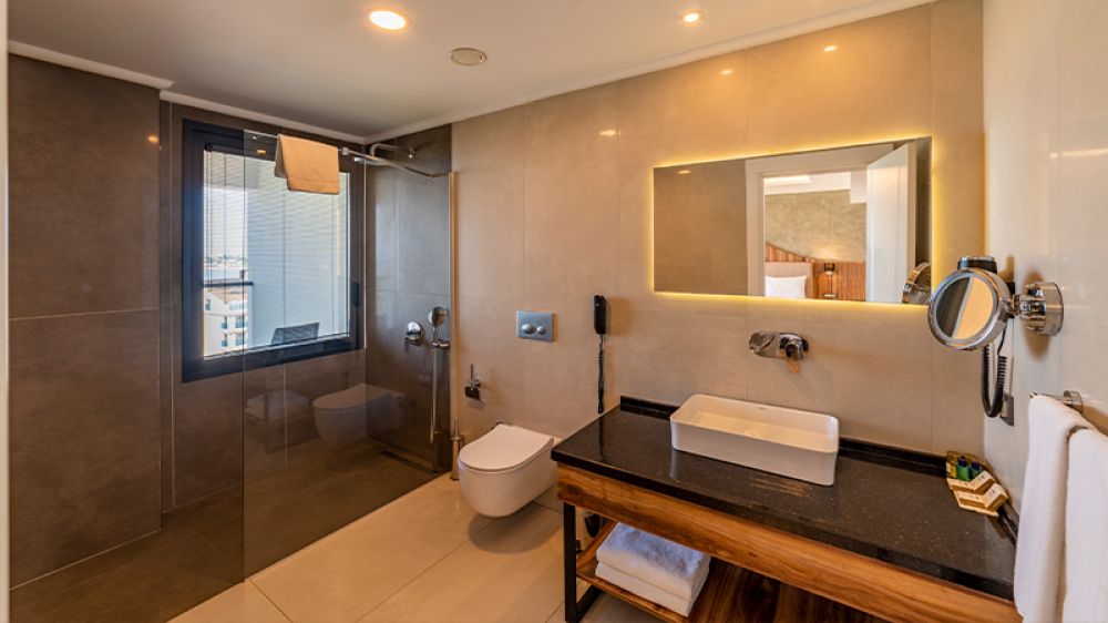 Однокомнатный номер укомплектован двуспальной кроватью, Wi-Fi, кондиционером, телевизором, мини-баром, сейфом, чайником, есть балкон с видом на окрестности. В ванной комнате душ, фен, банные принадлежности.