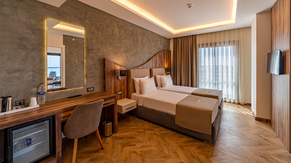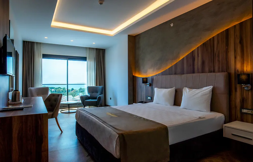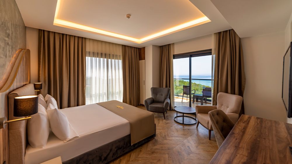 В комплектации стандартного номера с видом на море балкон, кондиционер, мини-бар, телевизор, сейф, набор для чая и кофе, беспроводной Интернет. Гости размещаются на двуспальной кровати. В ванной комнате душ, туалетные принадлежности, фен.