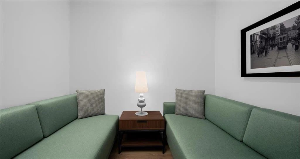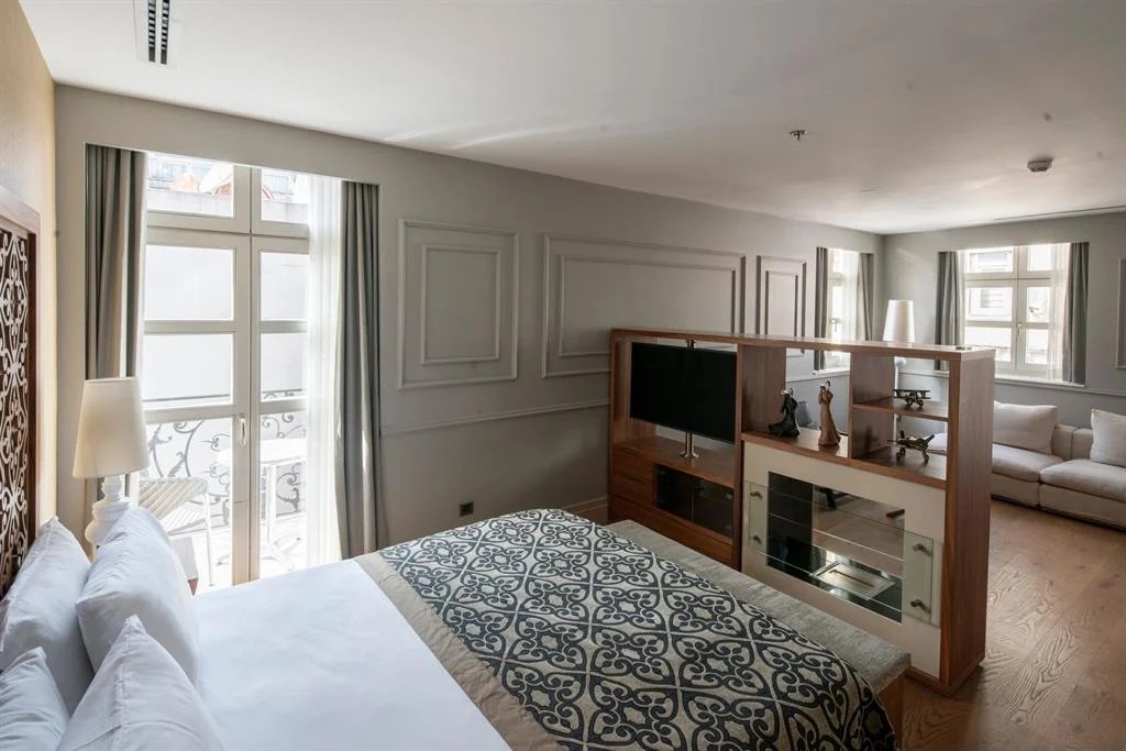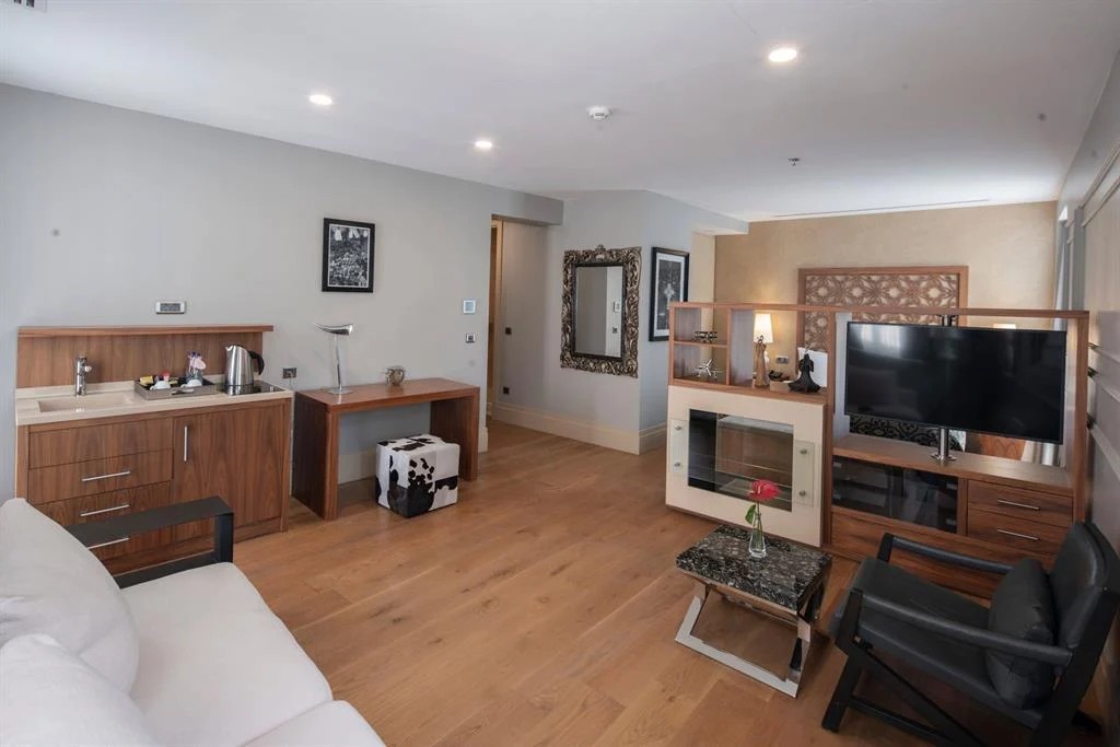 В однокомнатном просторном номере имеется гостиная зона с кухней и диваном, спальная зона с французской кроватью, электрический камин. Из удобств кондиционер, телевизор, сейф, телефон, чайно-кофейные принадлежности. Санузел с душем, феном и гостиничной косметикой.