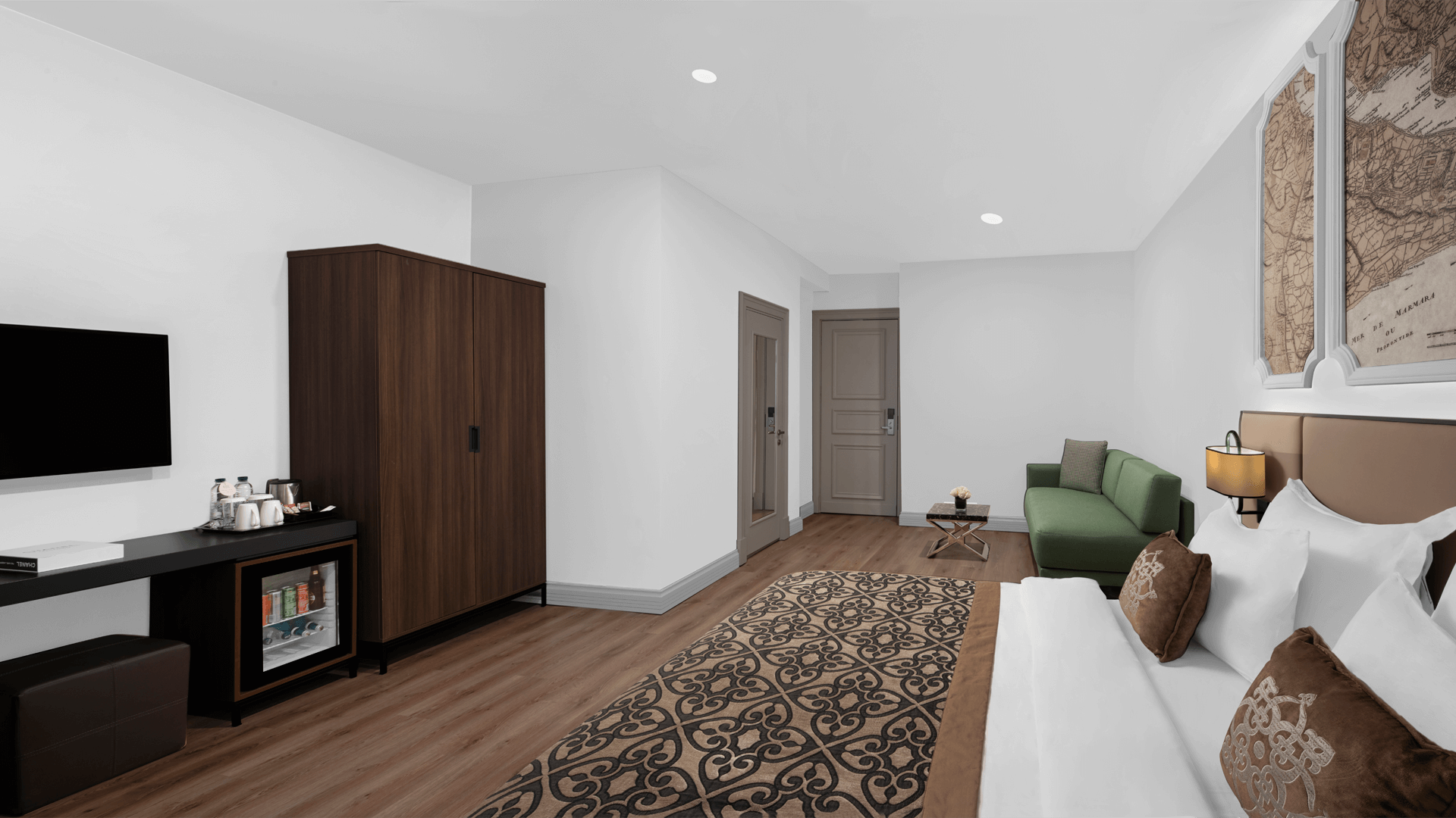 Однокомнатный номер оснащен кондиционером, мини-баром, телевизором, сейфом, телефоном, чайником, гладильными принадлежностями (по запросу). Для размещения предлагается двуспальная кровать и раскладной диван. В ванной комнате душ, набор гостиничной косметики, фен.