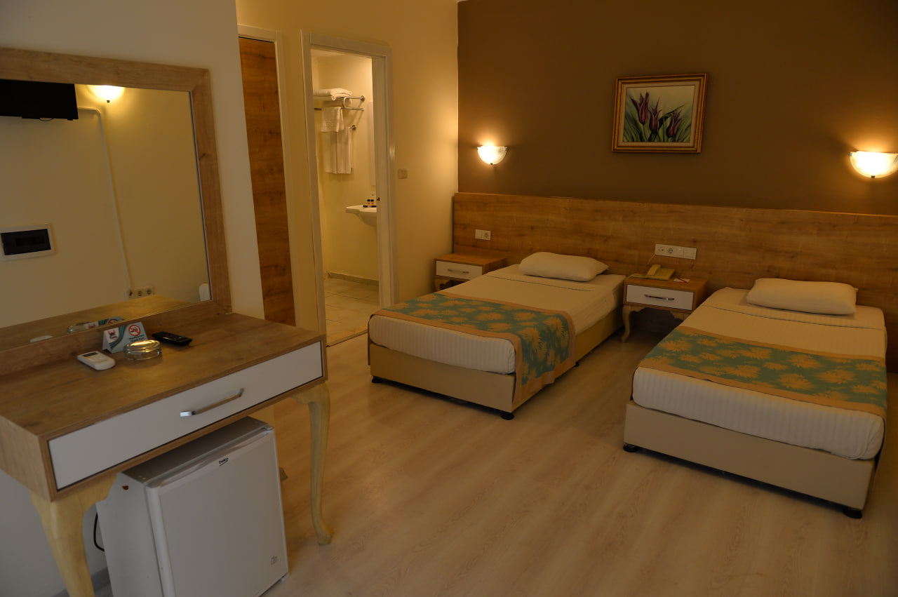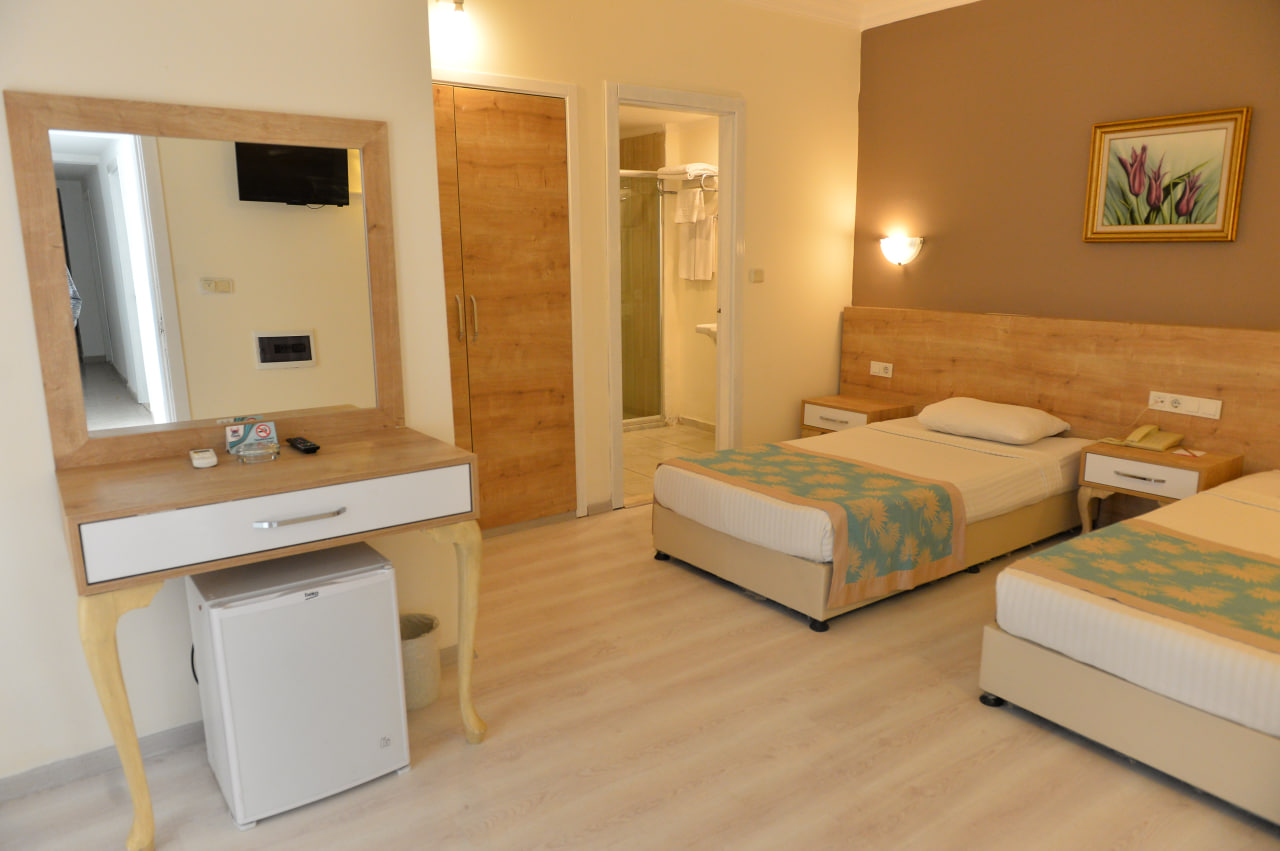 Наш номер 1133 находится в 1 корпусе возле ресепшен, на третьем этаже. Есть большой балкон с видом на соседний отель, горы, дорогу. В нем две кровати полуторки, матрас и подушки удобные, есть прикроватные тумбочки, холодильник, столик с зеркалом и пуфом, плазменный телевизор, кондиционер. Света хватает. Непроницаемых штор нет. Сейфа (платный можно взять, мы не брали, ничего не пропало), телефона и стаканов в номерах нет. Полотенца хорошие. В ванной комнате есть фен (слабый), розетка для электробритвы. Гель для душа, шампунь, мыло ежедневно пополняются. Душевая кабинка квадратная небольшая, если направить дождик на дверцу, то с обратной стороны образуется лужа. В холодильнике 4 поллитровых бутылок с водой, потом можно пополнить в столовой или баре круглосуточно. Уборка и смена белья была один раз, полотенца чаще, мусорку ежедневно. Нам чаще не требовалось, так как в номере были редко. Не включился холодильник, сообщили об этом на ресепшен, пришли превернули его и все. Ремонта мы так и не дождались. Но и хранить в нем нам было нечего, поэтому не особо расстроились (а вот бабушкам, которые по утрам брали горы маслин и сливали в тару мед, наверное, пришлось бы несладко, если это домой, то надо ж где-то хранить). Ремонт в номере хоть и свежий, но некачественный, уборка не идеальная, на балконе не убирались ни разу, берите тапочки лучше с собой.