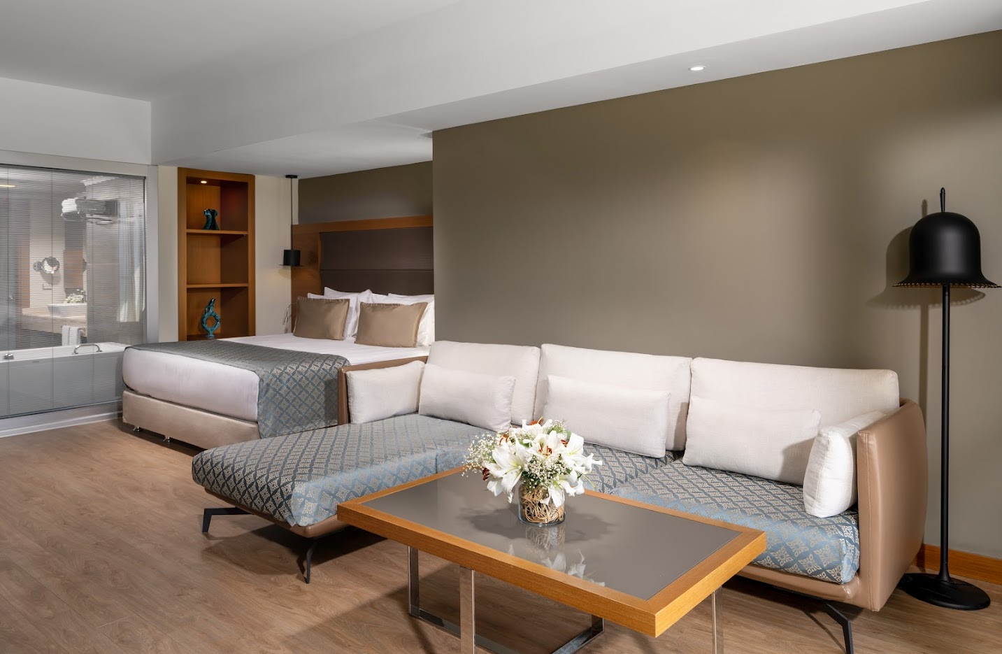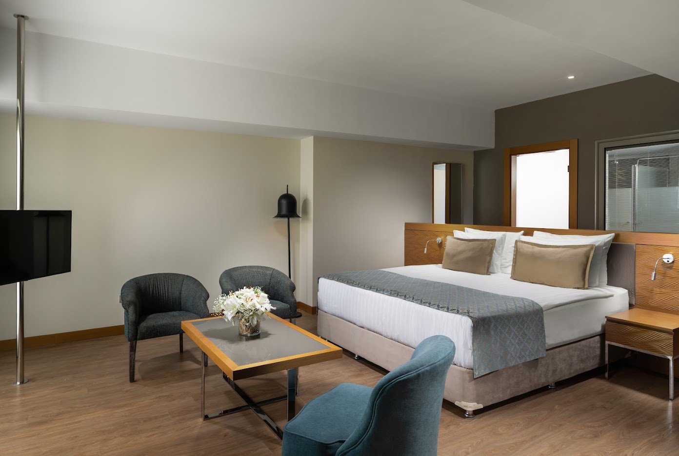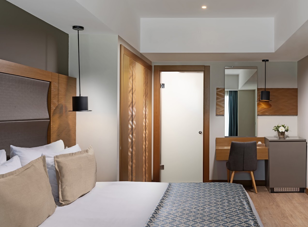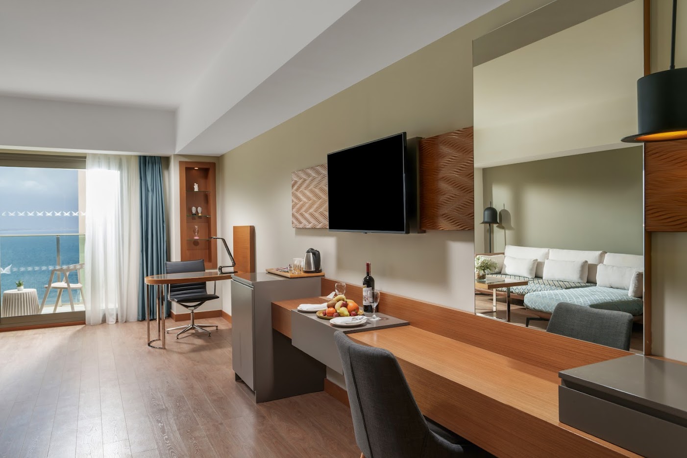 Просторный люкс укомплектован телевизором, кондиционером, телефоном, сейфом, мини-баром, феном, тапочками, халатами, гостиничной косметикой, набором для приготовления чая/кофе, Wi-Fi. Гости размещаются на двуспальной кровати, есть зона отдыха, рабочее место, ванная комната с душем и/или ванной/джакузи, балкон с боковым видом на море.