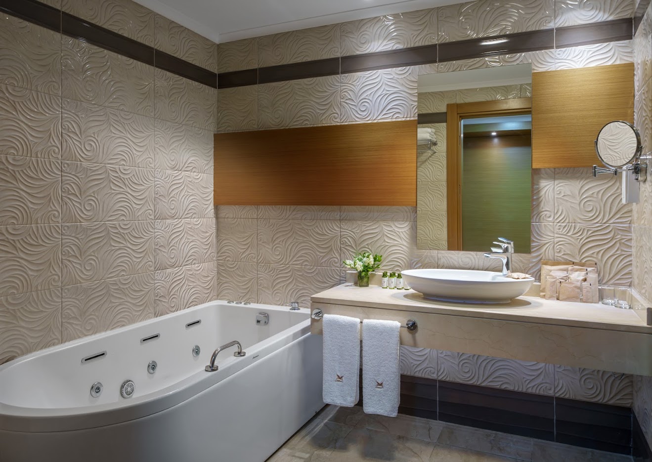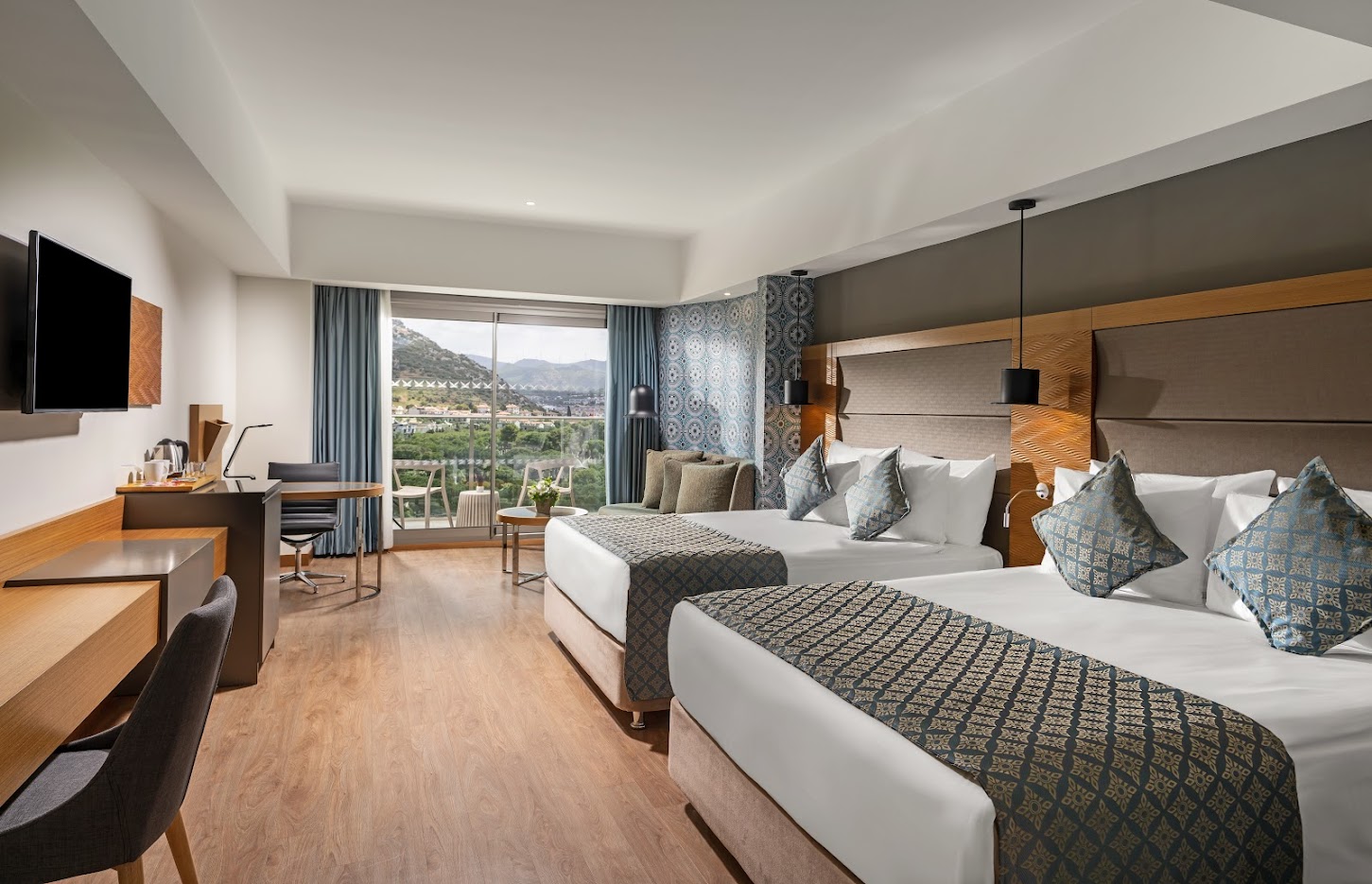Однокомнатный номер укомплектован 2 двуспальными кроватями, ванной комнатой с душем и/или ванной/джакузи, балконом с боковым видом на море. Среди удобств Wi-Fi, кондиционер, телевизор, телефон, мини-бар, сейф, чайный набор, фен, тапочки, халаты, набор гостиничной косметики.
