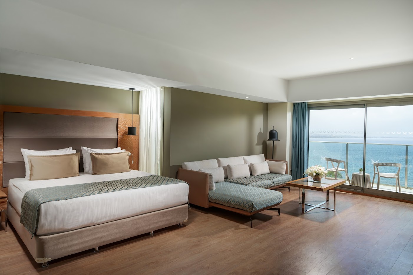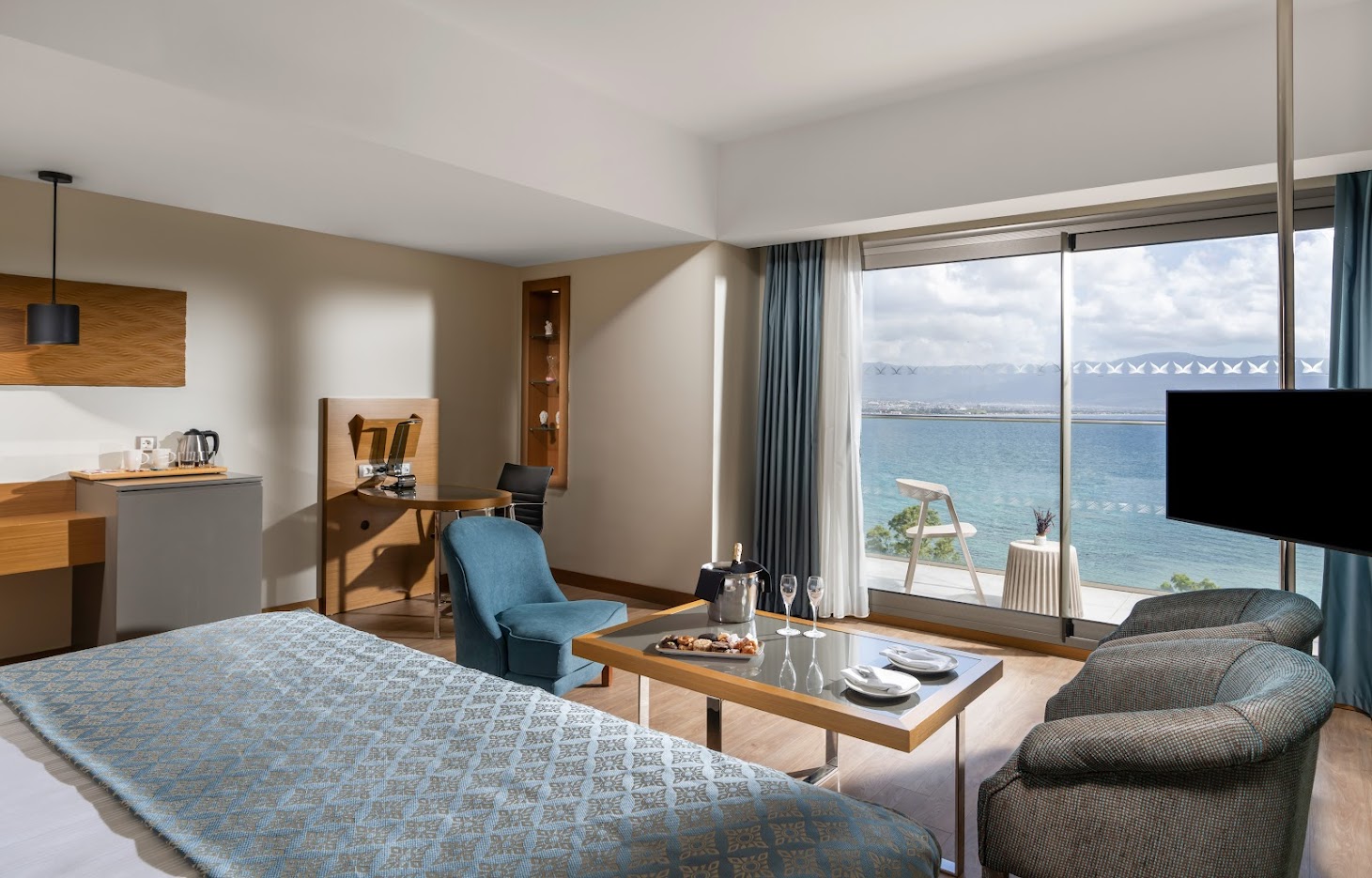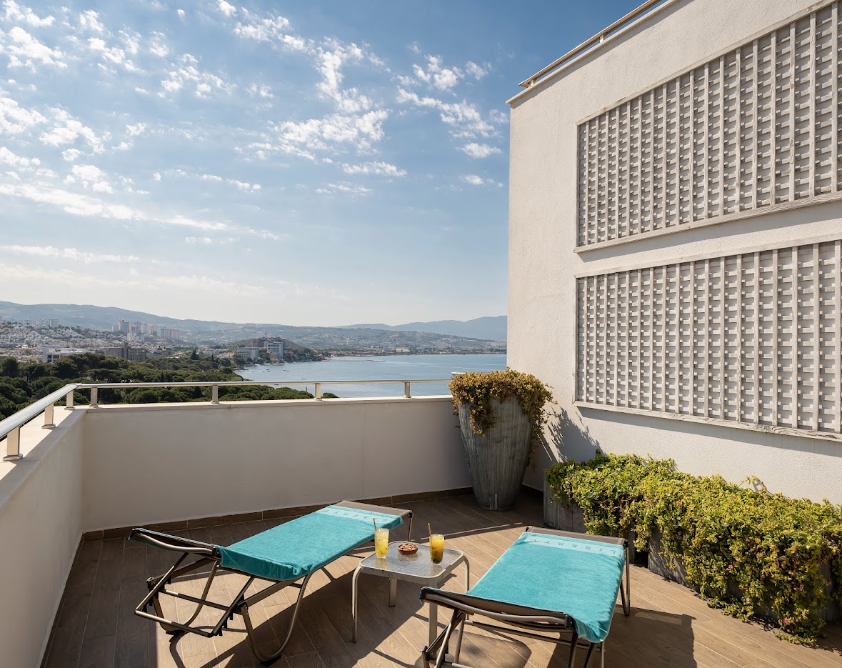 Комфортабельный люкс оснащен балконом, мини-баром, кондиционером, телевизором, сейфом, телефоном, набором для приготовления чая и кофе, Wi-Fi. Гости размещаются на 1 двуспальной кровати. В ванной комнате душ и/или ванна/джакузи, туалетные принадлежности, фен, тапочки и халаты. Из номера открывается вид на море.