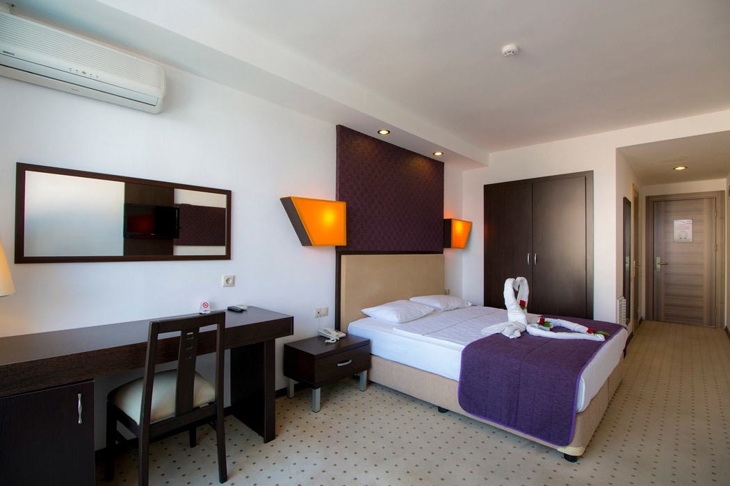 Комнаты маленькие и без кондиционера не обойтись: отсюда - бронхит. Питание для турков, есть нечего. Каждый день однообразие. И часто слышно "finish" - более-менее съедобное закончилось. Одна столовка на много корпусов и не хватает места. Стулья и столы пластиковые и не всегда чистые. Курят везде!!!!!!!!!!!!!!!!!!!!!!!!!!! Турки, наверное, рождаются с сигаретами. Анимации нет. На пляже выделены только 3 ряда зонтов, на которые без слез не посмотришь. Лежаки почти все с дефектами и грязные! Их не чистят от песка. Окурки и прочий мусор в пределах пляжа не убираются. От отеля около 350 метров до пляжа. Почему-то нет звезд на входе отеля, наверное, улетели
