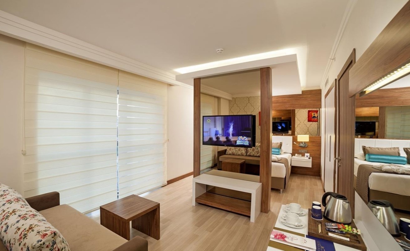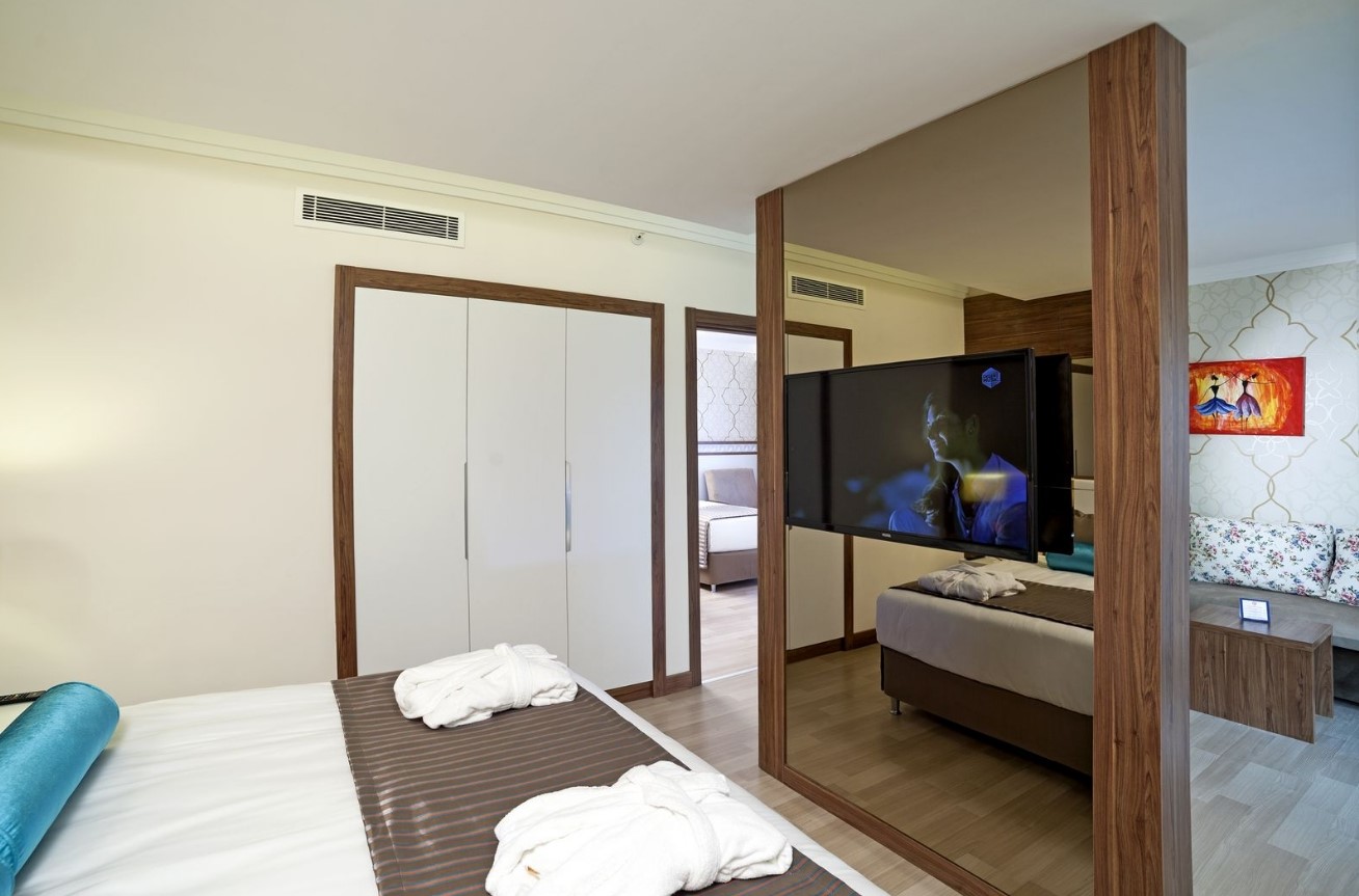 Недостаточно лежаков в бассейне. Вещь говорит только на немецком или русском. Они плохо понимают английский. Вода в душе закончилась через три дня после обеда. И вдруг, когда принимаешь душ, воды нет. Много шума снаружи от музыки и шоу. Если у вас есть дети будет трудно спать с этим шумом. Некоторые из сотрудников в приемной высокомерны, хотя не все. Еда хорошая, и у вас есть много блюд на выбор. Хорошие закуски на пляже. Очень хорошее мороженое на выбор. В комнате нет утюга. Кондиционер останавливается, как только вы открываете балкон.