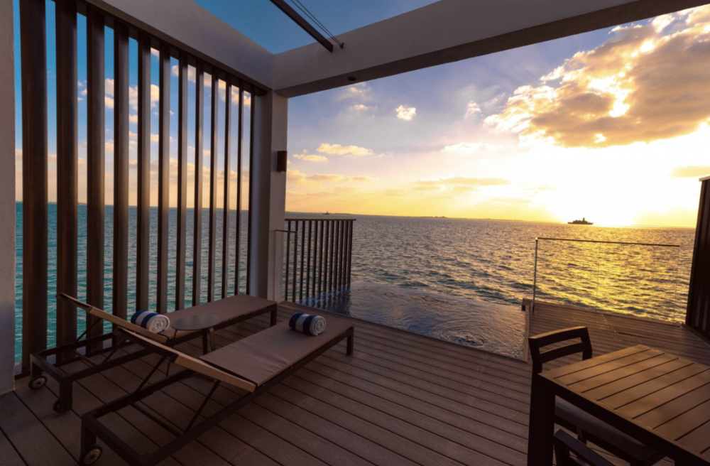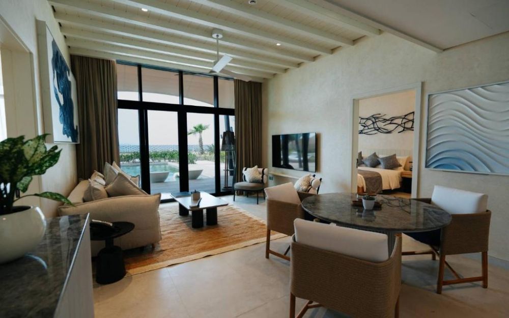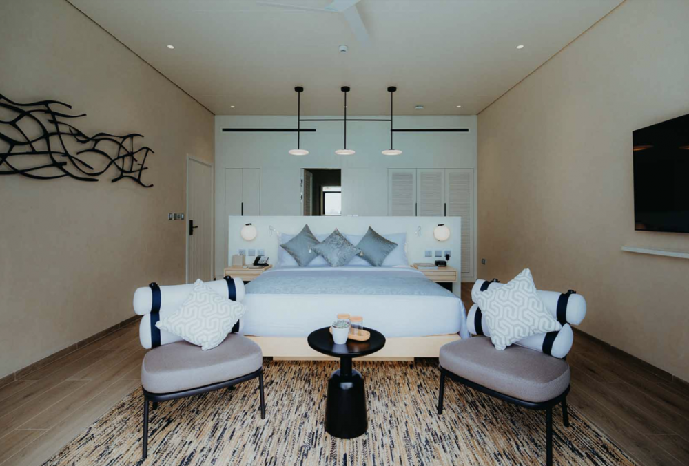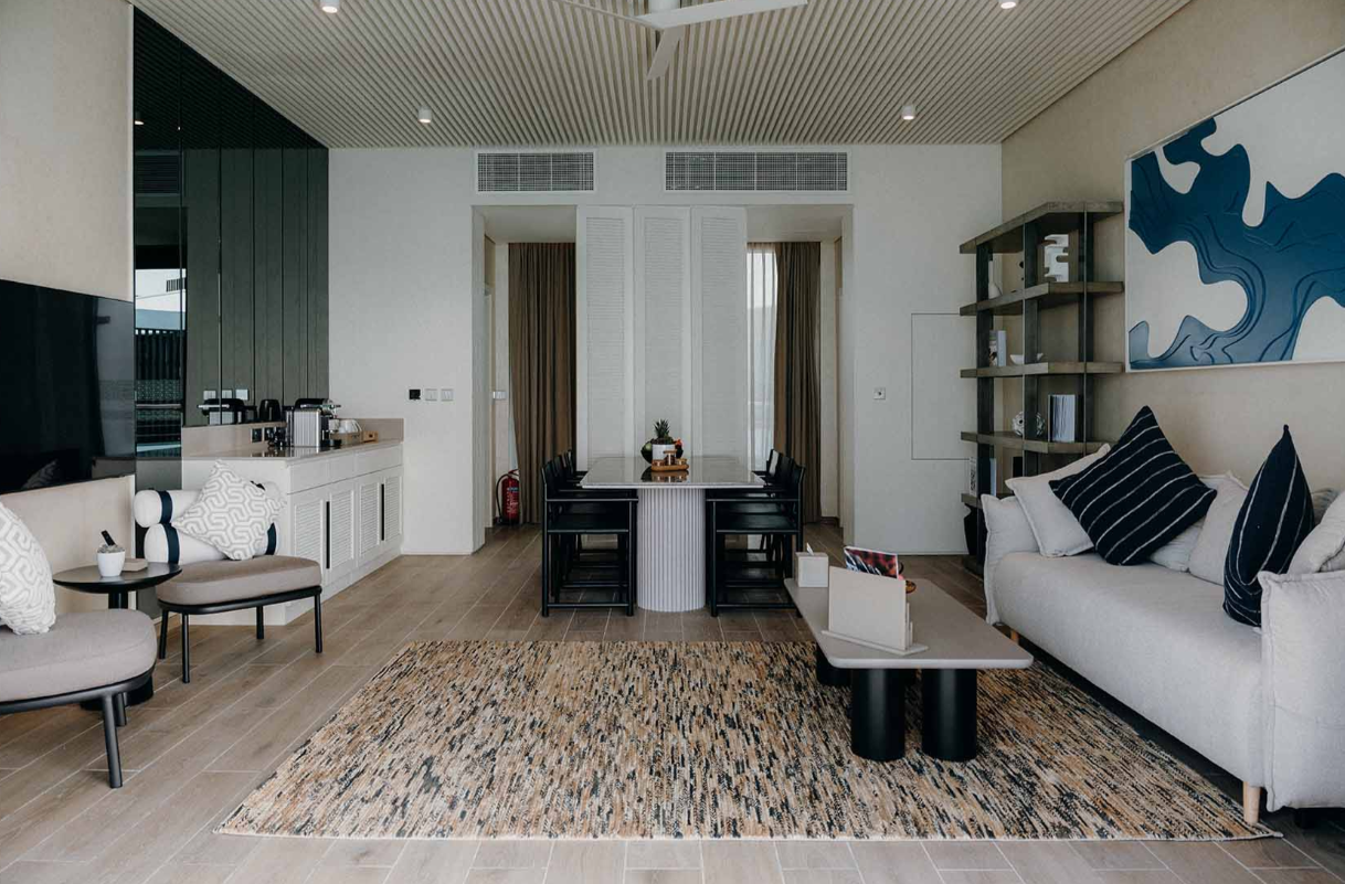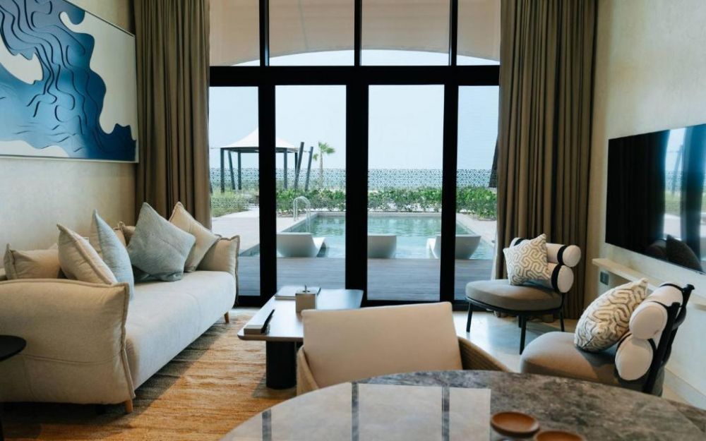 В номере есть две спальни, оборудованная гостиная, ванная комната с душем и ванной, терраса с бассейном. В удобства включены мини-бар, беспроводной Интернет, кондиционер, телевизор, телефон, чайный набор, косметические наборы, фен, халаты, тапочки. В главной спальне установлена двуспальная кровать, во второй комнате — 2 односпальные кровати.