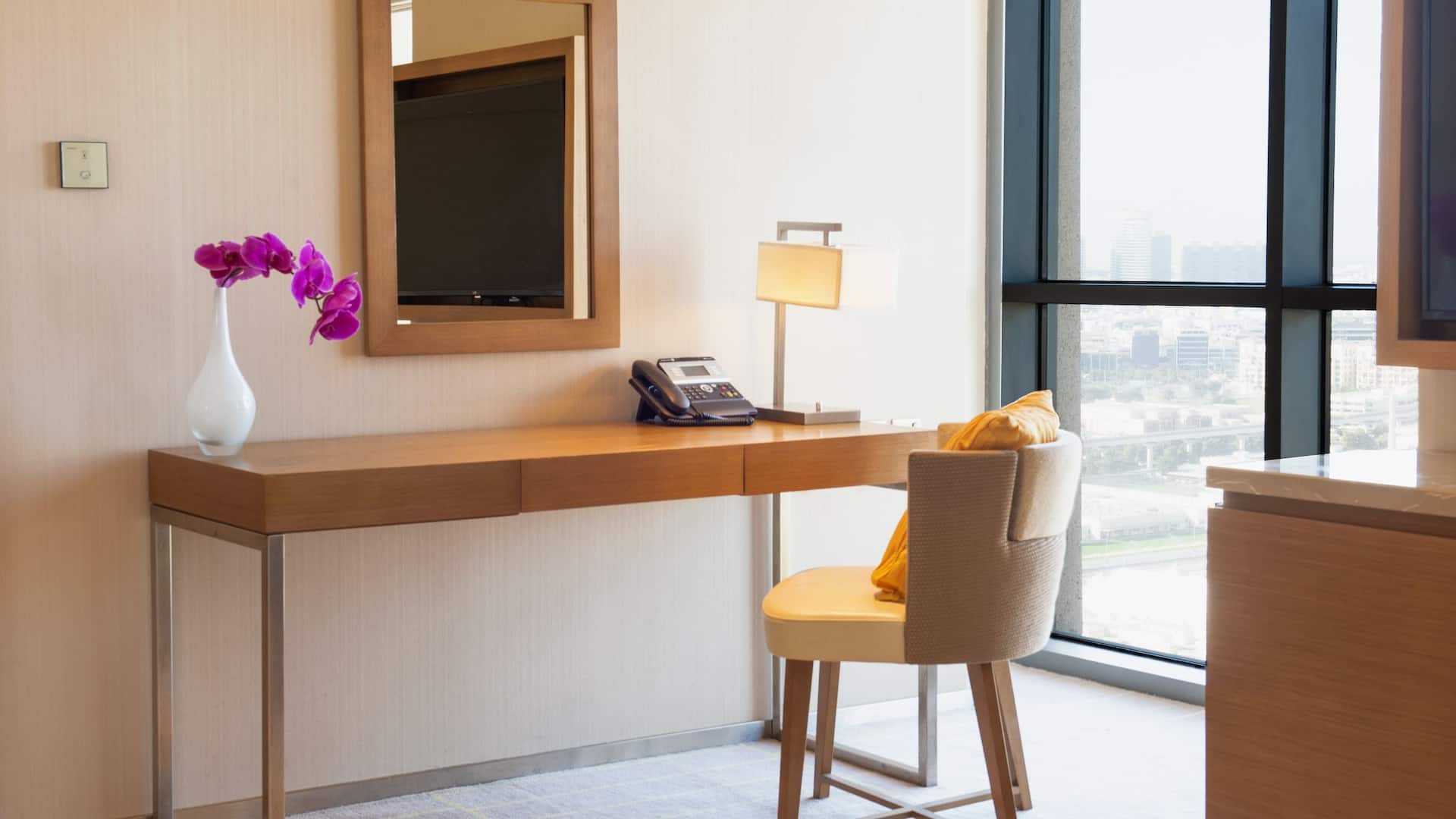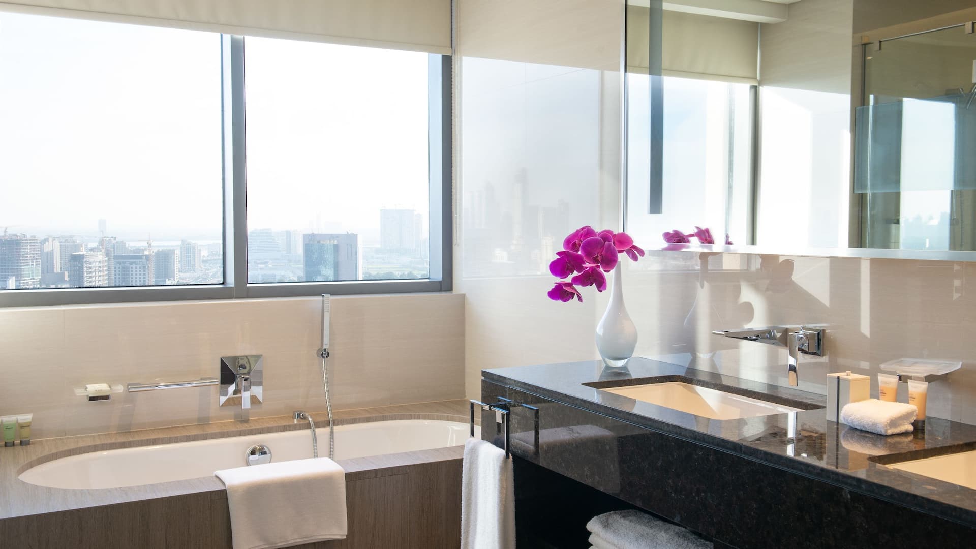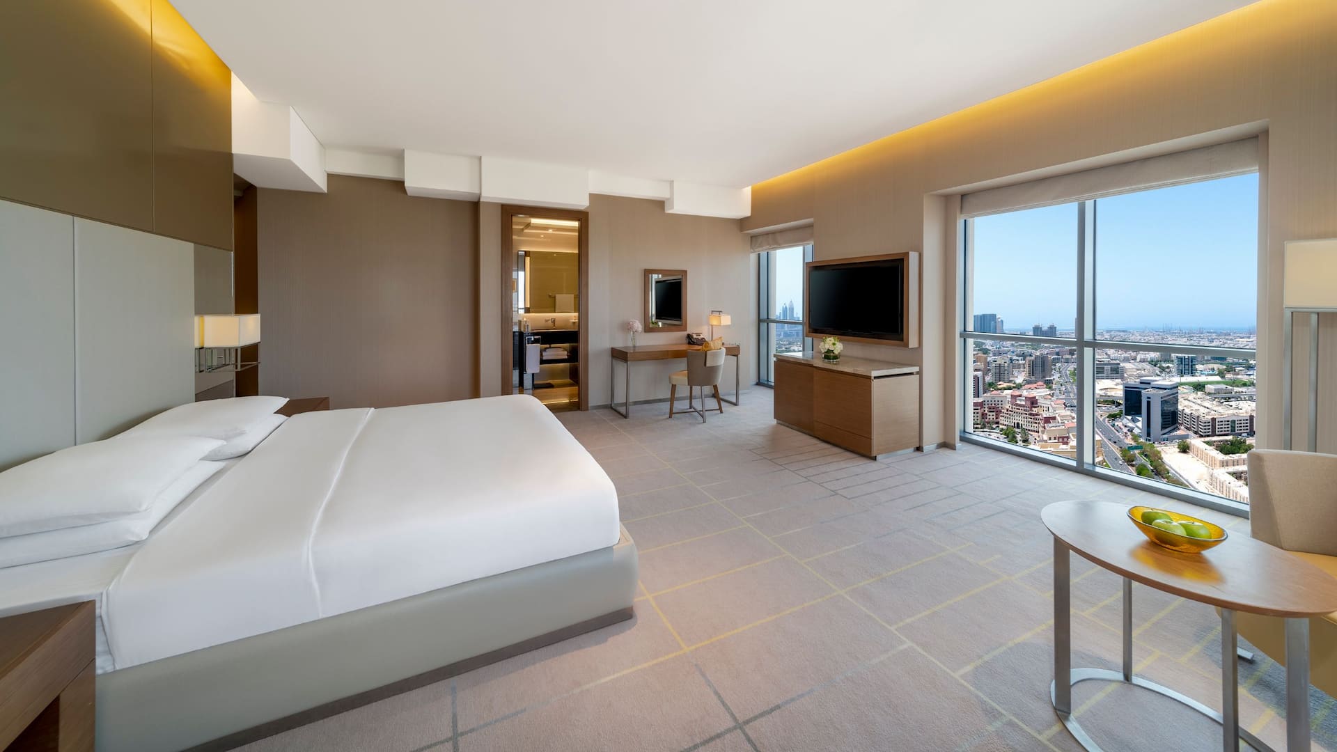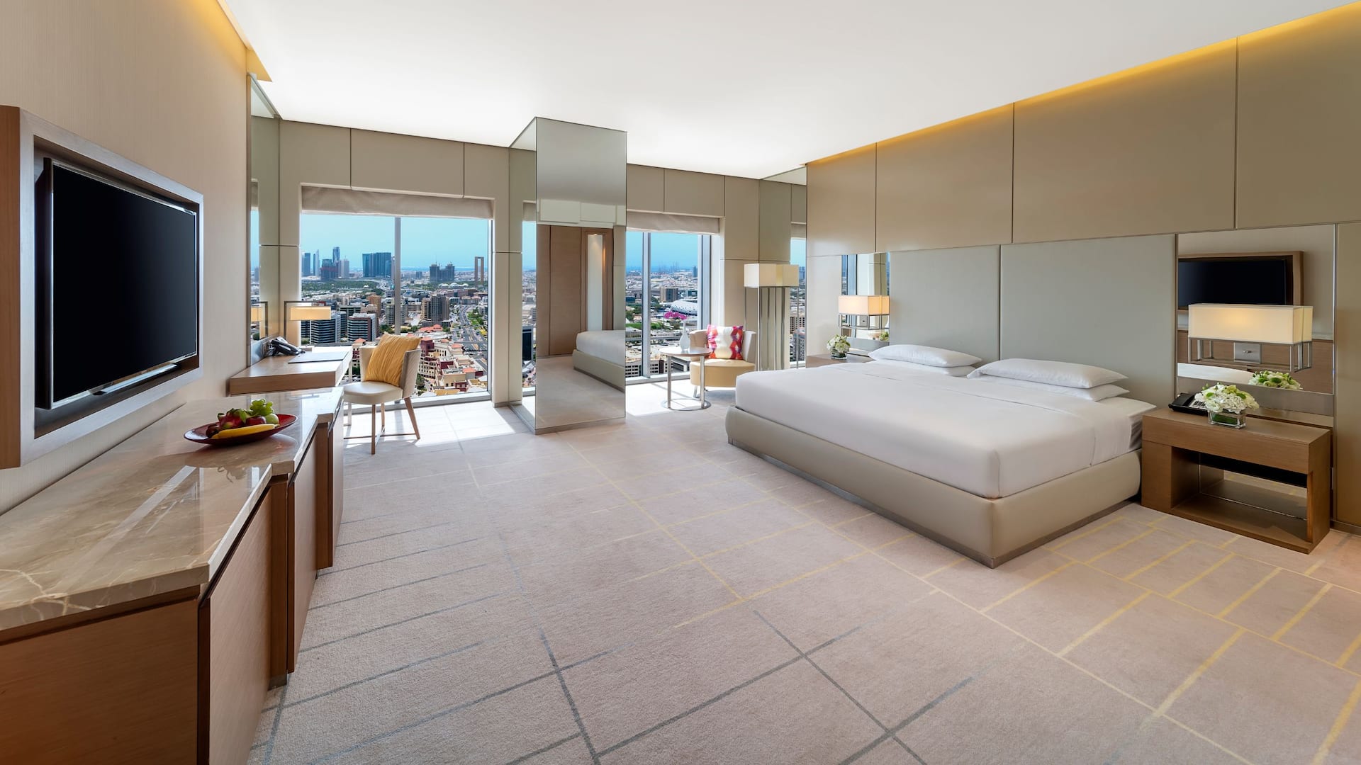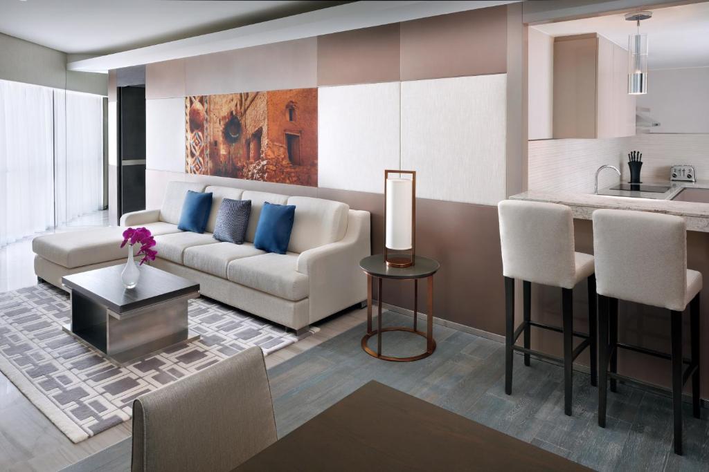 Двухкомнатный номер включает спальню, гостиную, мини-кухню, обеденную зону, ванную комнату с душем и/или ванной. К услугам гостей двуспальная кровать king-size, телевизор, сейф, телефон, гладильные принадлежности, чайник, кофеварка. Из окон открывается вид на город или залив Дубай-Крик.