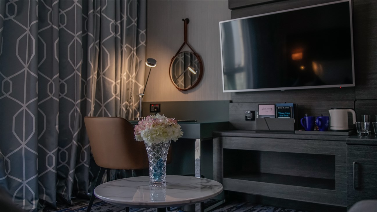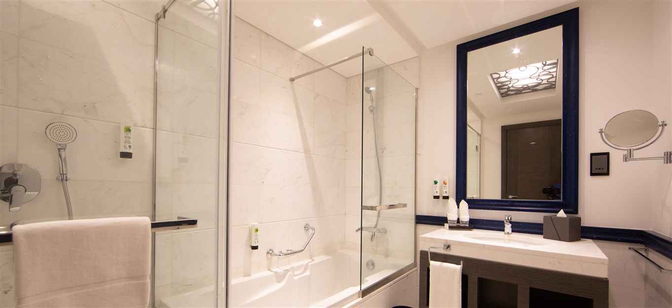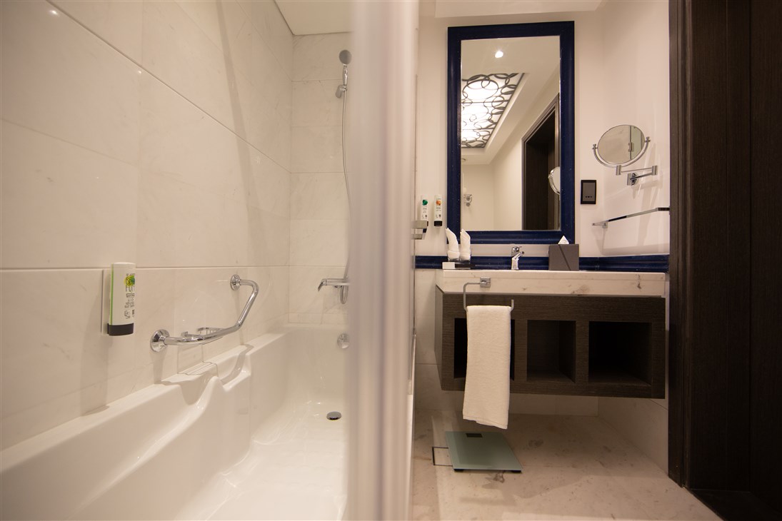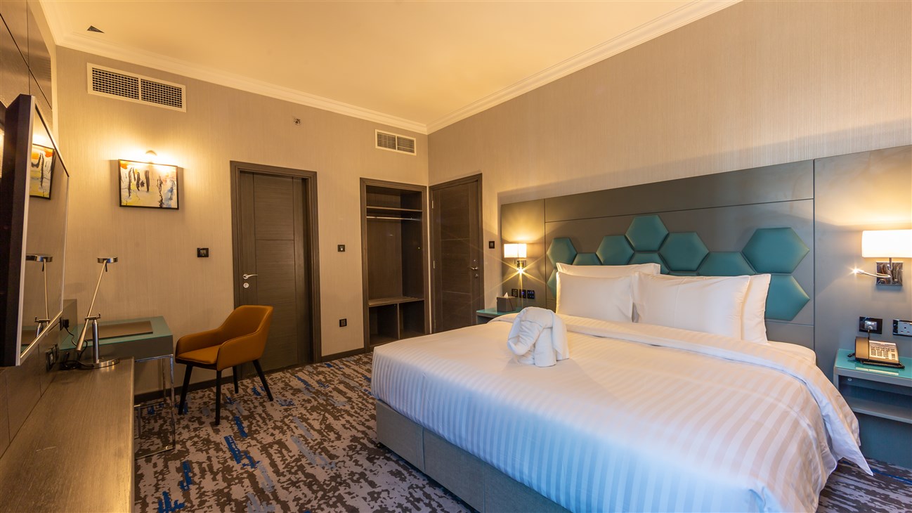 Комплектация номера включает двуспальную кровать king-size, кондиционер, телевизор, телефон, мини-бар. В числе прочих удобств Wi-Fi, набор для приготовления чая и кофе, туалетно-косметические принадлежности. Ванная комната с душем и ванной.