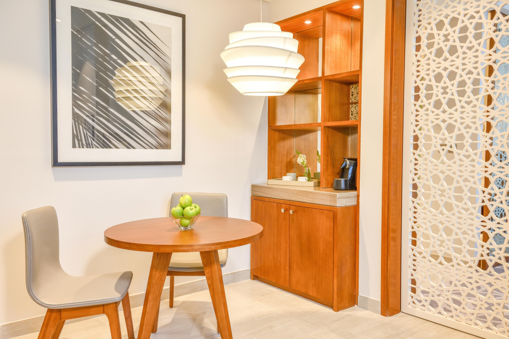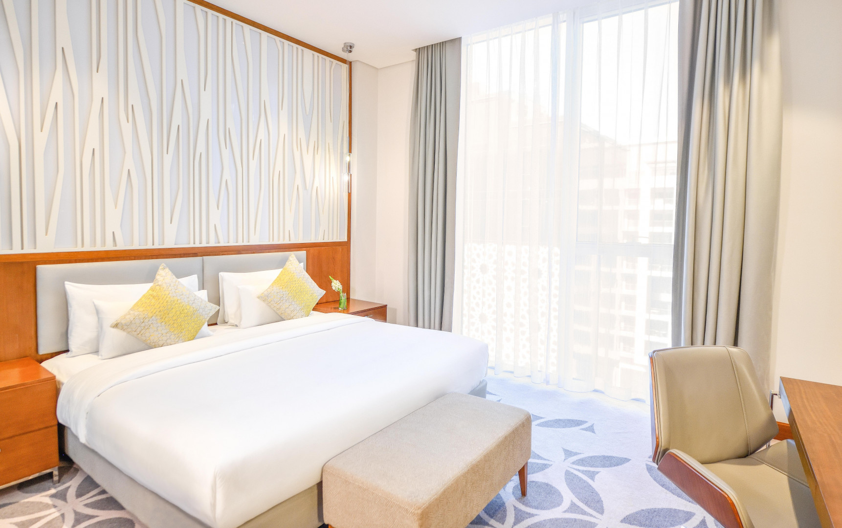 Люкс с отдельной гостиной зоной с мягкой мебелью, телевизором и мини-баром, спальней с двуспальной кроватью размера king-size и ванной комнатой с душем или ванной. В числе прочих удобств в номере: Wi-Fi, кондиционер, сейф, телефон, набор для приготовления чая/кофе, фен для волос и наборы гостиничных принадлежностей.