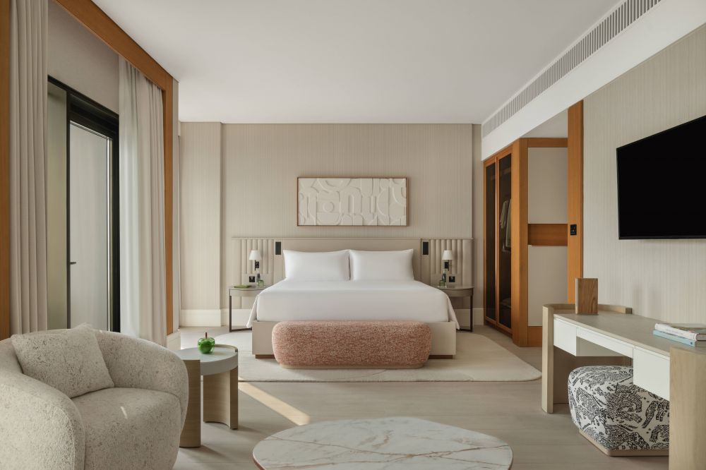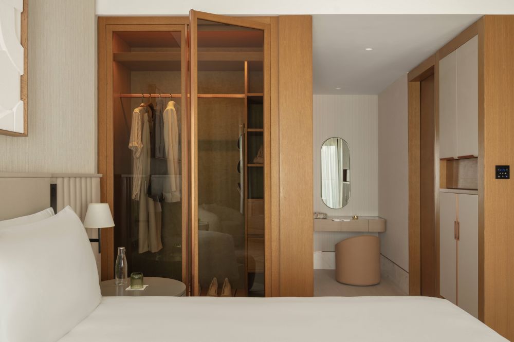 В люксе спальня, меблированная гостиная, ванная комната с душем/ванной. В удобства включены кондиционер, телевизор, телефон, мини-бар, сейф, фен, гигиенические принадлежности и чайно-кофейный набор, халаты, тапочки. Гости размещаются на двуспальной кровати.