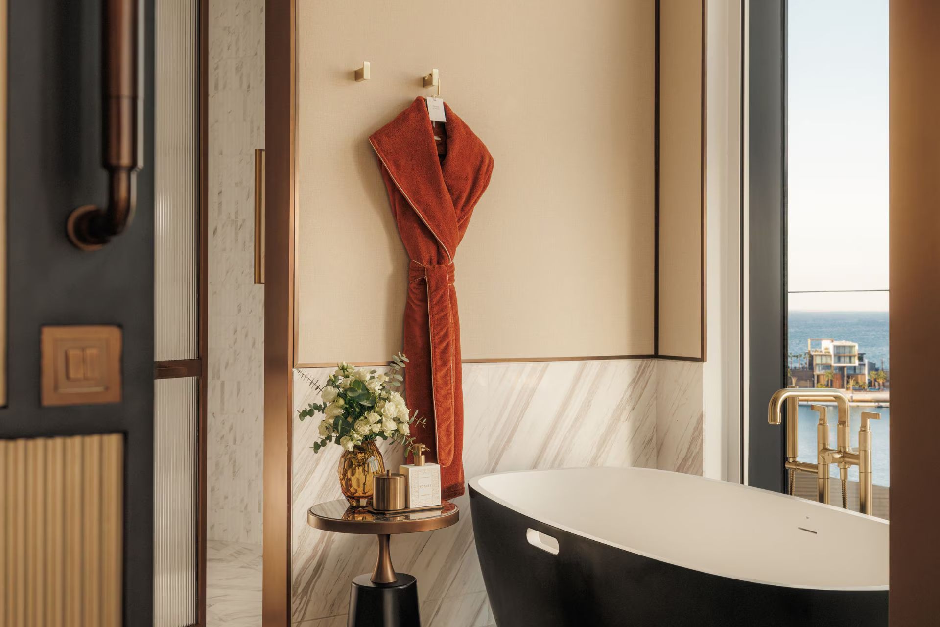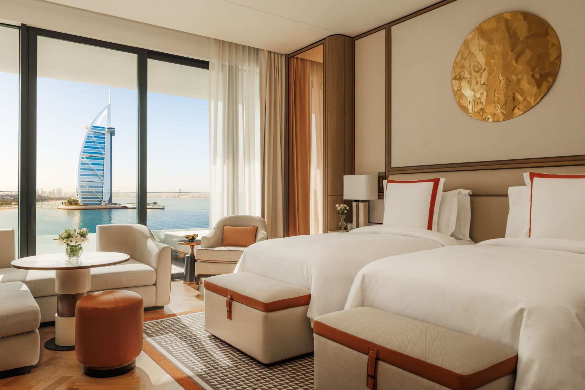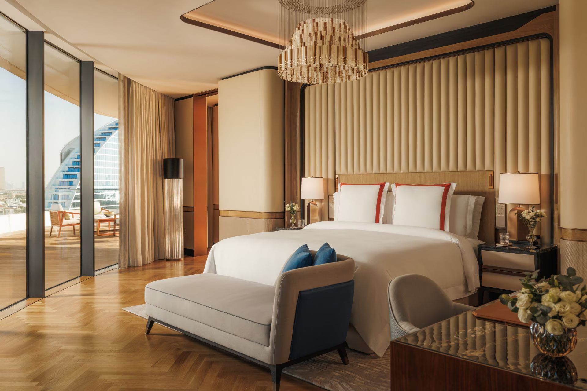 Делюкс с видом на Персидский залив, Burj Al Arab оснащен беспроводным интернетом, мини-баром, телевизором, кофемашиной Nespresso, чайно-кофейным набором, аудиоаппаратурой Bang & Olufsen. Гости размещаются на двуспальной кровати/двух односпальных кроватях, есть зона отдыха, терраса. В ванной комнате тропический душ и ванная, туалетные принадлежности, фен, тапочки и халаты.