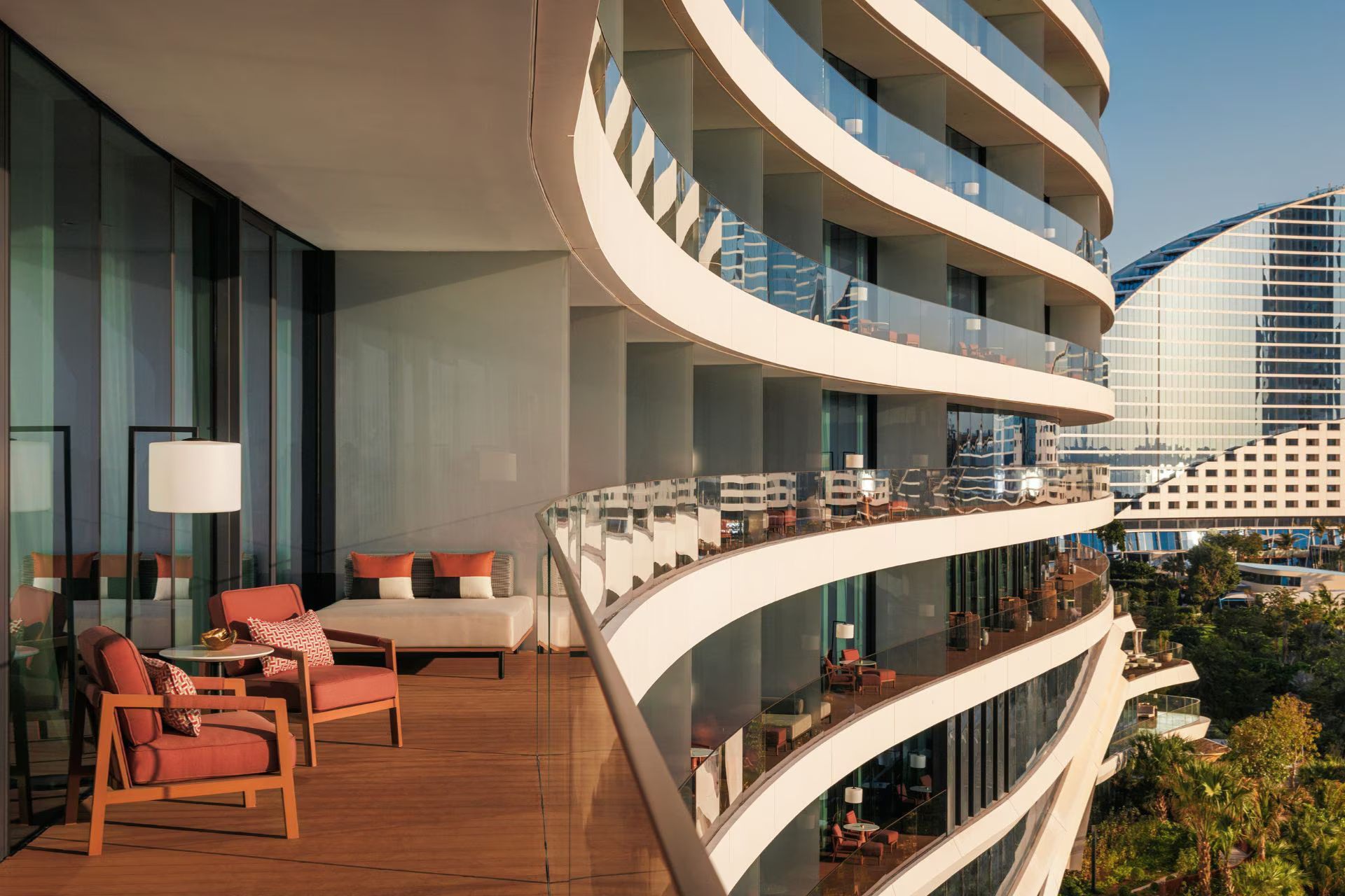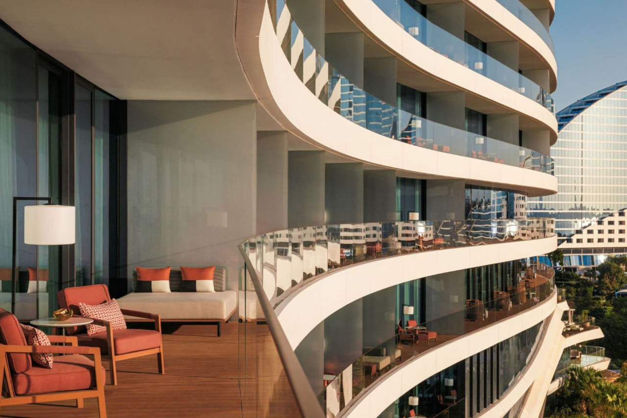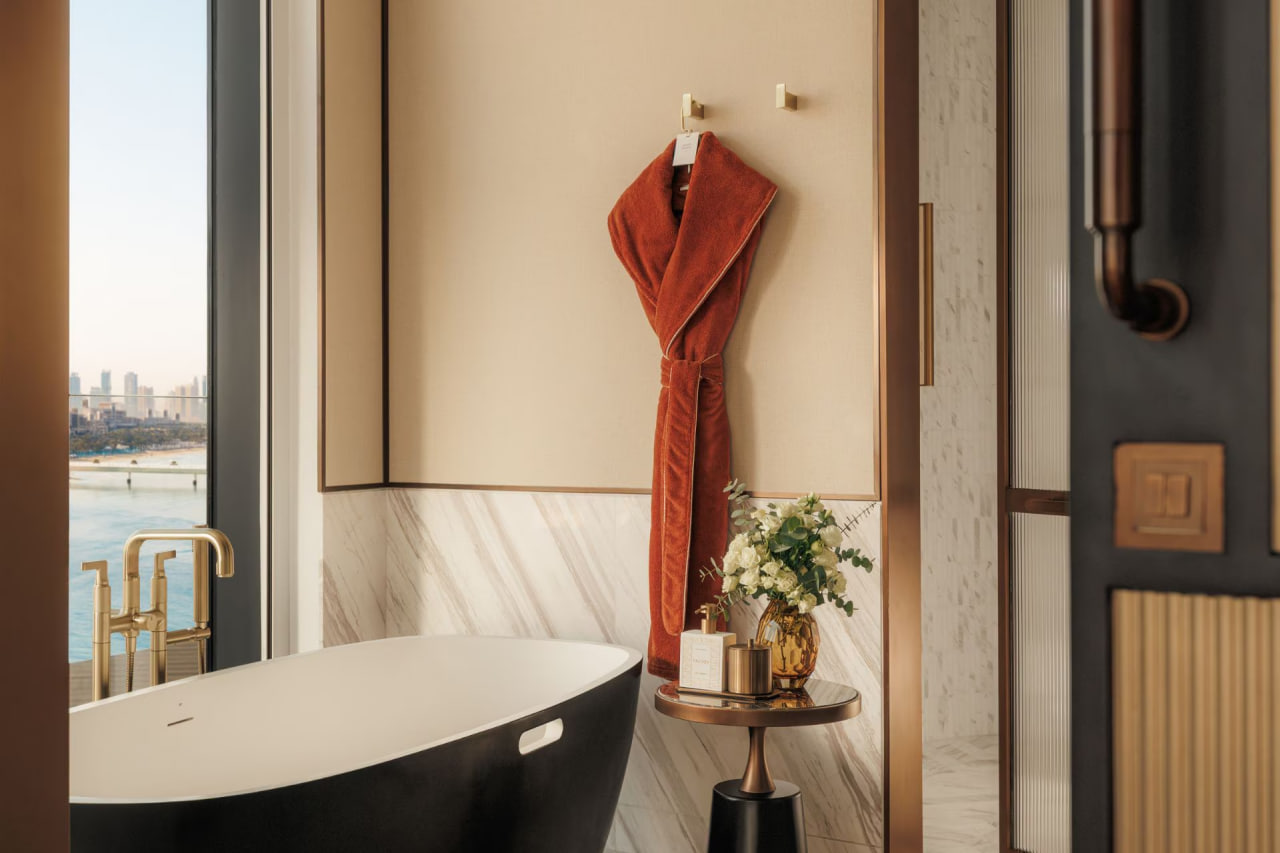 Номер оформлен в современном стиле, есть просторная меблированная терраса с панорамным видом на пристань для яхт и Burj Al Arab, собственной ванная комната с душем и ванной, гардеробная комната, спальня с двуспальной кроватью, зоной отдыха с диваном. Из удобств телевизор, Wi-Fi, кофемашина, мини-бар, фен, халаты, тапочки, гигиенические принадлежности, панорамные окна, услуги батлера.