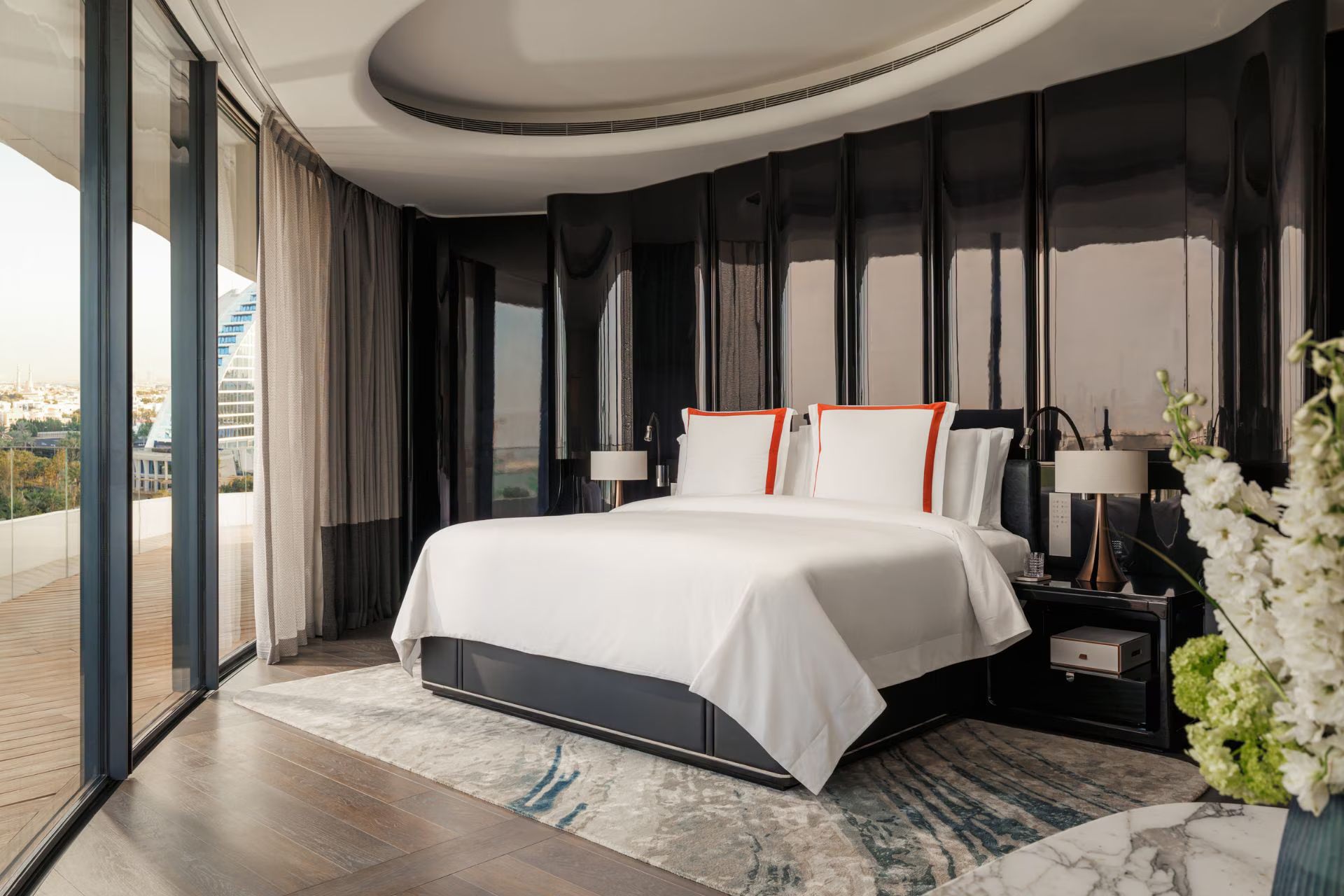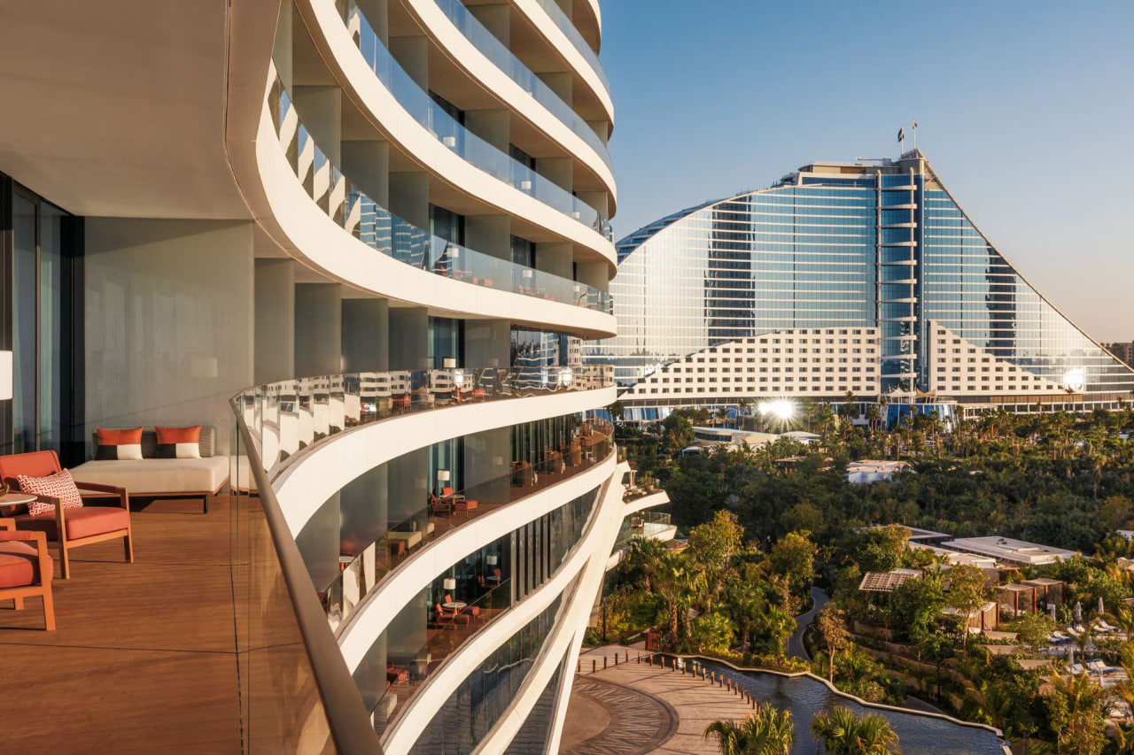 Однокомнатный номер с меблированной террасой, видом на Burj Al Arab, Персидский залив. В комплектации двуспальная кровать, диван-кровать, аудиоаппаратура Bang & Olufsen, Wi-Fi, телевизор, мини-бар, кофемашина, набор для приготовления чая и кофе. Ванная комната с тропическим душем и ванной, предоставляется фен, халаты, тапочки и набор гостиничной косметики.