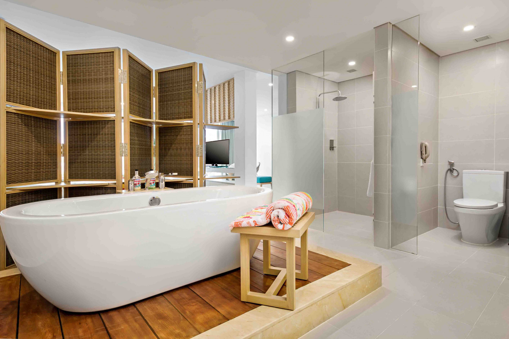 Просторный люкс с балконом с видом на сад и зоной гостиной. В комплектации двуспальная кровать, кондиционер, телевизор, телефон, мини-бар, сейф, чайник. Ванная комната с душем, ванной, предоставляется фен, набор гостиничной косметики, халаты и тапочки.