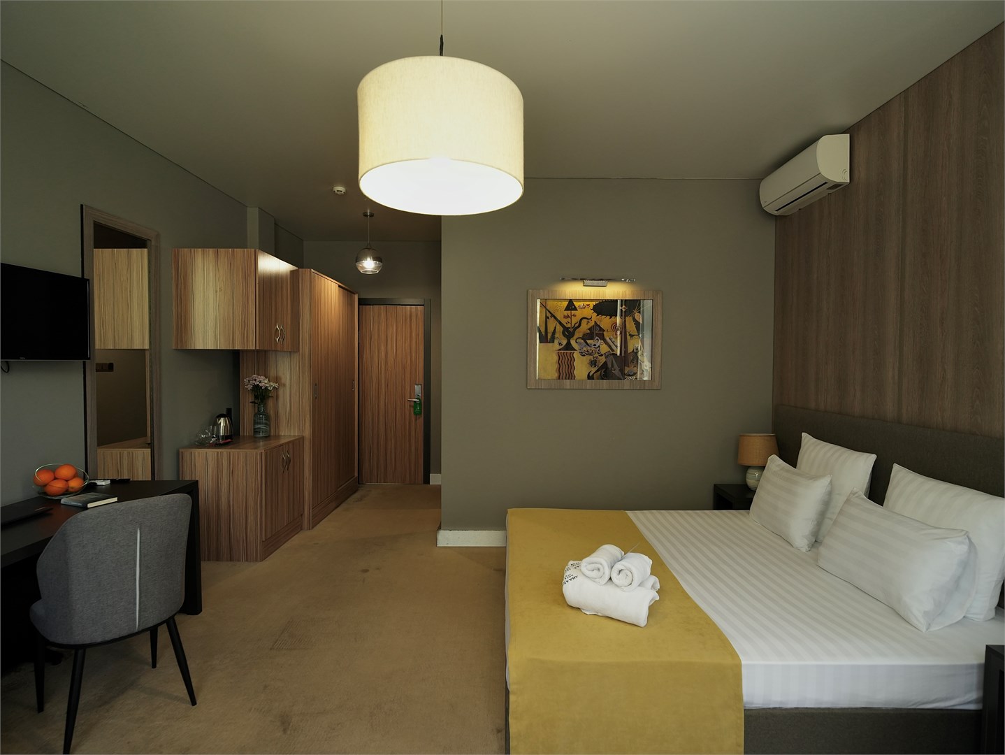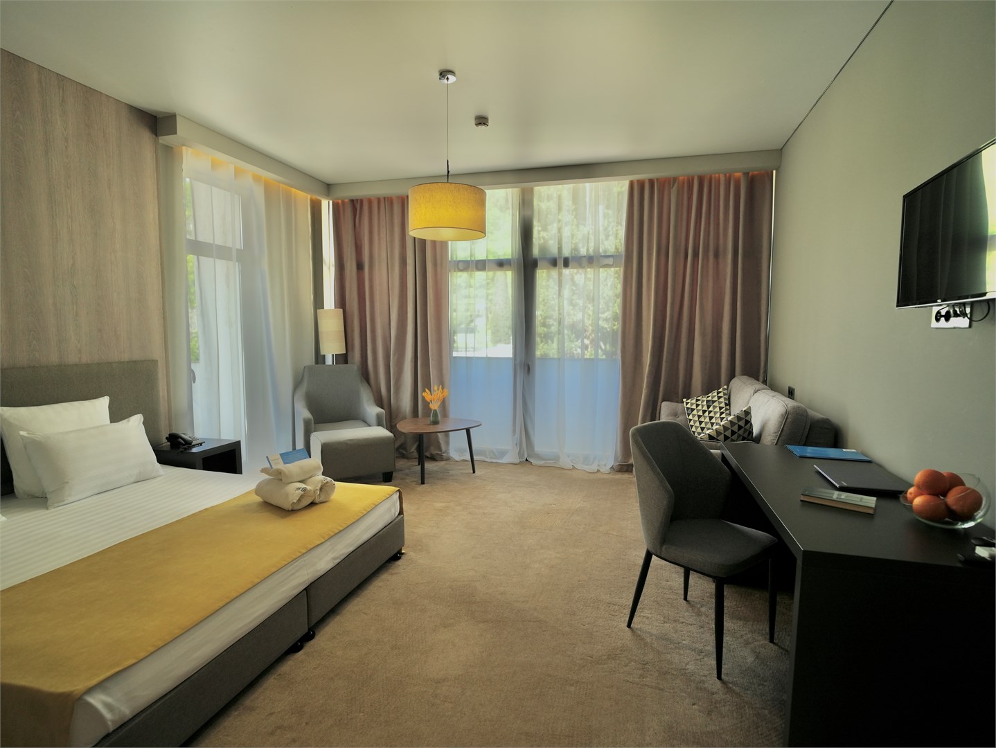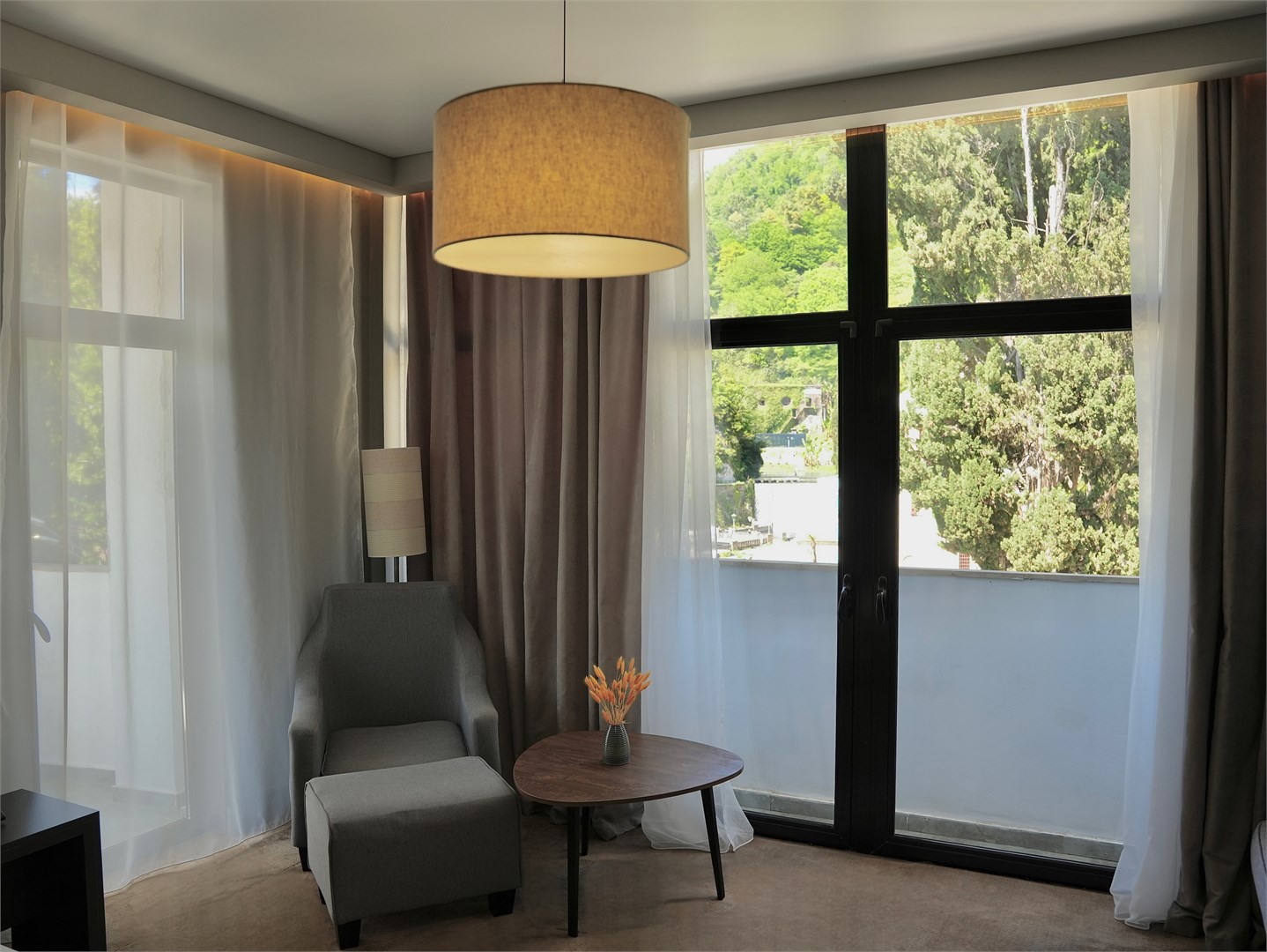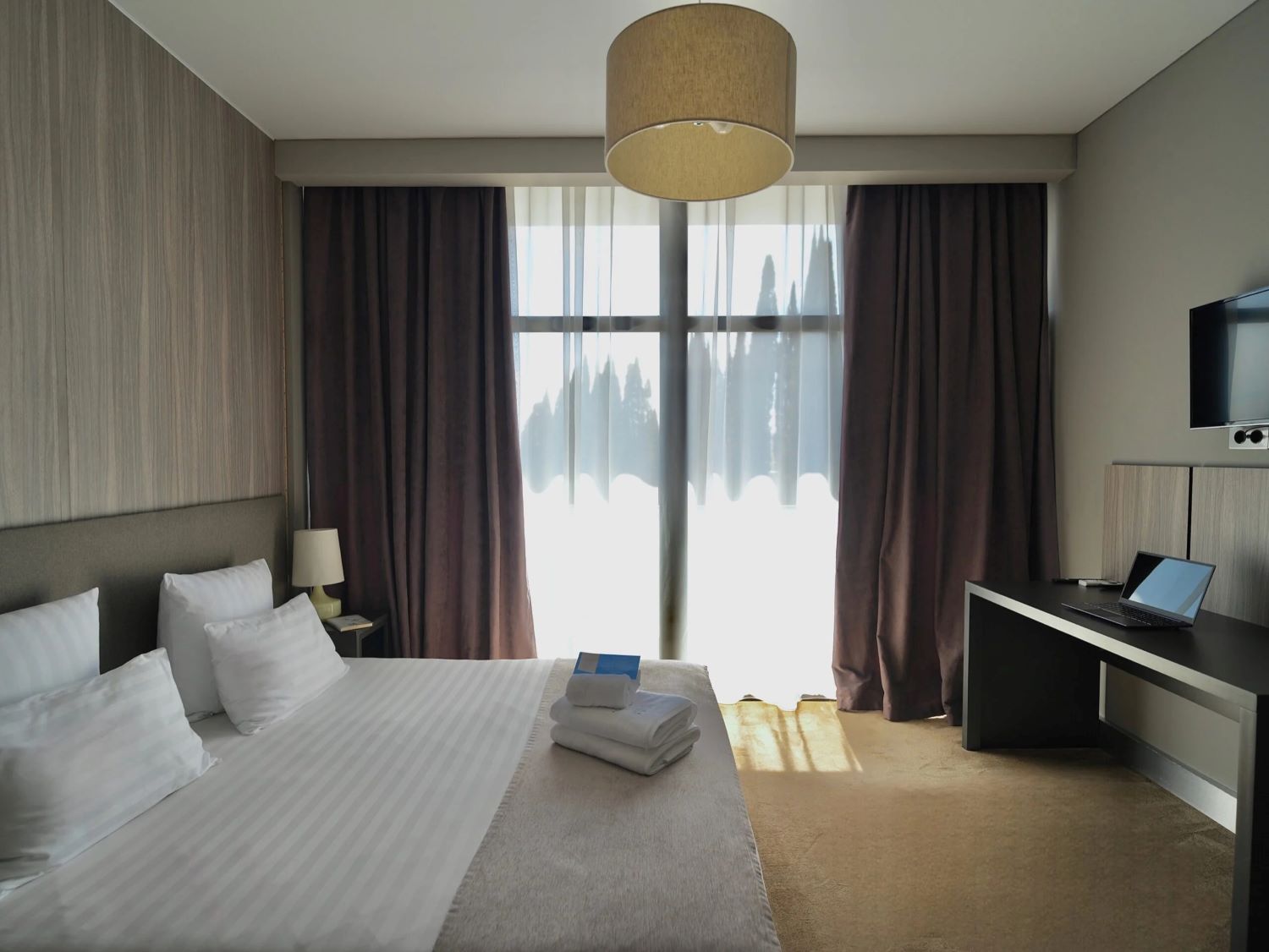 Отель приятный.Внутри чисто.Стоянка машин под открытым небом,разве что тень от деревьев поможет и в середине дня проблема найти место.Так же тут большой подъем, а там щебень, машины залетают на это горку с "буксами" из-за чего летит щебенка во все стороны, у кого машина стоит близко к этому подъему может и прилететь щебнем.Холл и ресепшен красивый, прохладный. Персонал приятный, доьрый и отзывчивый.Я ниже поставил машину и оплатил стоянку, она платная 200р сутки. Сам номер(делюкс) отличный.Кондиционер, балкон.Чистый.Света много как искусственного так и из окна.Ванная большая есть фен.НО не работал вытяжка(кондеенсат долго стоит запахи) нет освежителя. Но при этом, я не нашел в ванной места где есть плесень, мокриц и тд. Воду в номер НЕ ПРИНОСЯТ.Интернет стабильный и шустрый.Везде кавролин.Есть доска и утюг на этаже.Есть танометр.Ночью тут совсем не шумят.Тихо и хорошо.Птицы больше шумят))))По кондиционеру, кому важно, внешний блок его стоит на балконе и дует весь жар прямо на балкон.Посидеть ночью с бокалом вина не получится, упреете и шумный он.Но его не слышно в номере сильно если закрыть дверь на балконе. Еда: Кормят хорощо, вкусно.Стол для выбора еды небольшой, но его хватило(2 горячих, 2 гарнира, 1 суп, овощи, 1 салат, напитки 4 вида, фрукты, дисерты 2вид).Заставка постоянно одну музыку гоняет и картинки одни и те же.В общем отель на 4ку.